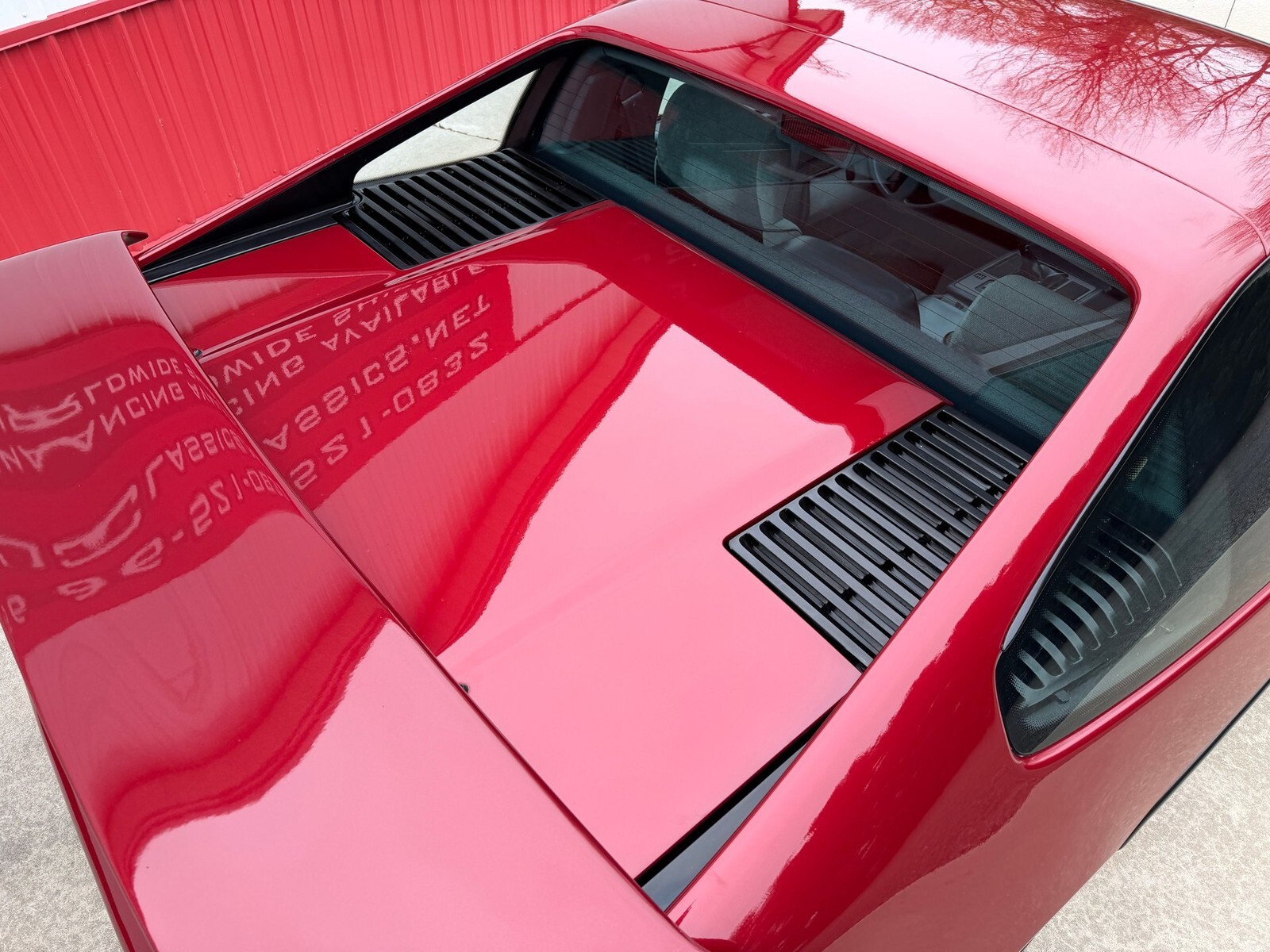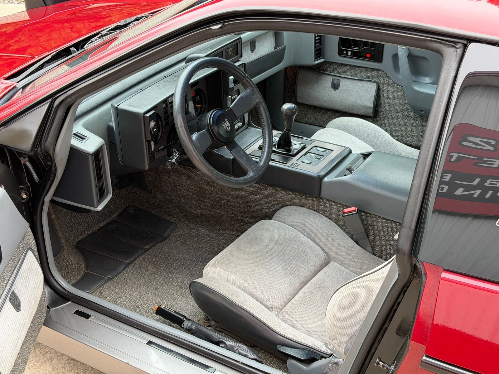 Finished in Medium Red Metallic, the car retains its factory shine and signature Aero Package, which includes the GT-specific ground effects and integrated rear fascia. A rear spoiler, 15-inch basketweave wheels with 215/60R15 tires, and pop-up headlights complete the unmistakable 1980s performance look. Because the Fiero body is constructed from fiberglass/composite rust-free panels, it has stayed exceptionally clean and solid over the years.