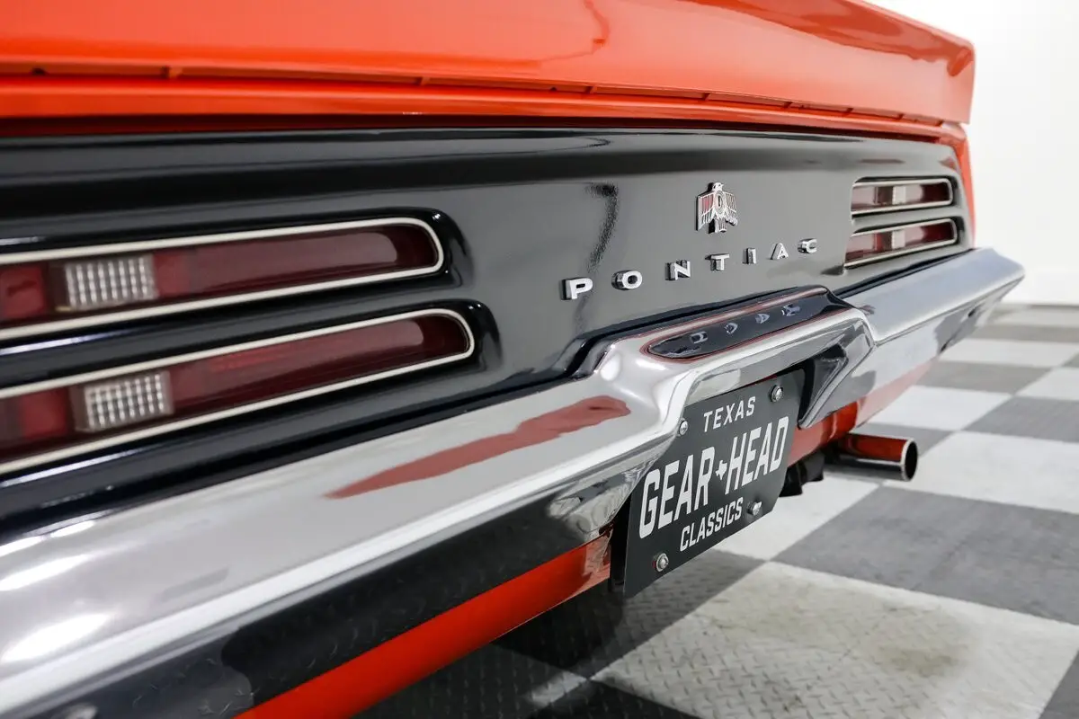 Inside, the white bucket seat interior with a center console delivers a clean and sporty look that pops against the orange paint. The dash is pure late-'60s Pontiac, straightforward and ready to rock, and the cabin feels every bit as driver-focused as it should.