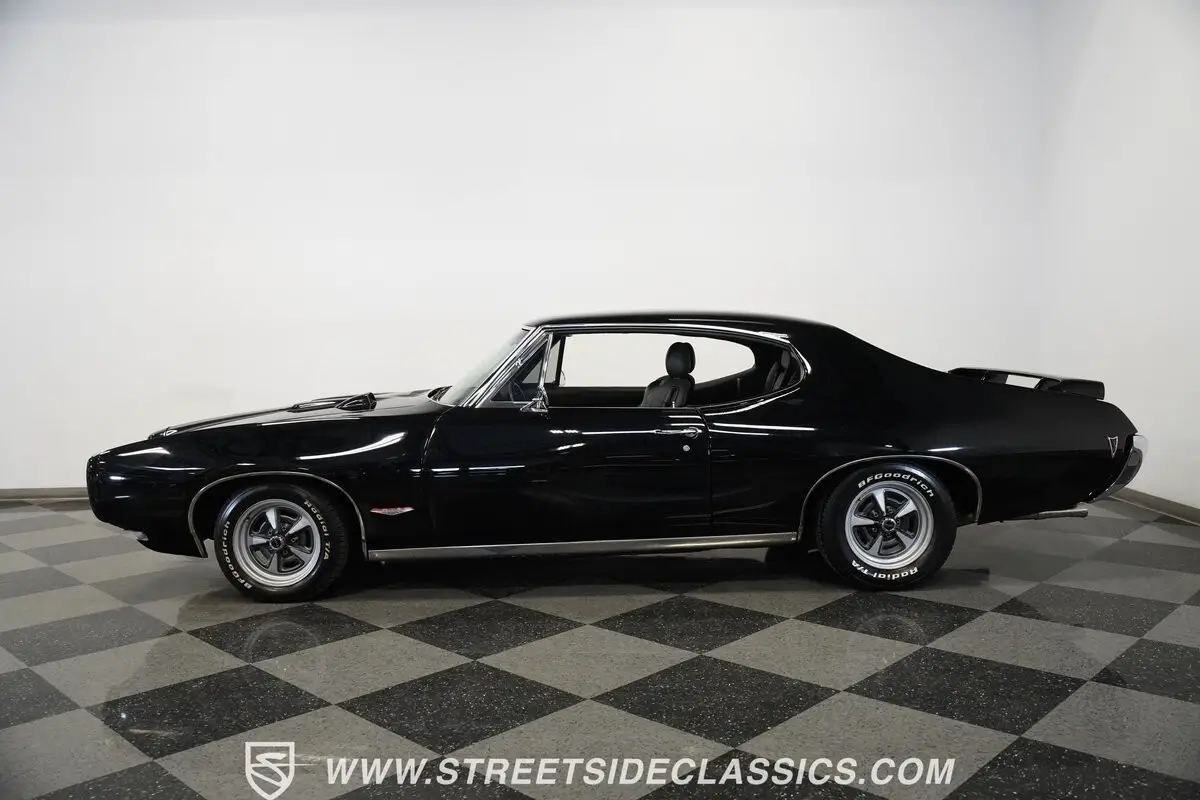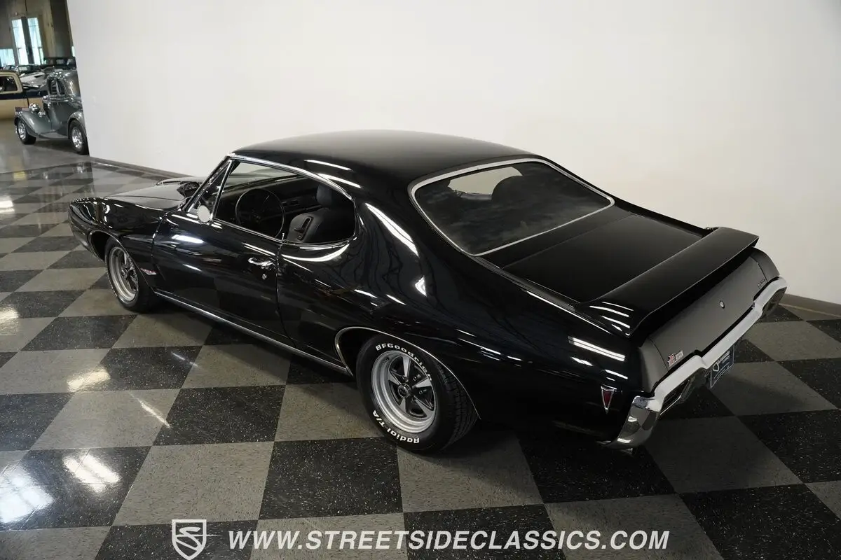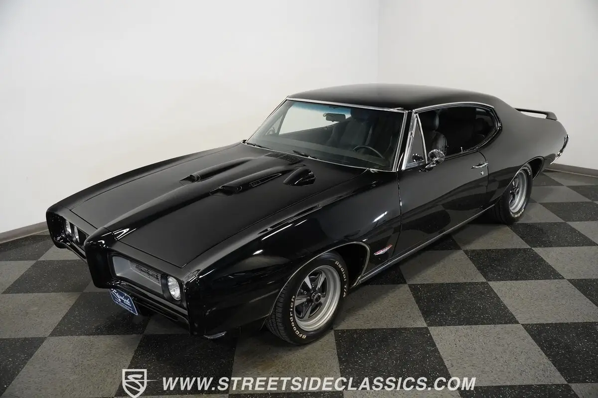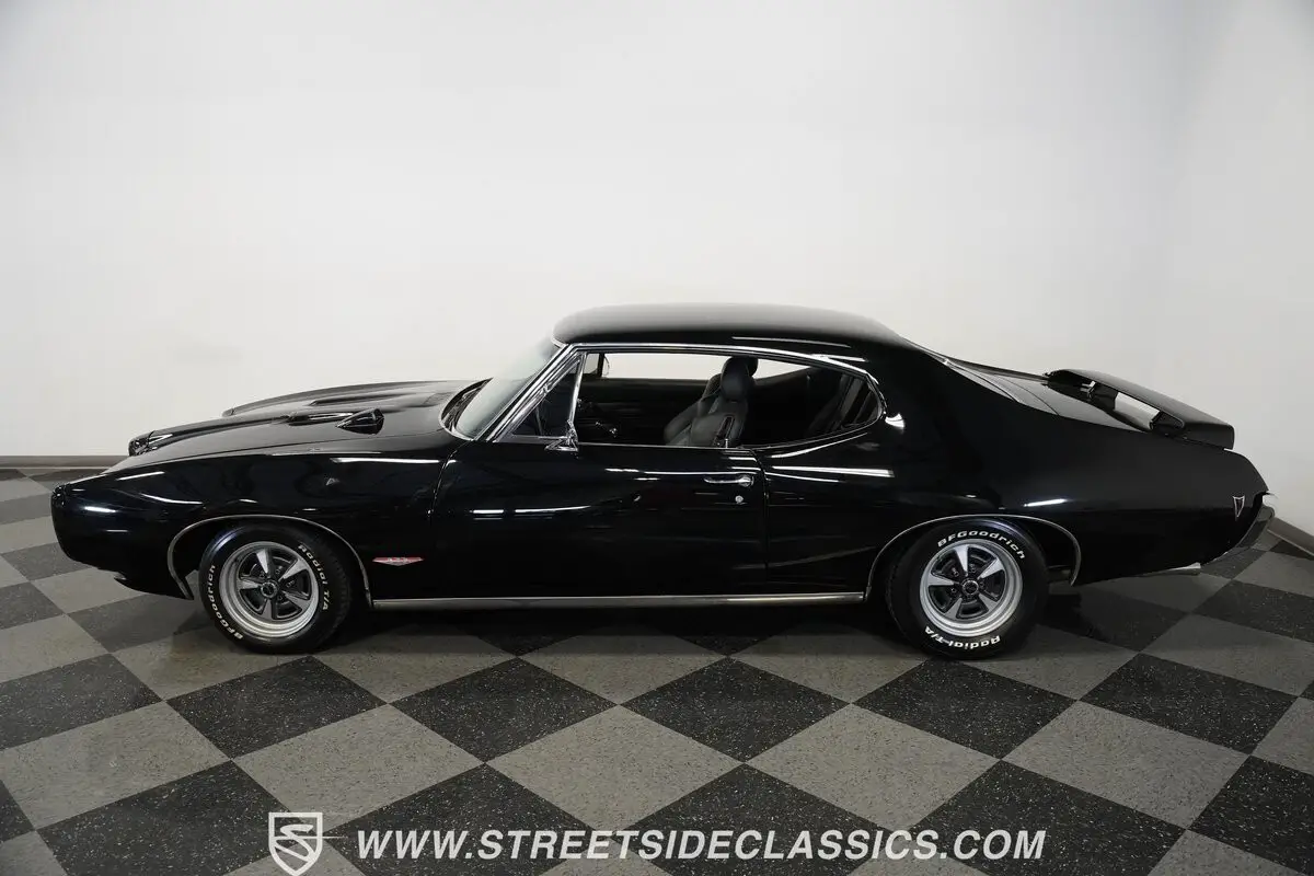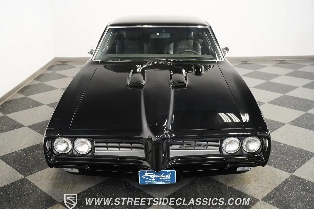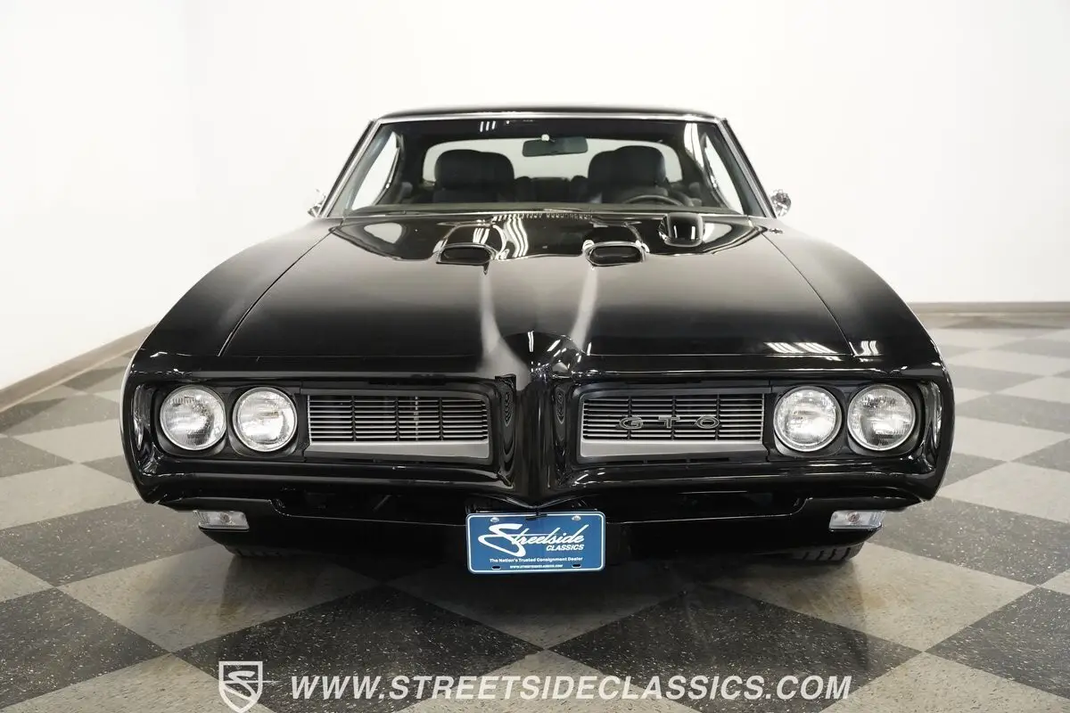 This 1968 Pontiac GTO, all muscle finished in a deep black that seems to stretch into infinity, asserts its dominance with more than just its color. Its distinctive hood, crowned with dual scoops and a hood tach, as well as a Judge style rear wing ad to the excitement. Perched on 15-inch Pontiac Rally ll wheels that anchor it firmly to the asphalt, its road presence is undeniable. The car's stance is aggressive, with BF Goodrich Radial T/A front tires sized at 205/60R15 and wider rear tires at 235/60R15, ensuring that every bit of power is translated directly to the road. This GTO makes an entrance with the unmistakable allure of American muscle.