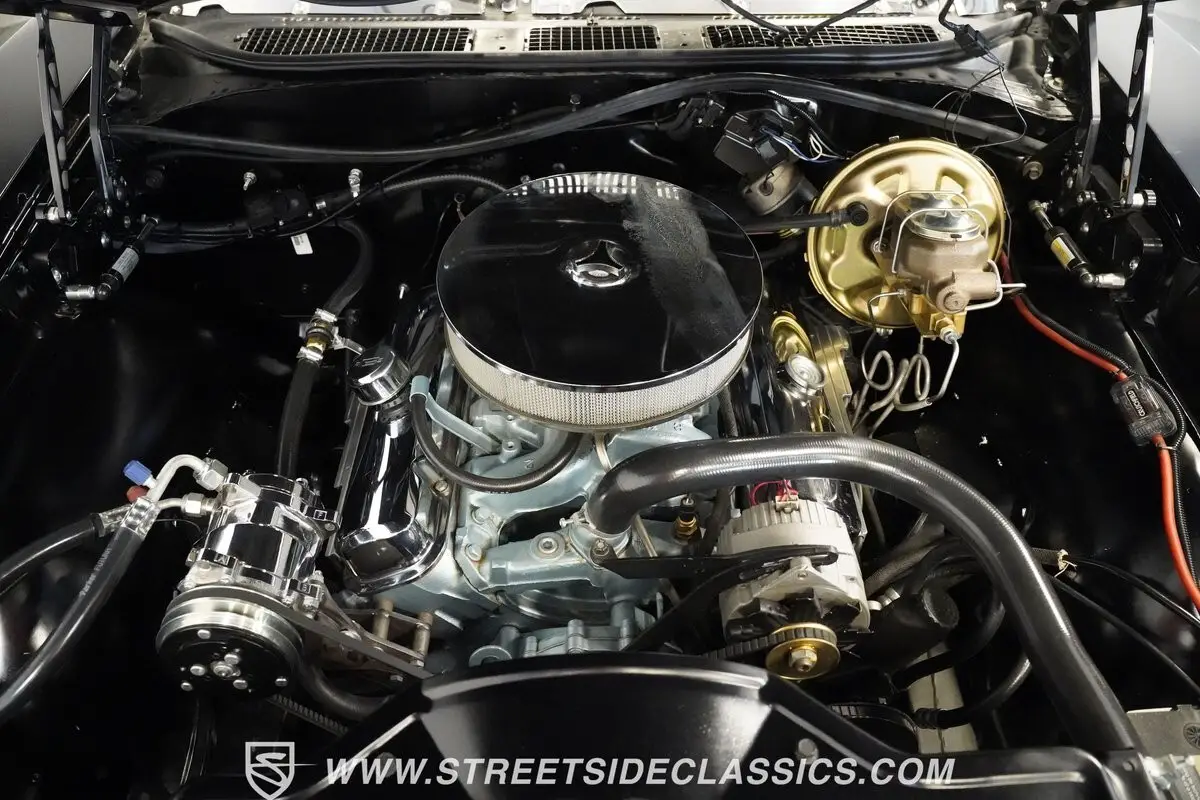 The interior, a sea of classic black, envelops you in an ambiance of vintage luxury. Luxurious leather bucket seats sourced from a late-model GTO offer a front-row seat to the road ahead, while the rear passengers enjoy the comfort of another pair of leather trimmed bucket seats. A custom console with cup holders houses JBL sound with Bluetooth controls and a Hurst shifter before sweeping up to house a Pioneer touchscreen infotainment center with remote. The custom dash face is fitted with a full set of red analog gauges by Speed Hut and a Vintage Air air conditioning system keeps the cabin cool.