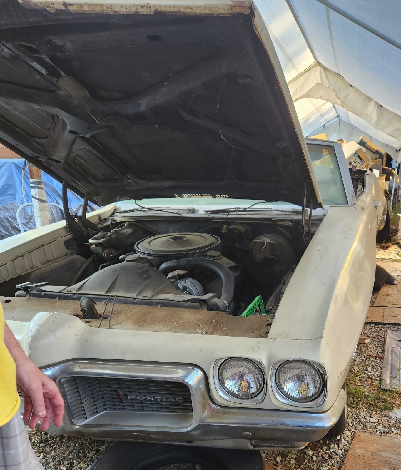 The car was repainted the current boring color, but the original color visible on the inner doors is code 45 Palisade green. What a really cool color. Probably less than 1% of 1970 Pontiacs were painted that color. What a shame. It’s such a nice shade.