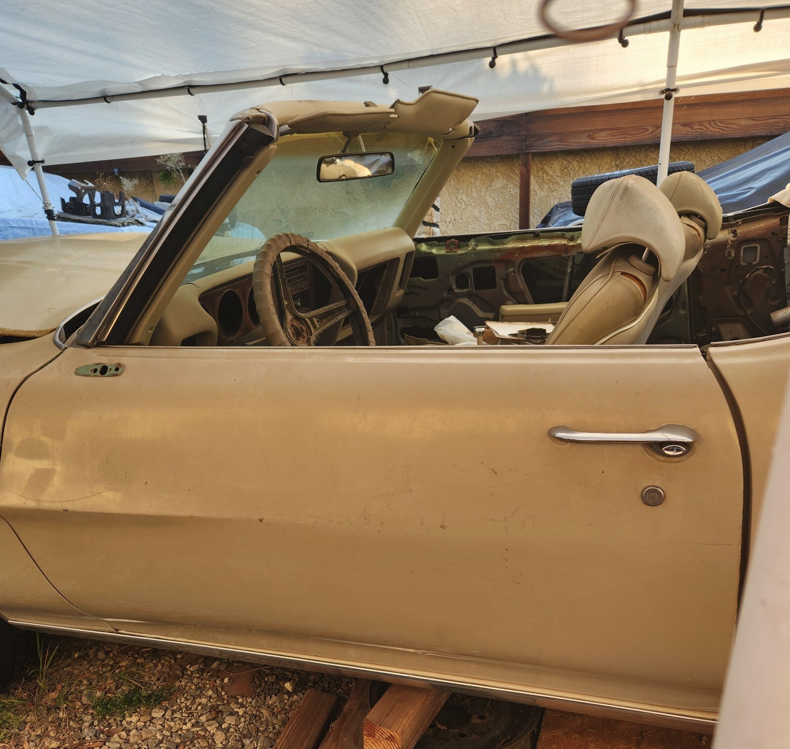 Also, it is loaded with factory AC, power windows, bucket seats, console, floor shift THM400, quick ratio steering box, power steering, disc brakes, etc. It’s so freakin’ original that even the factory radio knobs are still intact. The top frame is excellent, but I have removed what was left of the old top.