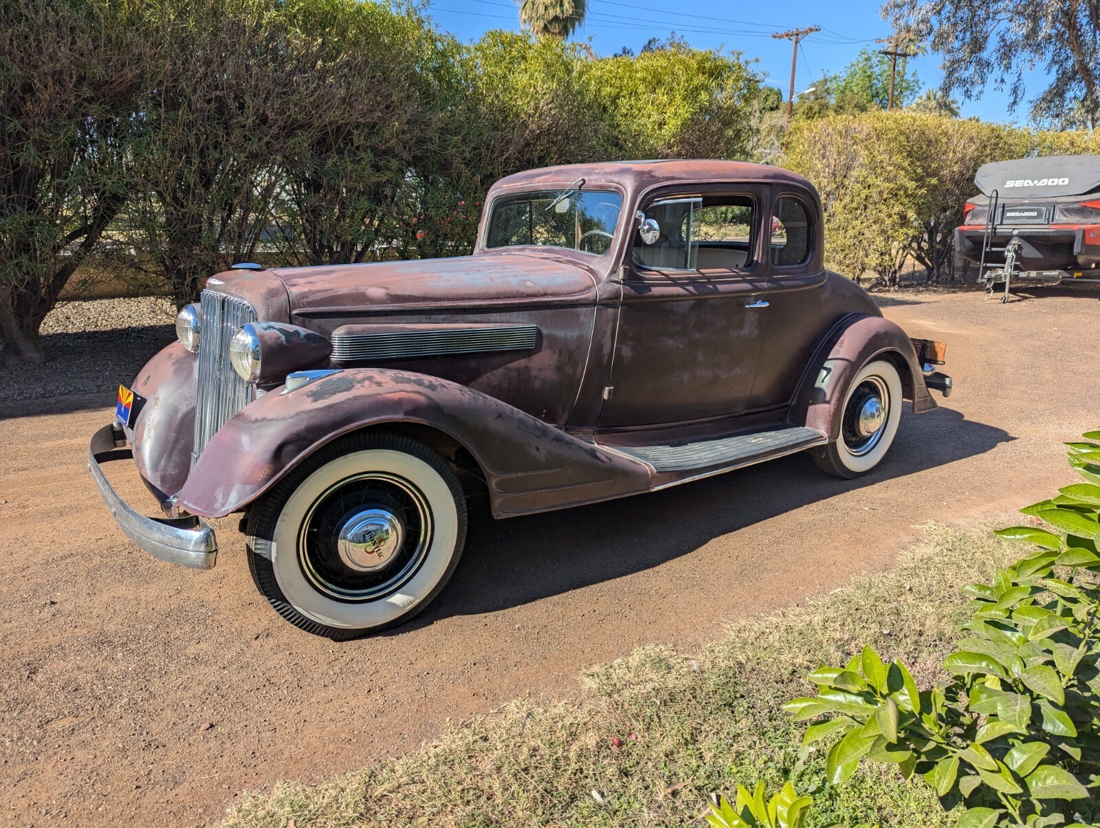 This is a 1934 Pontiac Coupe with a straight 8, 3-speed. Original paint, numbers matching, refurbished interior with power seat and stereo. All new brakes, and tire with spare. Runs and drives perfectly, and is quiet as a church mouse. Front end has been rebuilt, and everything in the car works. Original start mechanism has been bypassed for a push-button start. Body is not rusted, it just has the patina, with small dings here and there from being almost 100 years old. Smokes a little on start up because it rarely gets driven. Still the original 6 volt system, glass is in good condition, as is everything else.
