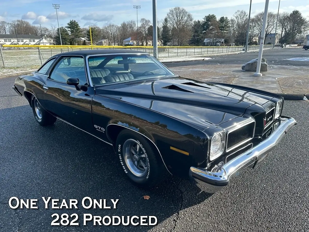 1973 PONTIAC GTO SPORT COUPE 400 CI V8 AUTO - AIR- RARE ONLY 282 PRODUCED MATCHING NUMBERS Â Â YEAR: 1973 MAKE: PONTIAC MODEL: GTO BODY: HARDTOP COLOR: BLACK / BLACK TOP TRIM: BLACK ENGINE: 400 CI V8 TRANS: AUTOMATIC REAR: 3:23 TO 1 MILES: 84,005 EXEMPT SERIAL#: 2D37T3P267511 Â OPTIONS *GTO OPTION *TINTED GLASS *CORDOVA TOP *POWER STEERING *POWER DISC BRAKES *AM /FM RADIO *DECOR GROUP *PROTECTIVE GROUP *VINYL TRIM *AIR CONDITIONING *SPORT MIRRORS *TURBO AUTO TRANS *RALLY 2 RIMS *REAR SPEAKER *RALLY GAUGES TACH *LAMP GROUP Â SERIAL NUMBER BREAKDOWN 2D37T3P267511 2-PONTIAC D37-LEMANS SPORT COUPE T-400 V8 3-1973 P-PONTIAC PLANT 267511 SEQUENCE Â COWL TAG ST73 2AD37-1973 LEMANS SPORT COUPE PON499298 PLANT # TR276 - BLACK BENCH PNT-19-19-BLACK 03C-BUILT 3RD WEEK OF MARCH A52-SEAT TRIM Â RESTORATION FRAME-OFF RESTORATION. COMPLETE NUTS AND BOLT RESTORATION RATED 9/10 QUALITY. COMPLETE DRIVELINE REBUILD. ALL ELECTRICAL AND MECHANICAL PERFECTION (BRIGHTWORK PERFECT) INTERIOR 10/10 ORIGINAL MOTOR 400 YS WAS OVERHAULED 30 OVER 62. HEADS 10.5 TO 1 COMPRESSION. CRANE CAM. EDELLBROOK INTAKE. PERTRONIX IGNITION. 26 YEARS TO COMPLETE PROFESSIONALLY. POWERFUL Â HISTORY ORIGINAL 1973 PONTIAC GTO WAS BOUGHT NEW IN WILLIAMSBURG, KY. OWNED BY THE LAST OWNER FOR 26 YEARS. STORED AND MAINTAINED IN SOUTH FLORIDA. ONLY 4806 GTO BUILT IN 1973 AND ONLY 282 SPORT COUPES IN THIS COMBO. ONLY A HANDFUL OF BLACK GTOARE AROUND AND NONE THIS WELL RESTORED. Â Â Â