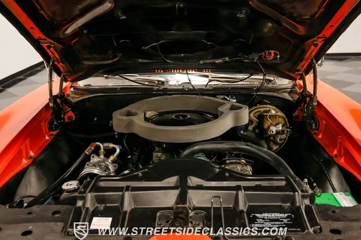 Inside, we find a stock and correctly outfitted interior, featuring an inviting Parchment and black motif, complemented by a touch of woodgrain trim along the dash. A three-pod Rally gauge cluster sits front and center of the power-assisted (and rare) wooden three-spoke steering wheel, featuring (from left to right) a multi-purpose fuel/oil/temperature readout, a big 140 mph speedometer, and a unique and equally large analog clock closest to the passenger side. If you're unfamiliar with the GTO, you might be asking yourself, "But where is the tach?" You need only look just above the dashboard and out the windshield to find an ingenious hood-mounted 8,000 rpm external tachometer, which not only looks unbelievably cool but makes it that much easier to keep your eyes on the fast-approaching road while still being able to hit that perfect 1-2 shift courtesy of a Hurst T-bar handle. The factory console and matching carpets and Vintage brand air conditioning add a touch of comfort. At the same time, the original AM radio remains on display, because, if we're honest, you'll never get tired of listening to that rumble emanating from the dual exhaust just beneath you anyway.