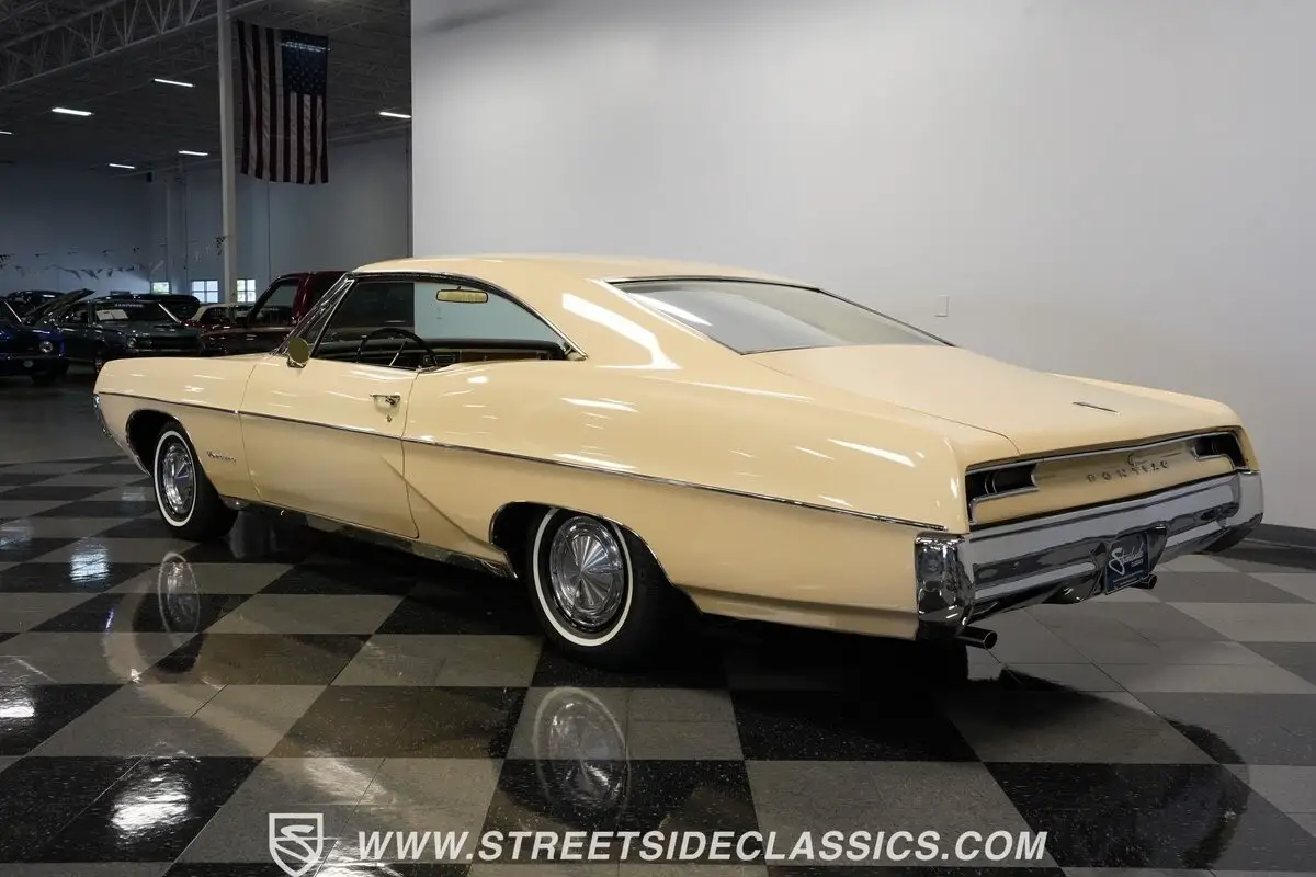 Exceptionally rare Ventura model distinguishes this 1967 Pontiac Catalina, displaying an attractive cream finish from a full bare-metal respray completed during its 2023/24 restoration. Additional exterior upgrades include meticulously restored chrome work across bumpers, trim pieces, and all factory lettering. The 14" steel wheels received professional powder coating before being fitted with P215/70R14 whitewall tires and factory PMD hubcaps. Dual exhaust exits through polished chrome tips, while brand new weather seals have been installed throughout the entire body.