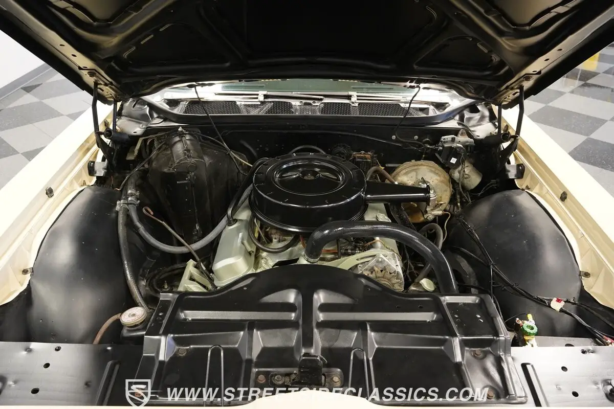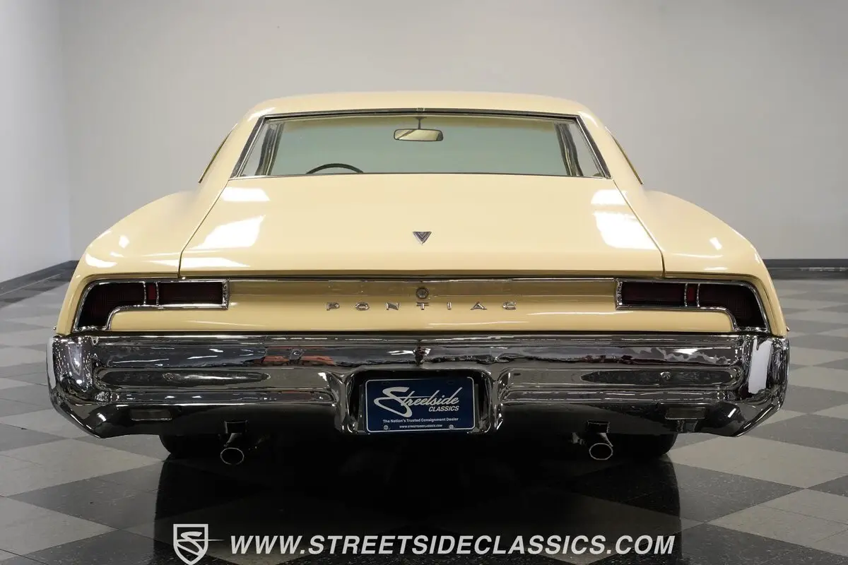 Lifting the massive hood reveals a 400 cubic inch V8 engine (YD suffix code indicating the 290 horsepower variant) mated to a TH400 three-speed automatic transmission. The mechanical package includes power steering for easy maneuverability and power drum brakes for solid stopping ability. Fuel delivery comes via a single two-barrel carburetor, while exhaust gases exit through a dual system equipped with Xlerator mufflers. Factory-style suspension components maintain proper ride height, and a sturdy Pontiac 10-bolt rear end handles the power distribution to the rear wheels.