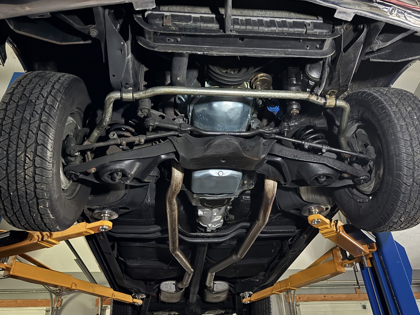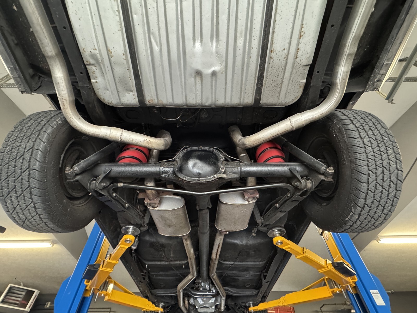 Looking up at the floors, it is all clean metal and appears to be original, no patch panels. The motor and Muncie 4 speed transmission look clean as well.It has a 2.5” dual exhaust with correct factory style mufflers and factory style tail pipes running out the back. The rear suspension has been upgraded with boxed in lower control arms and a rear sway bar. It has a Safe-T-Track rear end with 3:55 running gears. The E-brake assembly is complete and working.