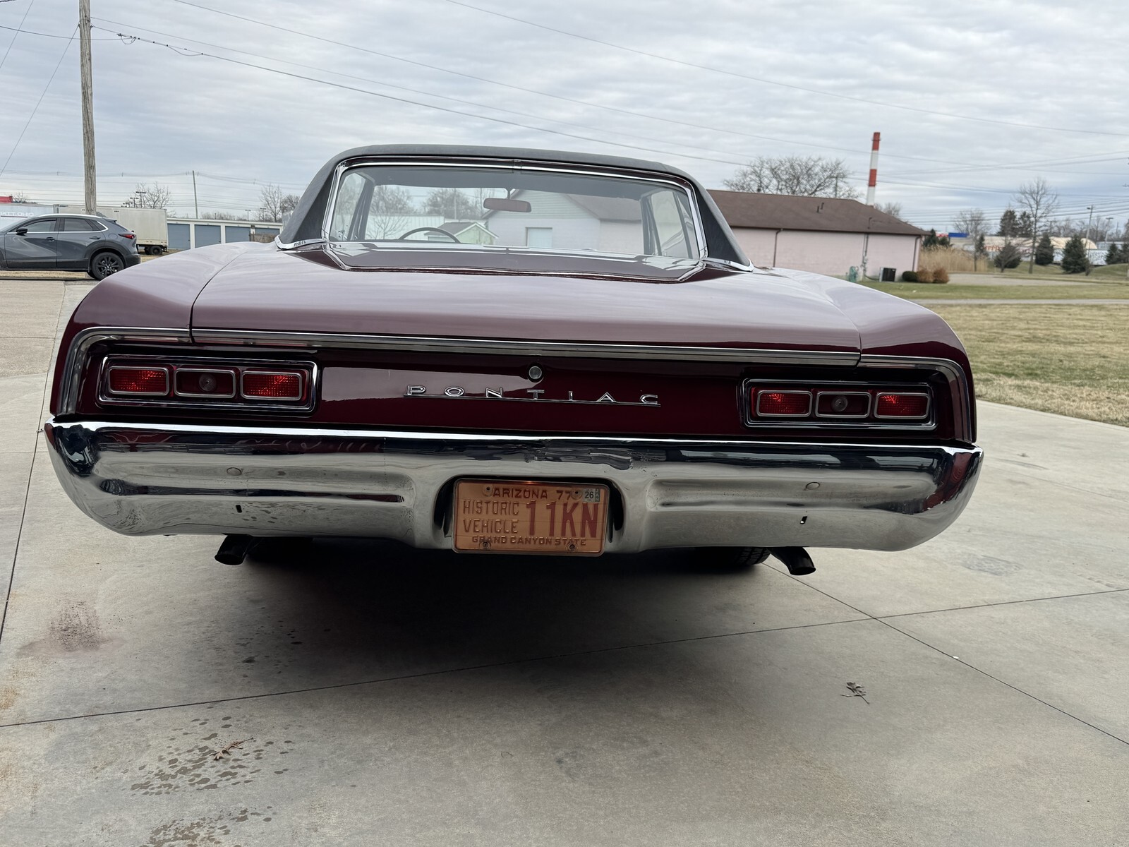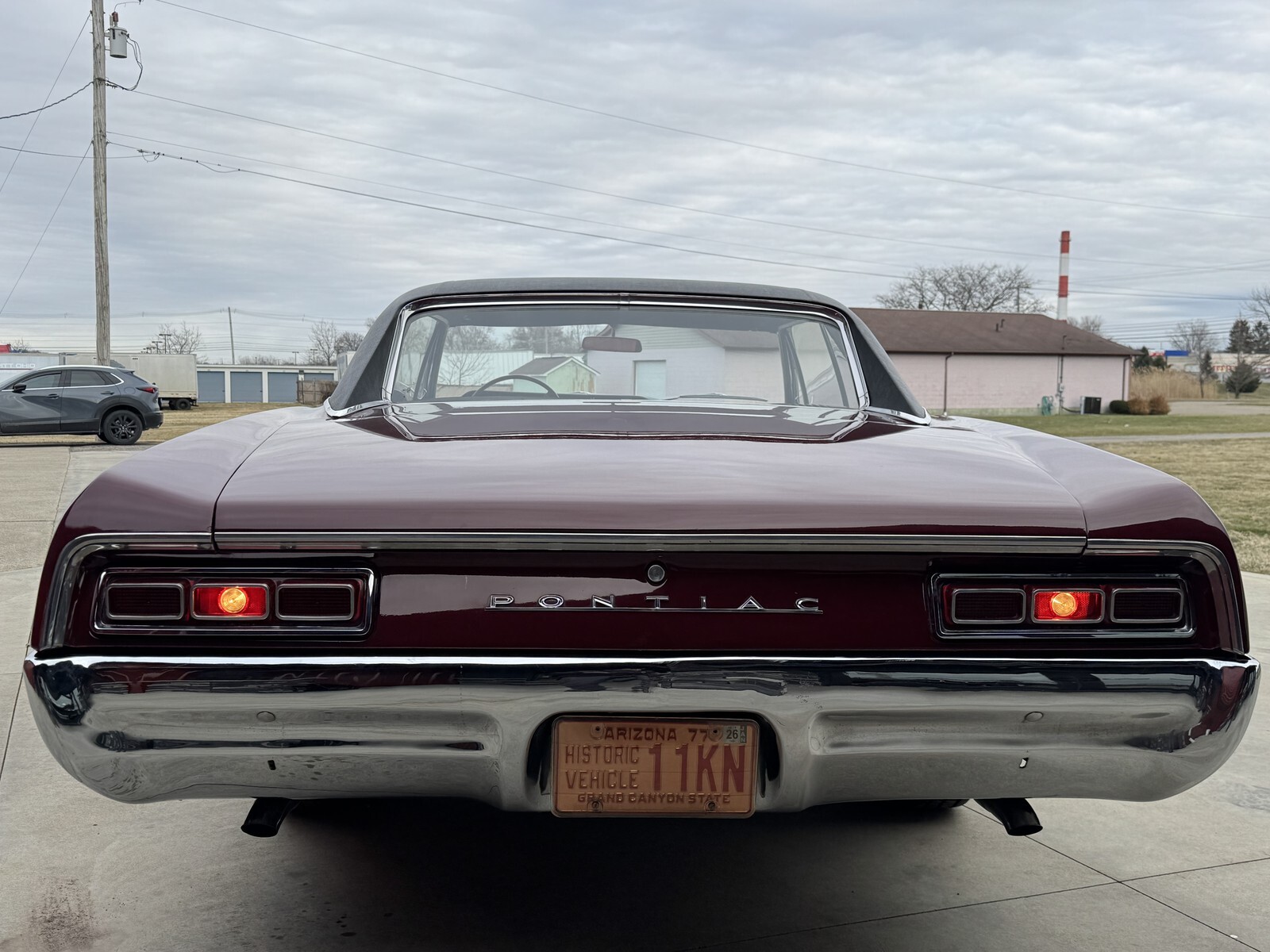 This is one nice LeMans! It appears to have all original metal. This LeMans has great fit and finish in its original color Burgundy code N. The paint is smooth, glossy and polished out beautifully. Looking down both sides it is straight. The vinyl top is in great shape as well. Up front the front bumper and headlight bezels are in great shape. The grills look great along with the parking lights. All the stainless trim is in great shape, nice chrome on vent windows, mirrors and door handles. The rear bumper is nice and shiny. The emblems and trim are in great shape. The windows line up good. It sits on a set of Rally II wheels with correct black PMD center caps, new trim rings with newer 225/70/14 BFG T/A radials!