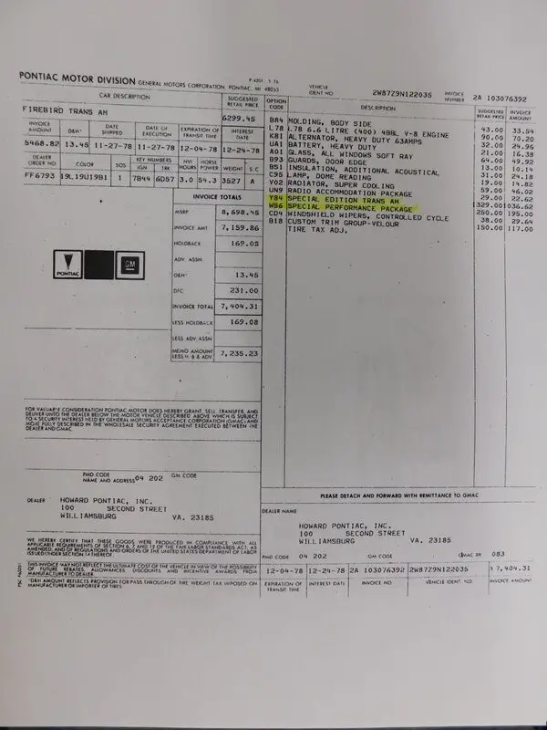 1979 Pontiac Trans Am SE Y84 400c.i. Four speed one of only 1,107 produced for the world NUMBERS MATCHING with PHS documentation! This one was sold new at Howard Pontiac Inc. In Williamsburg Virginia 23185. This one was ordered from the Factory with Air Conditioning delete and radio delete. This one was ordered with W72 engine option which included the Pontiac 400ci / 220HP paired with a four speed manual transmission. The WS6 Special Performance package option was ordered as well which included: