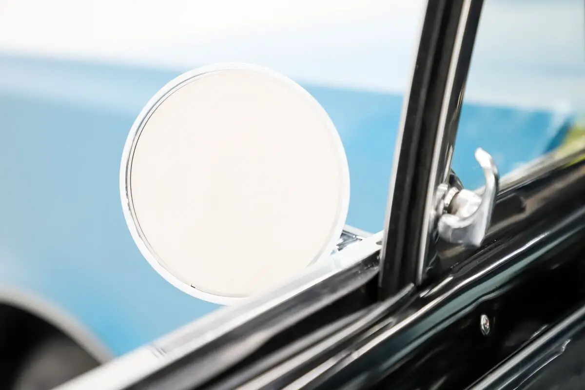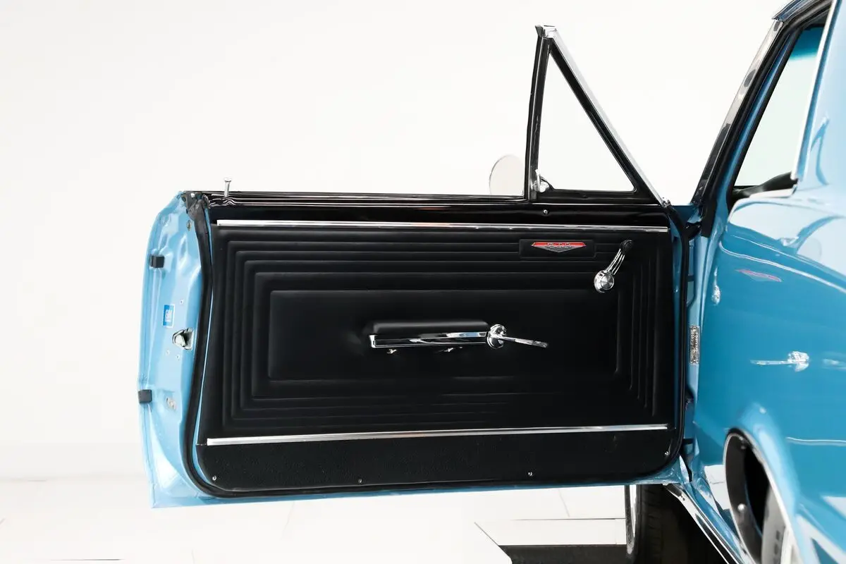 EXTERIOR: The body fit and finish is amazing! Every square inch is straight and polished like glass. The gaps are square, doors shut like new. Repainted GM light blue metallic basecoat with a glossy clearcoat, even the jambs are slick. The chrome and stainless sparkles, the weatherstrips were replaced, the windshield and rear window are new too. It's looking like the muscle car that it is, sitting on nostalgic Torque Thrust wheels and extra fat tires in back.