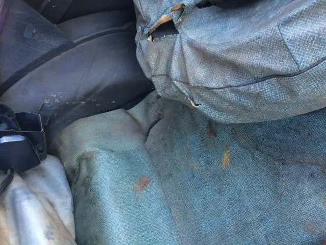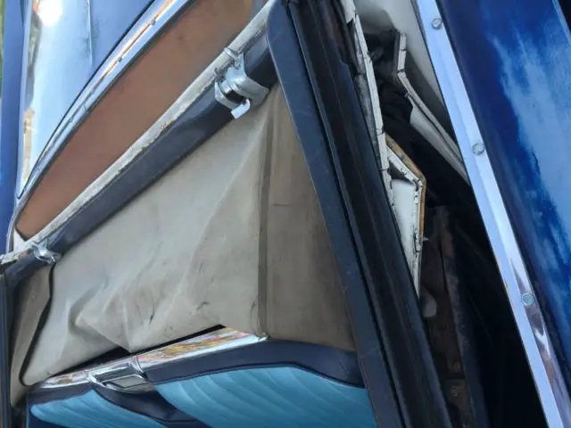 exterior / needs paint has the factory blue that is wearing and cracking in places and i have thought over and over about painting but with it beingoriginal. have not... has all the emblems and both front and back bumpers have chrome peeling but once again there is a place local that will rechrome very reasonable but I have not to keeporiginal....all lights work . brakes lights,,,,, needs a new top and motor .... dont know if motor should be rebuilt or replaced top has no rips and raises super easy and locks tight so I have just keeporiginal