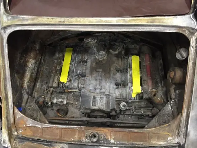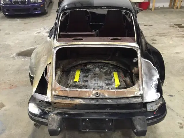IMPORTANT: there is a 2.7 in place, the Crank move, and the heat shield on the top of the motor was intact and appears to have kept everything under it much cooler than the intake manifold which: one of the plenums melted and ended up dropping into one (1) of the cylinder heads which appears to be limiting the movement of the crank. The motor is in "unknown condition" but at the very least is a decent core, I have a good running 2.7 available and complete with injection system CD box and all accessories available for $5k on top of agreed auction price.I have a bunch of parts to help replace what was damaged in the fire including all damaged rubber gaskets for the Windows a rear 1/4 from a 964, tail light housings. A fiberglass turbo tail and lid. The original 930 headlights will be included in the sale NOT the 964 housings and rings pictured currently