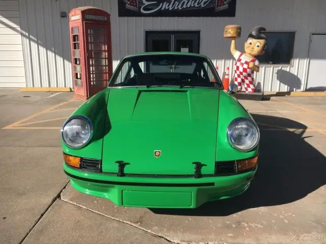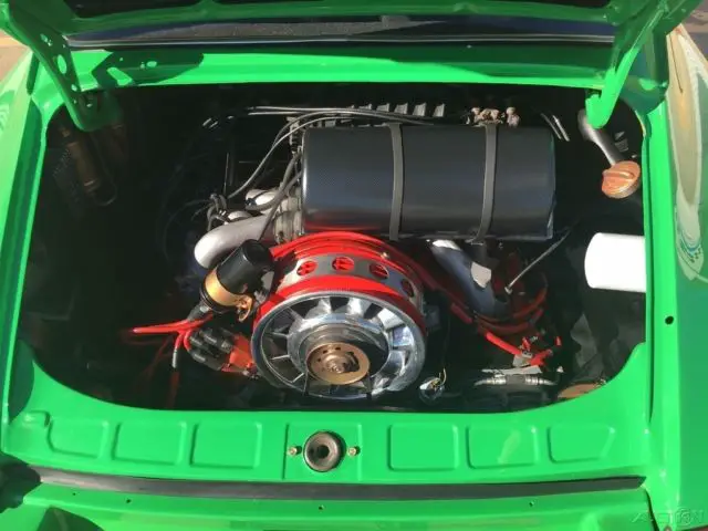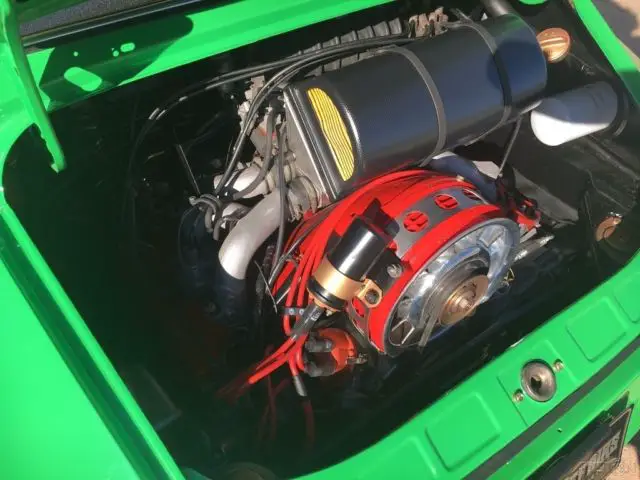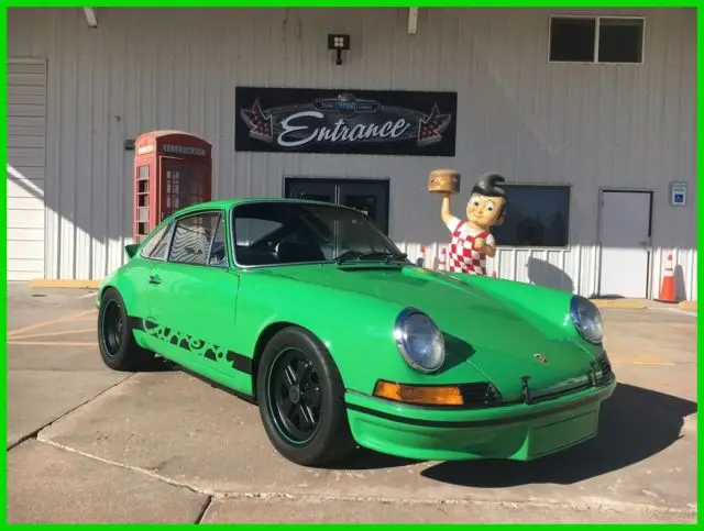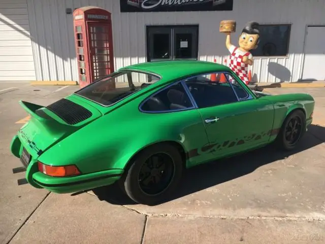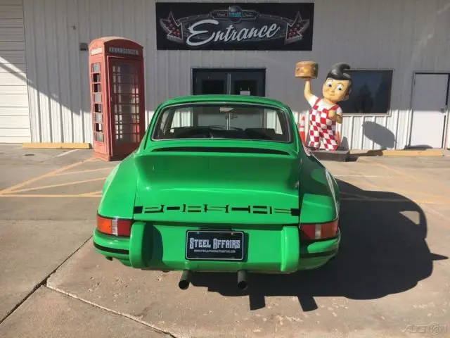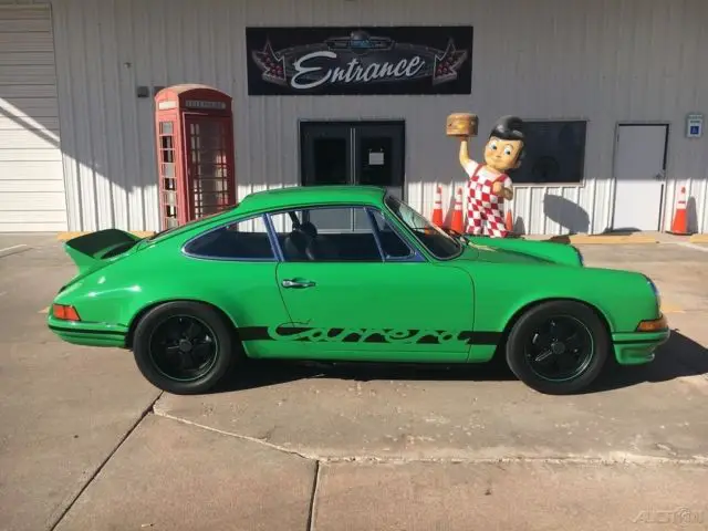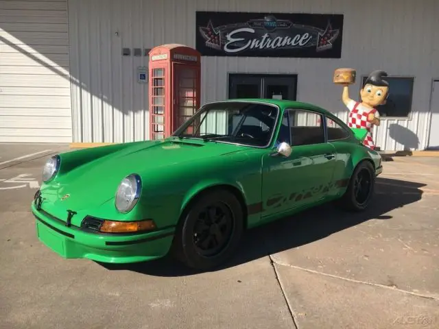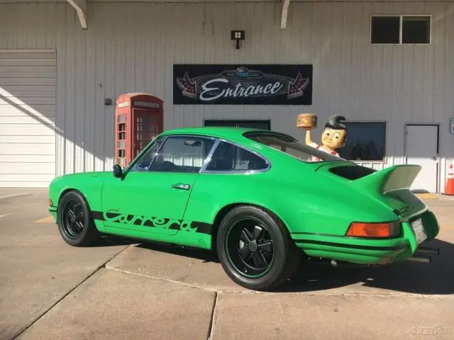 This backdate Porsche is a '78 non-sunroof coupe that has been transformed to re-create the world-famous 1973 2.7 RS. correct, rebuilt 3.0-liter 6-cylinder engine (Serial #6290921) and shifted via its 5-speed manual gearbox. Finished in Viper Green over black interior, this features 1973 OEM early metal fenders, early window frames, pop-out quarter windows and fiberglass hood, ducktail and bumpers. It's equipped with 930 brake system with Rennsport Systems 2-piece front rotors, M&K sport muffler and Webb Machine stainless airbox with pop-off valve. It features Boge front struts with Bilstein inserts and Bilstein rear shocks. It rides on 7" front and 9.5" rear Fuchs wheels that have been media blasted, painted, clear-coated and wrapped in Toyo R888 tires. Interior features include ventless leather dash, lower dash accessory delete, '73 glove box door, 930 150 mph speedometer, RS carpet and panels, Rs-style seats with sliders, short shifter with fresh bushings/seals, MOMO steering wheel with Porsche horn button and Vosstek pedals. Exterior features include '73 mirrors, handles and hood straps.