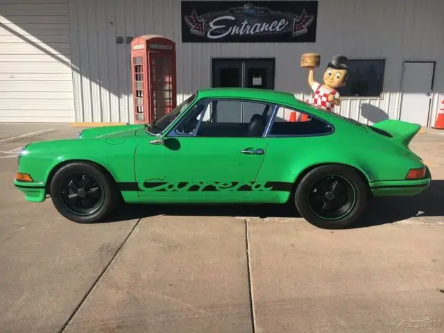 This backdate Porsche is a '78 non-sunroof coupe that has been transformed to re-create the world-famous 1973 2.7 RS. correct, rebuilt 3.0-liter 6-cylinder engine (Serial #6290921) and shifted via its 5-speed manual gearbox. Finished in Viper Green over black interior, this features 1973 OEM early metal fenders, early window frames, pop-out quarter windows and fiberglass hood, ducktail and bumpers. It's equipped with 930 brake system with Rennsport Systems 2-piece front rotors, M&K sport muffler and Webb Machine stainless airbox with pop-off valve. It features Boge front struts with Bilstein inserts and Bilstein rear shocks. It rides on 7" front and 9.5" rear Fuchs wheels that have been media blasted, painted, clear-coated and wrapped in Toyo R888 tires. Interior features include ventless leather dash, lower dash accessory delete, '73 glove box door, 930 150 mph speedometer, RS carpet and panels, Rs-style seats with sliders, short shifter with fresh bushings/seals, MOMO steering wheel with Porsche horn button and Vosstek pedals. Exterior features include '73 mirrors, handles and hood straps.