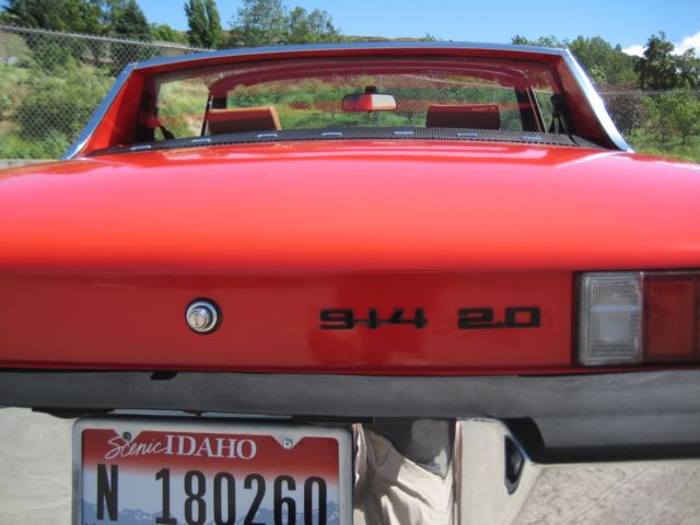 Up for auction is a Porsche 914 2.0 Liter or referred to as 914S by some early Porsche ads. www.pelicanparts.com/techarticles/914 Darling FAQ/914 Darling FAQ.htm is a good resource for 914's. It refers to this year/model/motor as the combo most desired given all options were included slandered with improved power out of the engine also prior to the implementation of emissions requirements. This Porsche has had a repaint and is showing some aging.It has a couple of small chips and there is a small bubble in the paint at the passenger side door opener. Also there is a crack in the paint on the rear deck lid about 3" long. (hard to see) The under pan is very good but a aria under the front spare tire well has been replaced. (please look at pictures closely) The body is straight and shows well with its unripen marker and tail lights. The removable targa top is in great condition and fixtures securing the top in the trunk have been replaced. Glass is very good and has been replaced at some time. Side windows roll up and down as they should. The car has the appearance package with center console gauges, recently replaced upholstery, though sun visors and headliner are missing. A full seal kit has been installed along with vinyl sails.Of note, the odometer is not working, however all other gauges function properly. Maybe about 5000 more miles are on the car's odometerthat it shows. The engine has been converted to hydraulic lifters and the car has never been appropriately tuned since the conversion.Spark plugs, wires, air filter, distributor cap, rotor, points, fuel filter and valve cover seals have been replaced in the last 12 months. In the past 6 year upgrades are, brake master cylinder, rebuilt front brakes, replaced under car cooling ducting, installed a passenger foot-well subwoofer with amp in the front trunk, and installed new upgraded 100 lb. Veltmeister springswith Koni shocks on the rear. The car spent 2007-2013 covered in a covered parking garage with other collector cars in southern California. Car has been garaged since transported to Idaho, never driven in rain or taken out of garage when snow or road treatment possibly present. This car runs well when cold/cool but has some trouble when it heats up. It has been suggested by mechanic that the problem is a malfunctioning fuel injector. I'm listing this nice little Porsche forthe ownerand will take all questions to him. Buyer is responsible for shipping and all shipping costs. We will help with loading on our end and in anyway we can. For your questions please call Bill (208)750-0000