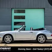 This Porsche 914 was a joint development between Porsche and Volkswagen. It became the new Porsche entry level model when first entering the market in 1970. This two-seater is a running mid-engine sports car. This car was assembled by the German coachbuilder Karmann.Striking design features include the very long wheelbase for the vehicle length and short overhangs. The removable roof center panel is made from fiberglass reinforced plastic. Additionally, it has a safety bar. Pop-up headlights are another interesting feature.Engine - the engine is a 1.8 liter flat-four engine with 85 hp. The transaxle is similar to the 911's but the housing is different due to the 914's mid-mounted engine.Steering - a three piece column shaft incorporating universal joints connected to a light action rack-and-pinion steering. It offers a very light and accurate feel. The ratio is 17.8:1 or three turns to lock.Brakes - disk brakes at all four corners. Additionally, a self adjusting hand brake connected to the rear wheels.Interior - sports car style bucket seats in leatherette. Forward and back adjustment plus four different height and tilt positions.Instrument panel - speedometer with trip mileage odometer and transistorized tachometer. The combined instrument dial has warning lights for oil pressure, battery voltage and fuel gauge.Luggage - there are two separate luggage compartments in the 914. One in the front and one in the rear. The combined storage capacity is 16.2 cubic feet.Hardtop - the rear compartment also serves as a storage area for the removable fiberglass hardtop. The top is easily removed by releasing four locking catches, two on the windshield frame and two on the roll bar..