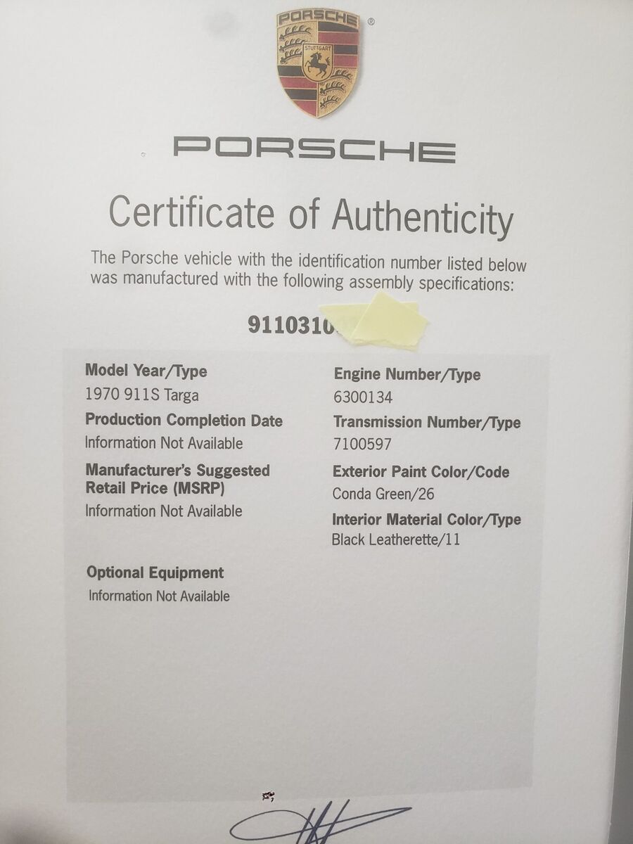 Original; 1970 911 S Targa. Very RARE 911 S - Super ! Vin 911031.... very low production. 1 of only 729 - 911 S Targa build in 1970.The original Porsche Certificate of Authenticity with Vin., Engine number is incl. .Rare cool original paint, Conda Green/26.Barn find ! Needs full restauration. Rusty. Donar body would be perfect. Or do your rust repair.No bumpers. What you see is what you get.Has original Rare 250 km/h Speedometer and the "S" 8000 rpm Tach with 7500 rpm redline installed.Has installed early 70s 911 T carburetor engine. (I believe 1970-1971 engine). Was running when parked many years ago.Priced right ! You know how much restored "S" go for. Worth the restauration. Priced right.Location is in Hesperia California 92345. Just 1 h. from Los Angeles Call 562 7435419.Take a look, check it out.I can organize or help with nationwide towing and or international shipping, sxports@gmail.comWorldwide shipping, buyer pays.Sold on a bill of sale. Title lost. If title is needed, for export, we can order a new title-registration under your name for extra $. Buyer pays.