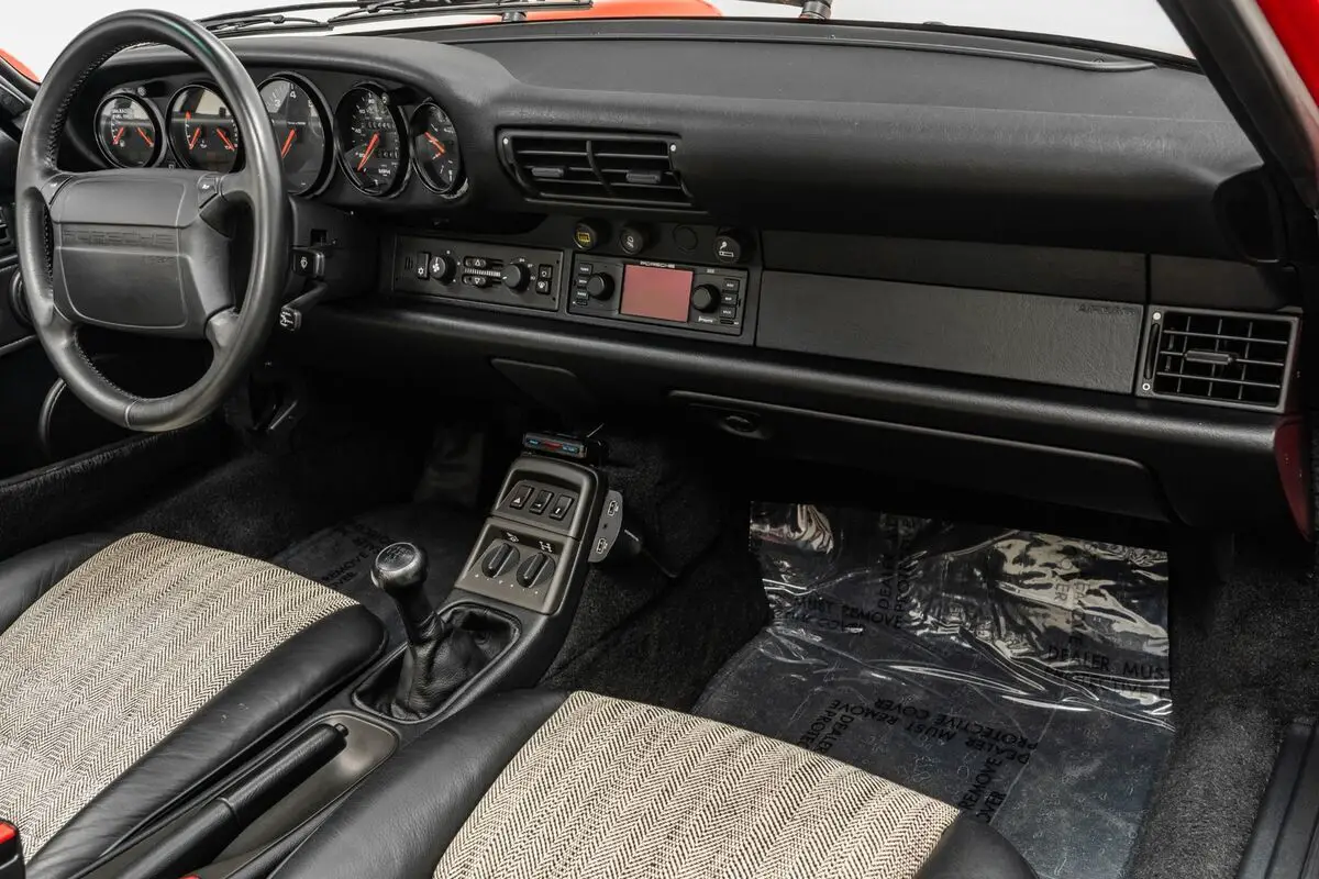 We have just added to our extensive exotic car inventory a beautiful 1993 Porsche 911 Targa 4 in Guards Red over Black leather and only 4,409 miles. This Carrera is loaded with: 3.6 Liter H6, 5 speed manual transmission, 17 inch Cup 1 five spoke wheels (originally finished in SUPER rare Guards Red), 8 way power driver and passenger seats, supple leather seats, AM/FM/CD player, cruise control, rear wiper, books, the original window sticker, Porsche COA, velour floor mats, black Targa top and much more. This is a HIGHLY documented car that spent the first 21 years of its life with its original owner, who skillfully personalized it. It's lowered to Euro ride height, the wheels were painted in a Fuchs-style scheme, there's a slim Tech Art front spoiler up front, vintage gold Targa badges on the B pillars, "Carrera" decals on the doors, the seats now feature herringbone cloth inserts, a Porsche Classic Radionavi head unit and speaker set inside and there's a dual tip ANDIAL exhaust out back. This is a very well preserved, good looking Targa.