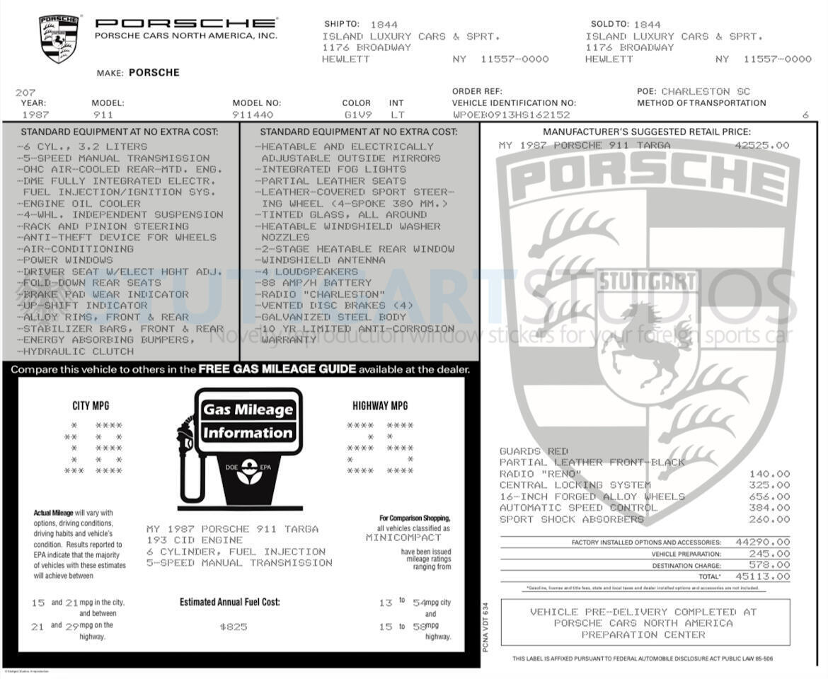 FULL HIGH RESOLUTION PHOTOS AND DETAILED DESCRIPTION ON YOU HAVE A VEHICLE YOU ARE LOOKING TO SELL, PLEASE CALL US AT 770-455-8494WE SHOW VEHICLES BY APPOINTMENT ONLY. PLEASE CALL TO SCHEDULE AN APPOINTMENT IN ORDER TO VIEW A LISTING IN PERSON.NEW ARRIVAL!! RECENT PAINT CORRECTION AND CERAMIC COATING! HAS EVERY RECORD, INVOICE, AND PIECE OF DOCUMENTATION SINCE NEW INCLUDING ORIGINAL SALES DOCS! ABSOLUTELY STUNNING AND TRUE 21,300-MILE 1987 PORSCHE 911 TARGA G50 IN AS CLOSE TONEW CONDITION AS WE'VE SEEN. THIS CAR HAS BEEN AS WELL CARED FOR AND LOVED SINCEIT WAS BOUGHT IT NEW FROM PORSCHE DIRECTLY AND IT TRULY SHOWS. RUNS, DRIVES, AND SOUNDS FLAWLESS. ENGINE AND TRANSMISSION HAVE BOTH BEEN REBUILT OVER THE PAST COUPLE YEARS AND HAS ALL NEW GASKETS, SEALS, COMPONENTS, R134 CONVERTED AIR CONDITIONING, SUSPENSION WITH BILSTEIN SHOCKS AND 930 STABILIZING BARS, BRAKES, EXHAUST, AND SO MUCH MORE. RECORDS AND UNDERSIDE PHOTOS AVAILABLE UPON REQUEST. COMES WITHBOOKS, MANUALS, FACTORY TOOL KIT, SERVICE RECORDS DATING BACK TO 1988, COPY OF WINDOW STICKER, SEVERAL KEYS, AND SO MUCH MORE.EXTERIOR IS FINISHED INGUARDS RED OVERBLACK LEATHER INTERIOR.OPTIONS AND FEATURES INCLUDE:3.2L FLAT 6 CYLINDER ENGINEG50 MANUAL TRANSMISSIONREAR WHEEL DRIVEPOWER WINDOWSPOWER FRONT SEATSLEATHERETTE TARGA ROOFBLACK REAR GRILLEUPGRADED RADIO HEAD UNITSPLIT FOLD REAR SEATSAIR CONDITIONING (R134 CONVERTED)FUCHS WHEELS930 TURBO SUSPENSIONSTOPTECH BRAKESFABSPEED DUAL EXIT CUSTOM EXHAUSTAND MUCH MORE.GAS MOTORCARS IS A FAMILY OWNED AND OPERATED CAR DEALERSHIP LOCATED IN MARIETTA, GA. WE ONLY SELL VEHICLES OF THE HIGHEST QUALITY. WE SHIP VEHICLES WORLDWIDE AT THE BUYER'S EXPENSE. WE TAKE CONSIGNMENTS AS WELL AS TRADES.WE SHOW VEHICLES BY APPOINTMENT ONLY.PLEASE CALL AHEAD TO SCHEDULE A DATE AND TIME IN ORDER TO VIEW A LISTING IN PERSON.CONNECT WITH US ON INSTAGRAM @GASMOTORCARSIt is the customers sole responsibility to verify the existence and condition of any equipment listed. Neither the dealership nor DealerCarSearch is responsible for misprints on prices or equipment. It is the customers sole responsibility to verify the accuracy of the prices with the dealer, including the pricing for all added accessories. Visit Gas Motorcars online at to see more pictures of this vehicle or call us at770-455-8494 today to schedule your test drive.