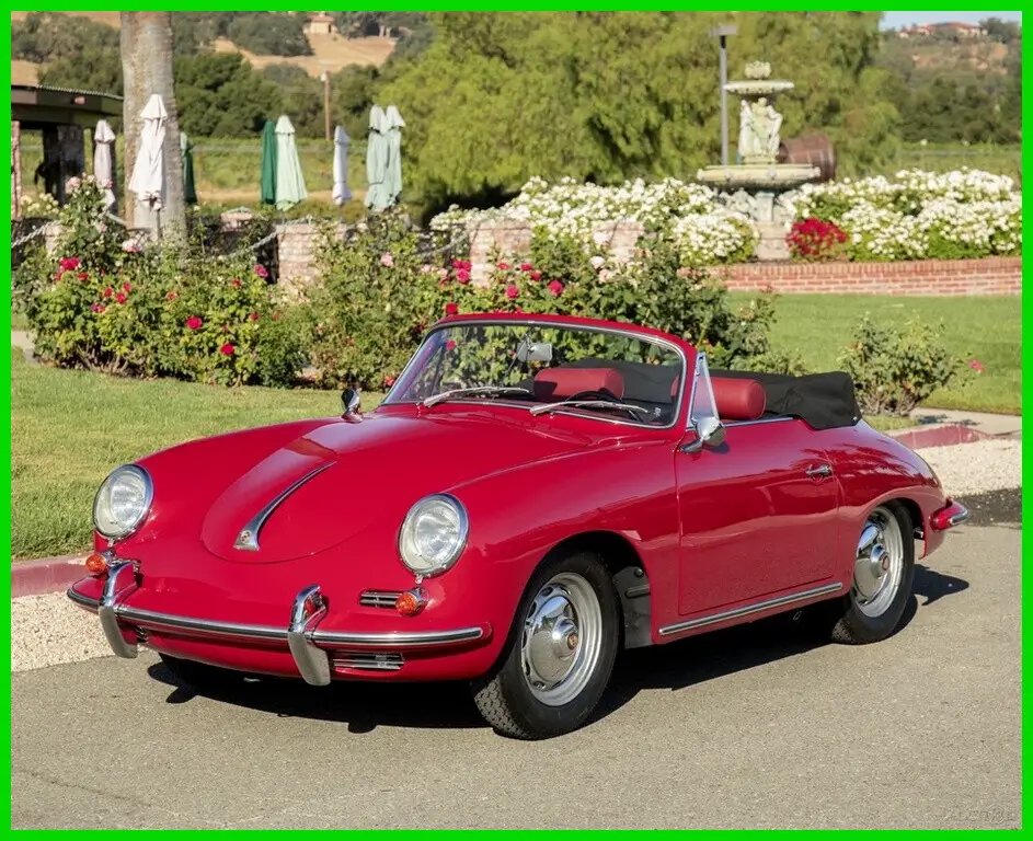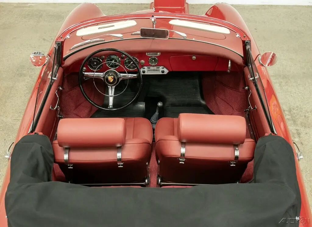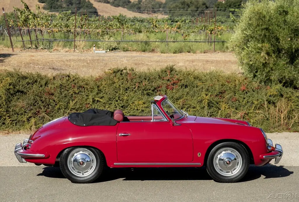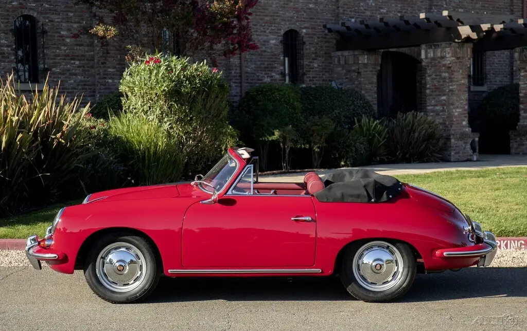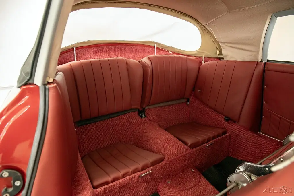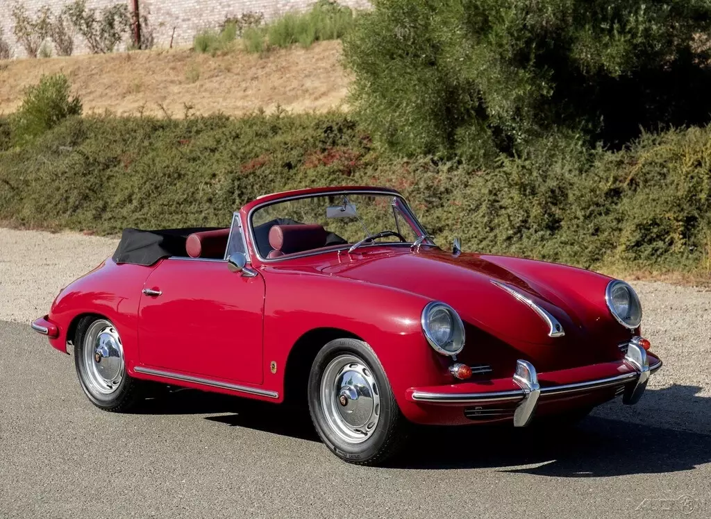 1960 Porsche 356b T5 Super 90 Cabriolet: Factory luggage; leather interior; Becker Mexico radio; leather headrests; clock; numbers-matching engine, transmission, doors, hood, decklid; extra hardtop. We purchased this car 6 years ago and it has undergone a complete restoration: new floor metal and longitudinals; bare-metal repaint in the original Ruby Red; new original Red Leather seats and headrests; new German weave carpet; new soft-top; rebuilt engine; new clutch; rebuilt carburetors; new brakes; new tires; all new body rubbers and seals; etc. Too many details to list. The T5 Super 90 Cabriolet is a rare and desirable model, and this in an investment-grade example with all brand-new work. Porsche factory Kardex included. Please study the pictures carefully rather