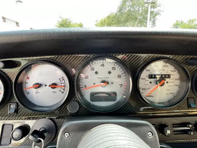 Bilstein B6 dampers, a TechArt fog light and brake duct kit, a power sunroof, a fixed rear spoiler, a Fabspeed Motorsport exhaust system, power-adjustable front seats, air conditioning, a Blaupunkt stereo, carbon-fiber interior trim, drilled aluminum pedals, and a 993-spec shift knob and handbrake grip.