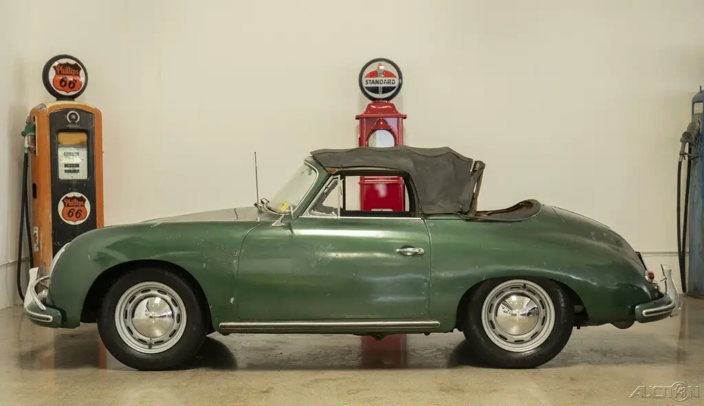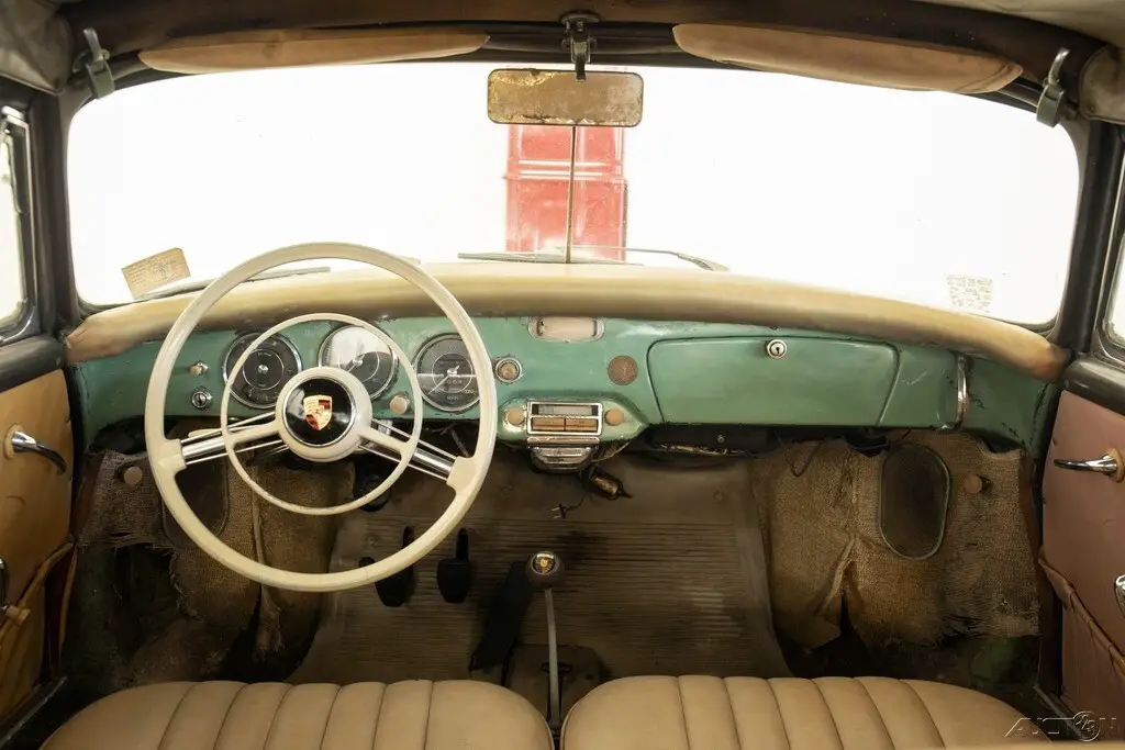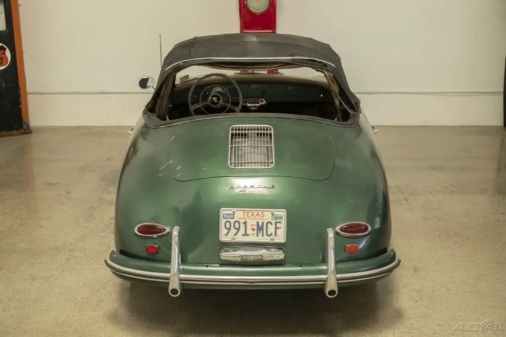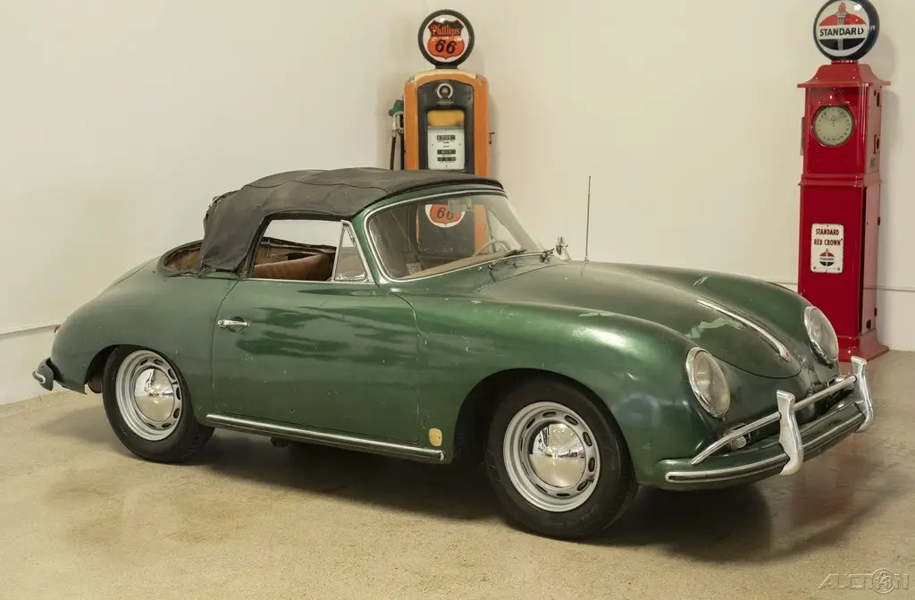 1958 Porsche 356a Cabriolet: Stored inside a Texas warehouse for 40 years; solid original body; numbers-matching engine; factory color code 5712 (Auratium Green). We purchased this car along with 14 other cars and trucks from a retired estate liquidator in his 80's named Milton. He had amassed nice collection of original-low mile vehicles, all of which were not driven in 3 to 4 decades. Milton did not want to sell the cars individually, so we bought them all in order to get several key cars, with this 356a T2 Cabriolet at the top of that list. We cleaned the car and got the engine running, after 40 years idle it runs even and sounds healthy. All other mechanical systems need to be checked prior to driving. Please study the pictures carefully rather than