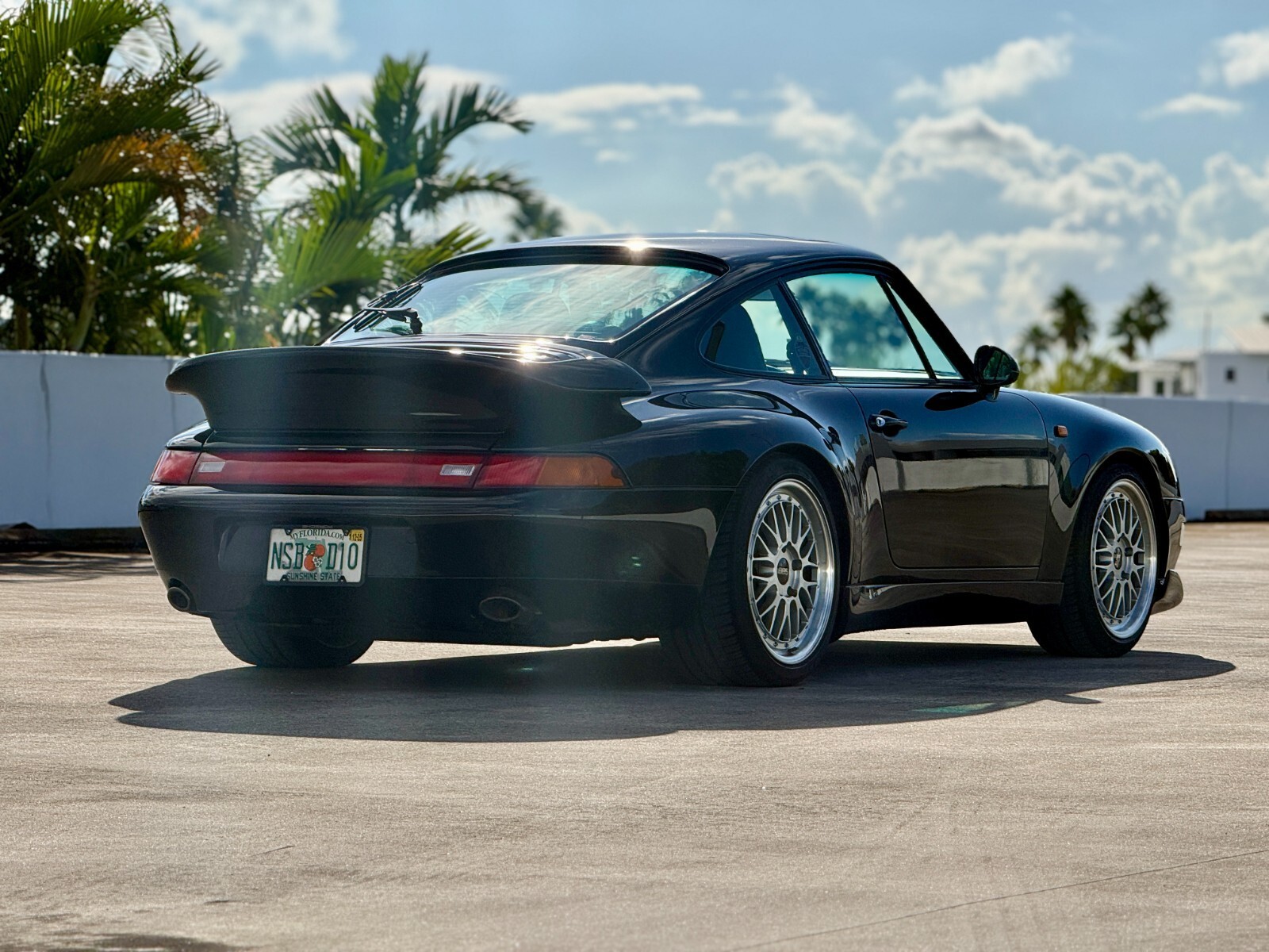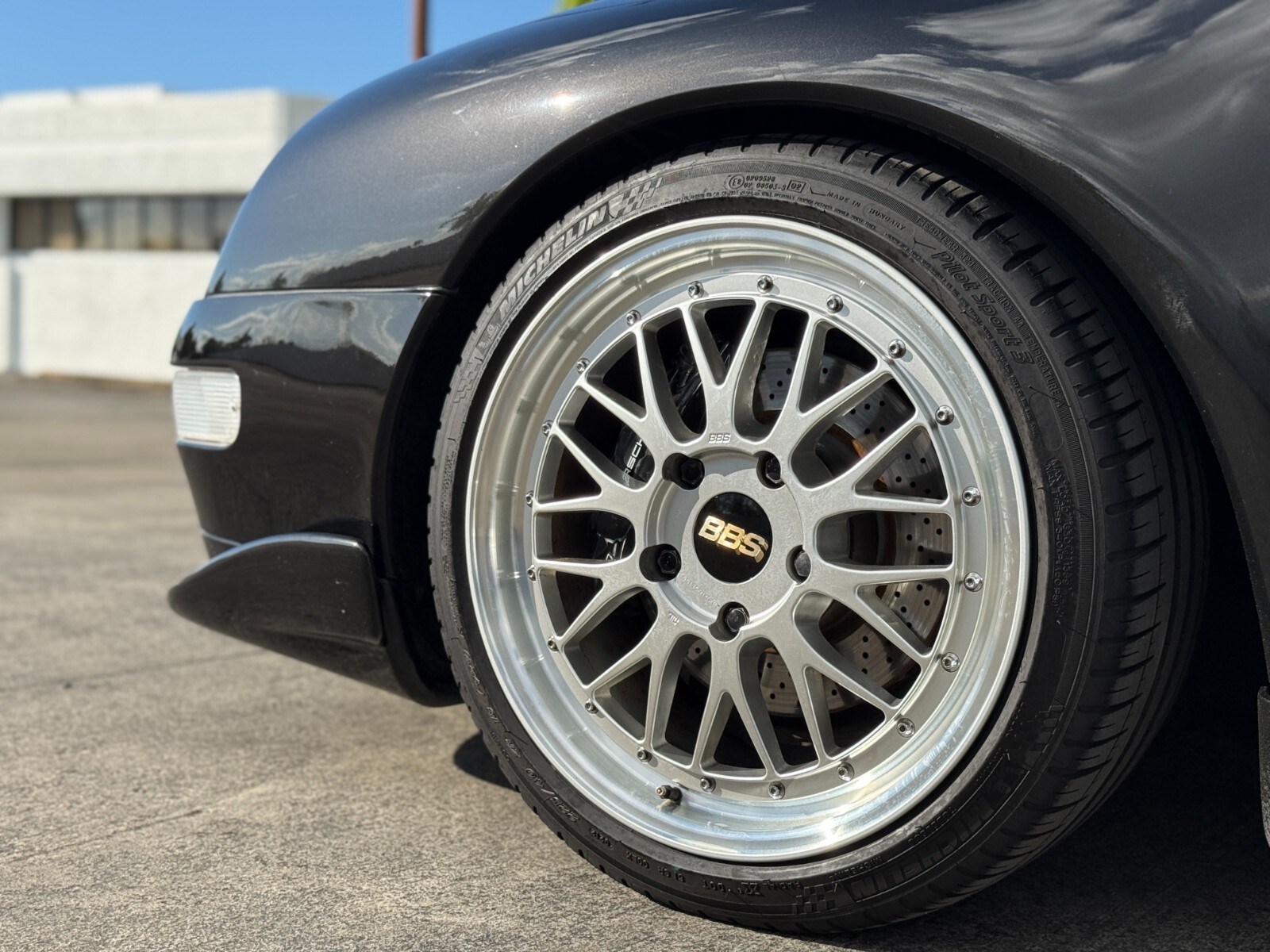 ExteriorFinished in Dark Gray Metallic, this 993 benefits from a Turbo-style body kit with flared fenders, side skirts, and a fixed “whale tail” rear wing. The paint presents glossy and even, complemented by clear lenses and clean trim. It rides on multi-piece alloy wheels fitted with low-profile performance tires.