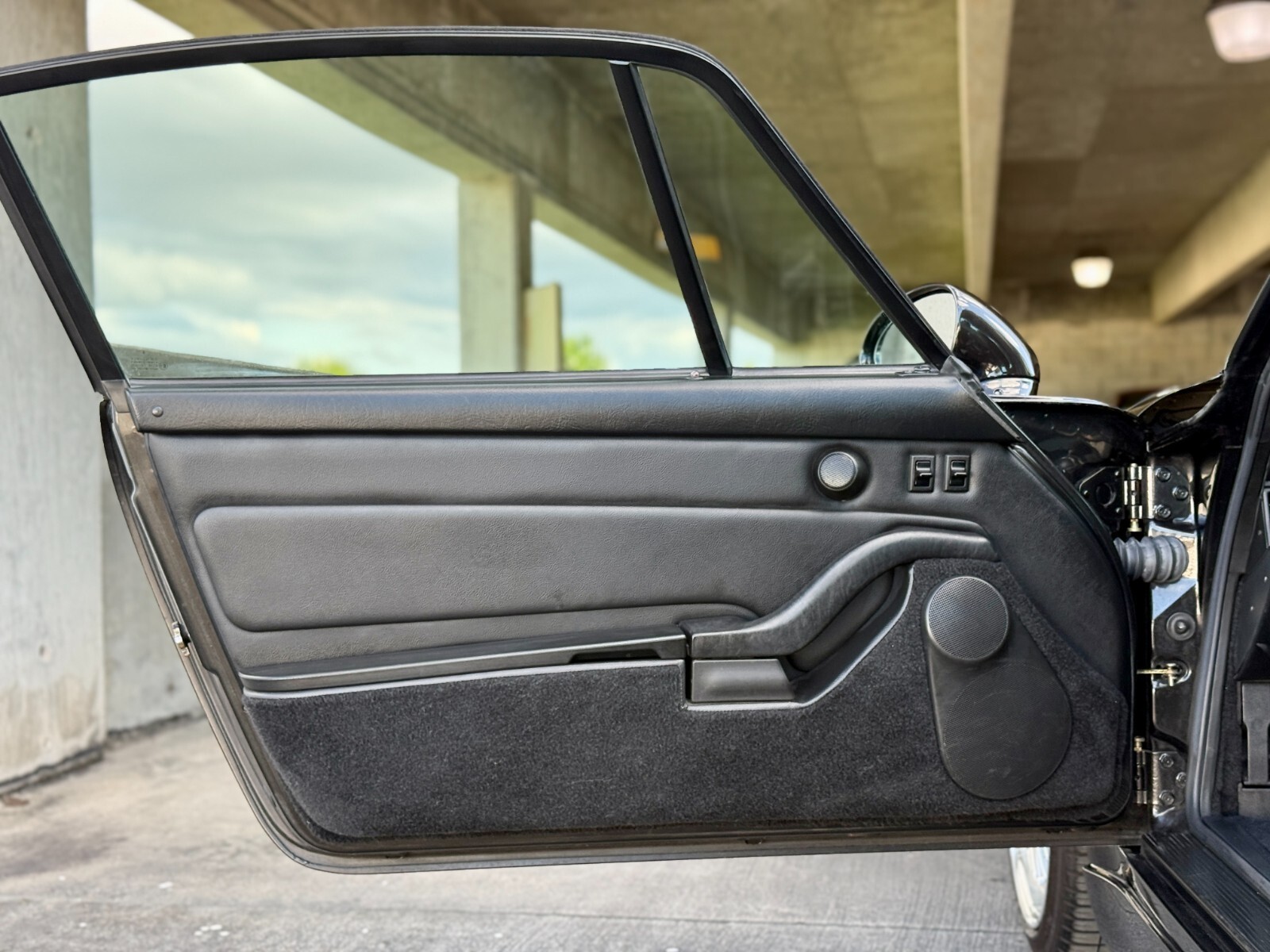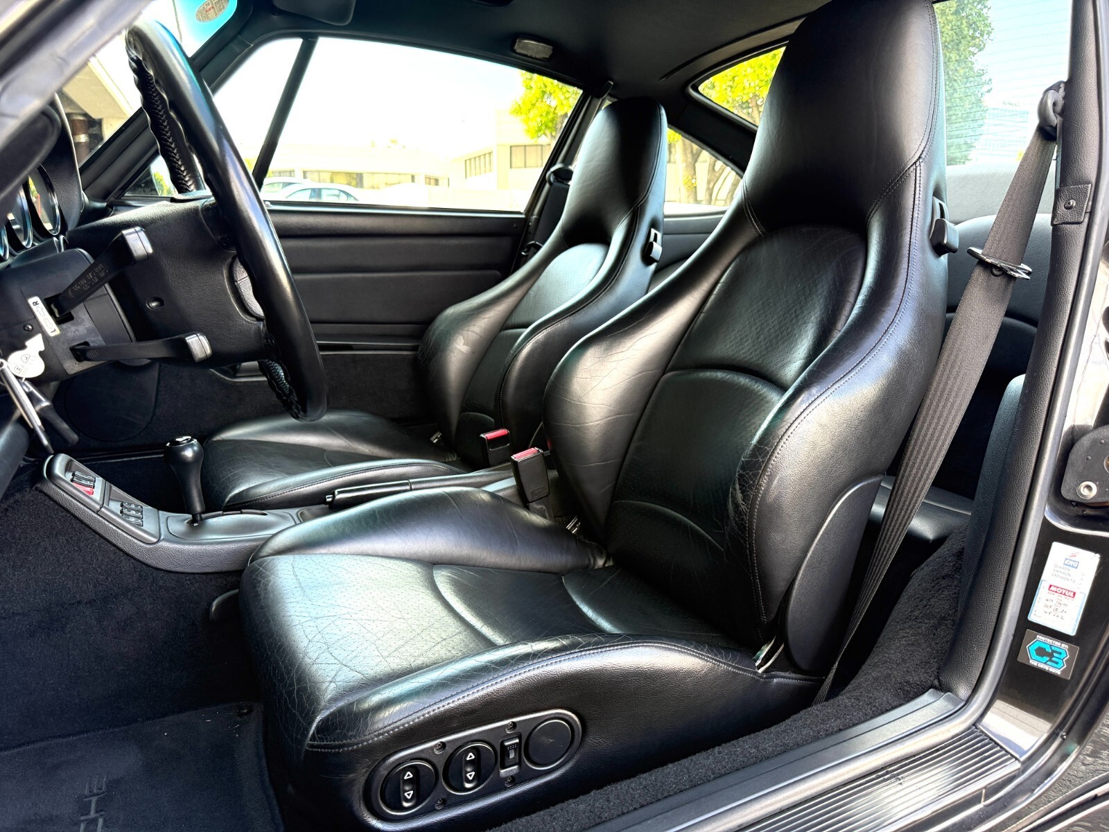 The interior is trimmed in black leather and features power-adjustable sport seats, a leather-wrapped steering wheel, and Porsche-branded floor mats. Equipment includes air conditioning, power windows, and an updated stereo system. The dashboard, door panels, and carpeting present in very good condition, with minimal wear consistent with careful ownership.