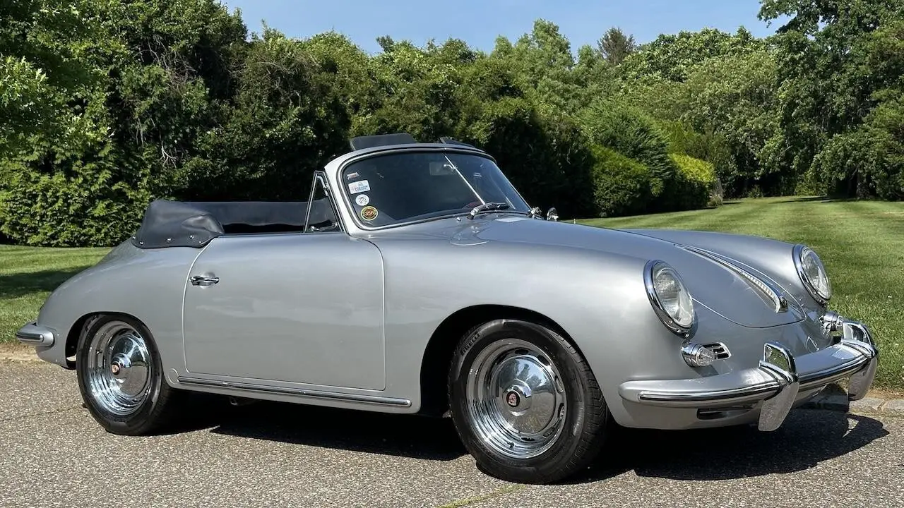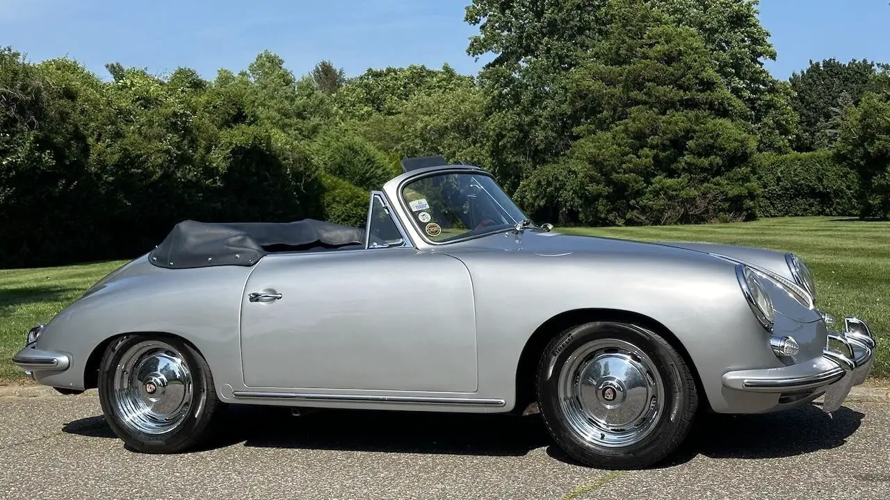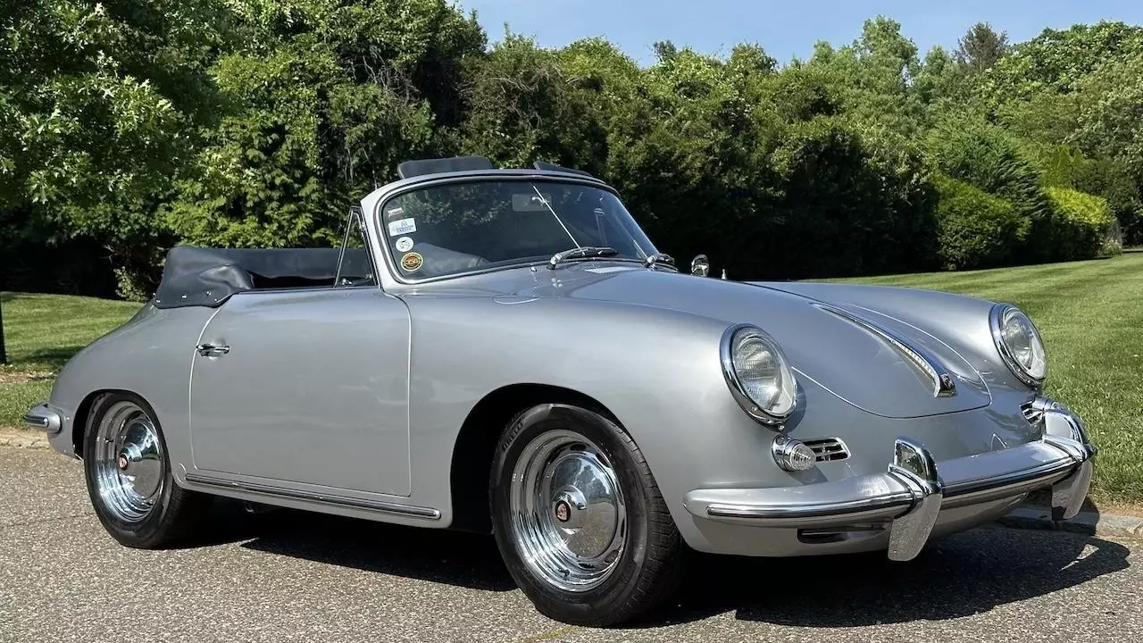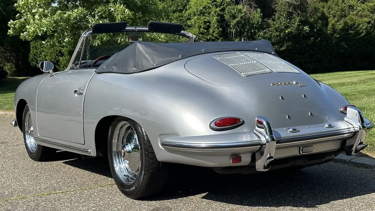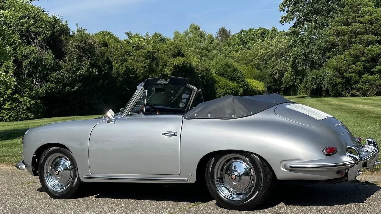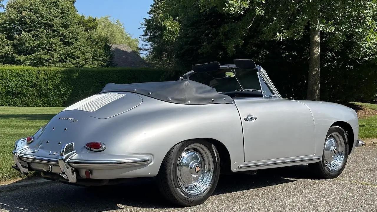 1962 Porsche 356B Cabriolet. This is a numbers matching example that has been extensively restored and is in excellent condition. Finished in silver over a navy leather interior.