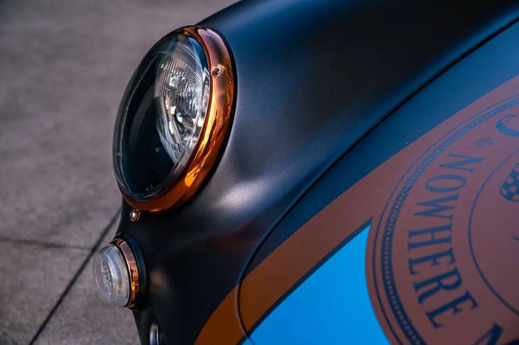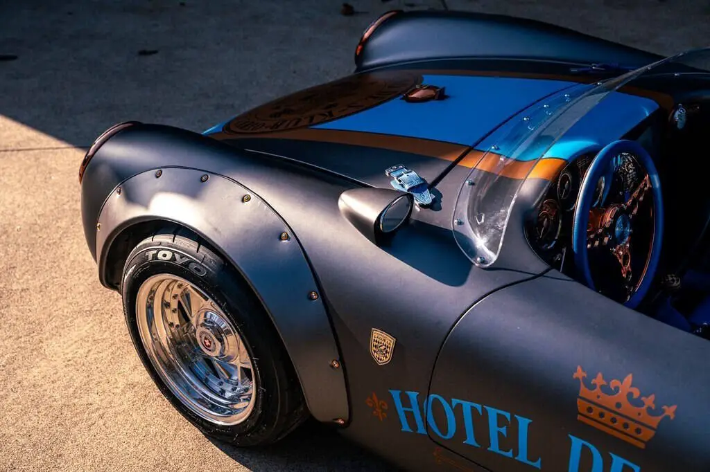 This custom widebody build wears a Hotel De Slang-themed wrap over an opulently reworked cabin. Power comes from an angry copper detailed 1915cc flat-four through a Freeway Flyer 4-speed. Features include a ducktail rear spoiler, short Speedster windshield, and vintage HRE 505s.