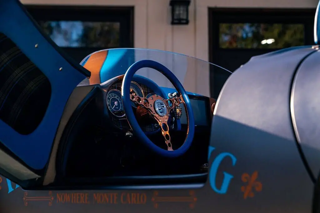 The interior, trunk, and clamshell are fully trimmed in quilted blue leather that extends to the leather-wrapped tube frame. Copper accents appear throughout, including the copper steering wheel and a leather-wrapped fuel tank with through-hood copper filler. Instrumentation includes plaid-backed speedo, tach, and combo gauges, plus a vintage Heuer stopwatch and Sony head unit powered by a McIntosh amp.