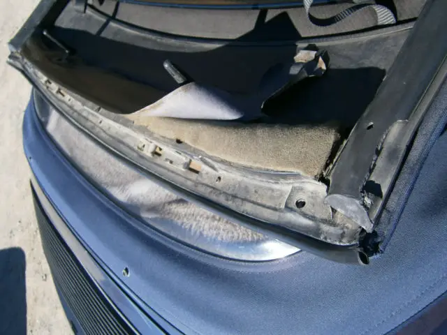This vehicles runs and drives well, but is sold as is. I will outline some issues that I have noticed. There are some paint nicks in several places with a couple of minor dings, but no dents. There are scratches on the drivers door from opening (see photo). The power windows work, but the window tinting needs to be replaced. I believe the car needs an alignment, or perhaps just have the wheels balanced. The rear tires are in good condition, but the front should be replaced and show some uneven wearing. The wheels are in great to excellent condition. A new top was installed about 11,000 miles ago, but 16 years ago. Please see the photo of the area needing some adhesion work. In a recent drive I noticed that oil pressure gauge was not moving although there clearly was oil pressure. The power seats have not been working. The passenger and jump seats are in good condition, and the drivers seat has some wearing/tearing along the side bolster.