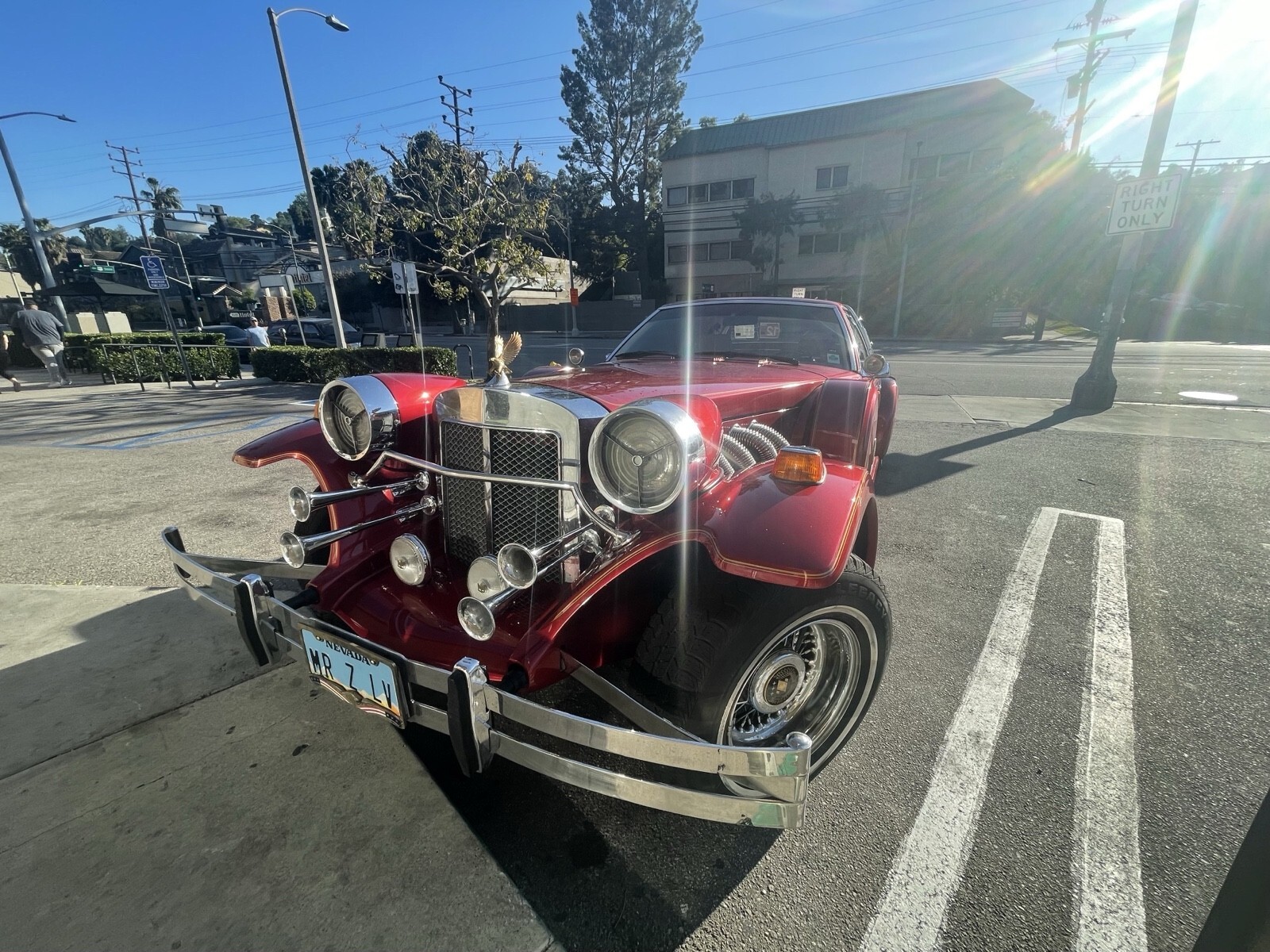 At the intersection of luxury, custom, and uniqueness is this 1982 Zimmer Golden Spirit. With proportions and styling from the 1930s atop a Mustang chassis, it combines dramatic looks with all the right modern conveniences. Here's classic Mercedes style with American flair. The Zimmer Golden Spirit was a hand-built, limited production car that was expensive to buy when new and cherished by the lucky few who could pick one up. You can tell this was cared for just by the condition of the custom bodywork. There are coordinating elements, such as the full-length pinstripe that also highlights the covered spare style in each fender... there's even another on the rear! The rare Wine Red Sparkle CandyApple paint has the look of originality, and 40 years later, that does mean showing its age. But the real understanding of how this represents premium is how the body lines and gaps all have the flowing look of a respected classic. This car was about showcasing its opulence, and today it has matured into a style all its own. After all, where else are you going to find a car with a vinyl roof that matches the padding on the trunk? Plus, the complete brightwork reminds us of the classic pre-war cars of Europe in places like the waterfall grille, quad horns, tri-bar headlight covers, dual push bumpers, side exhaust port decoration, landau roof bars, and wire wheels. And this one even lives up to its golden name with the bold golden eagle leading the way.