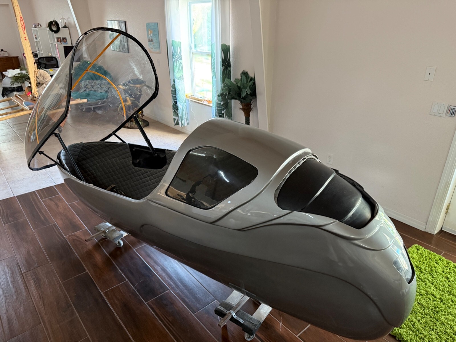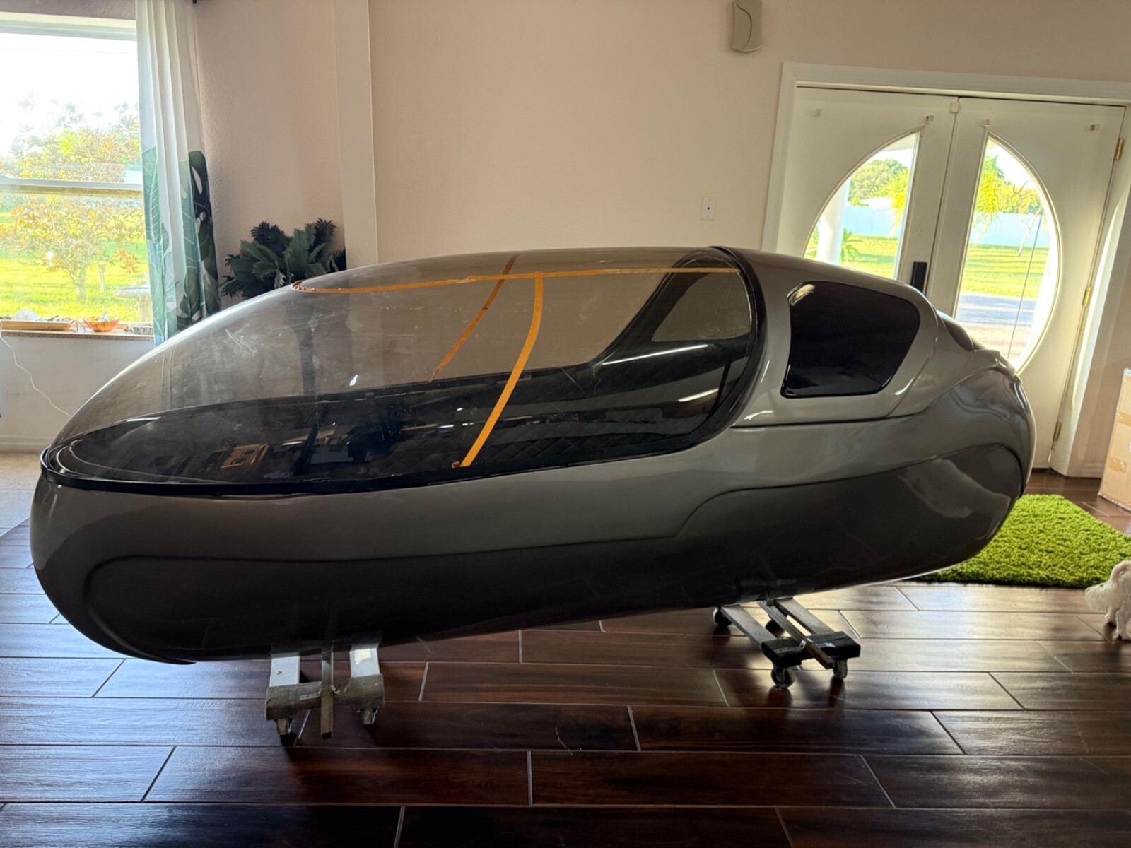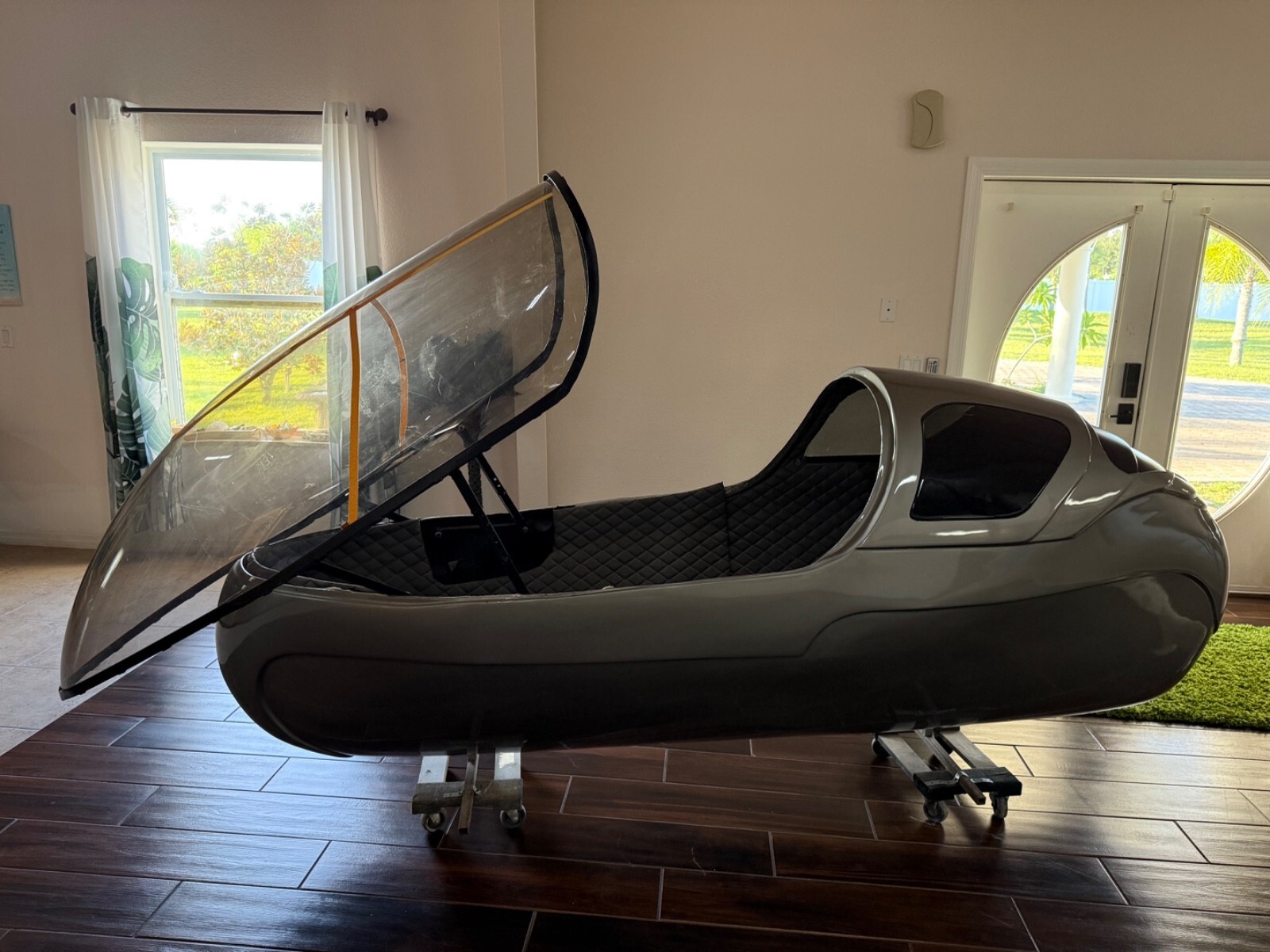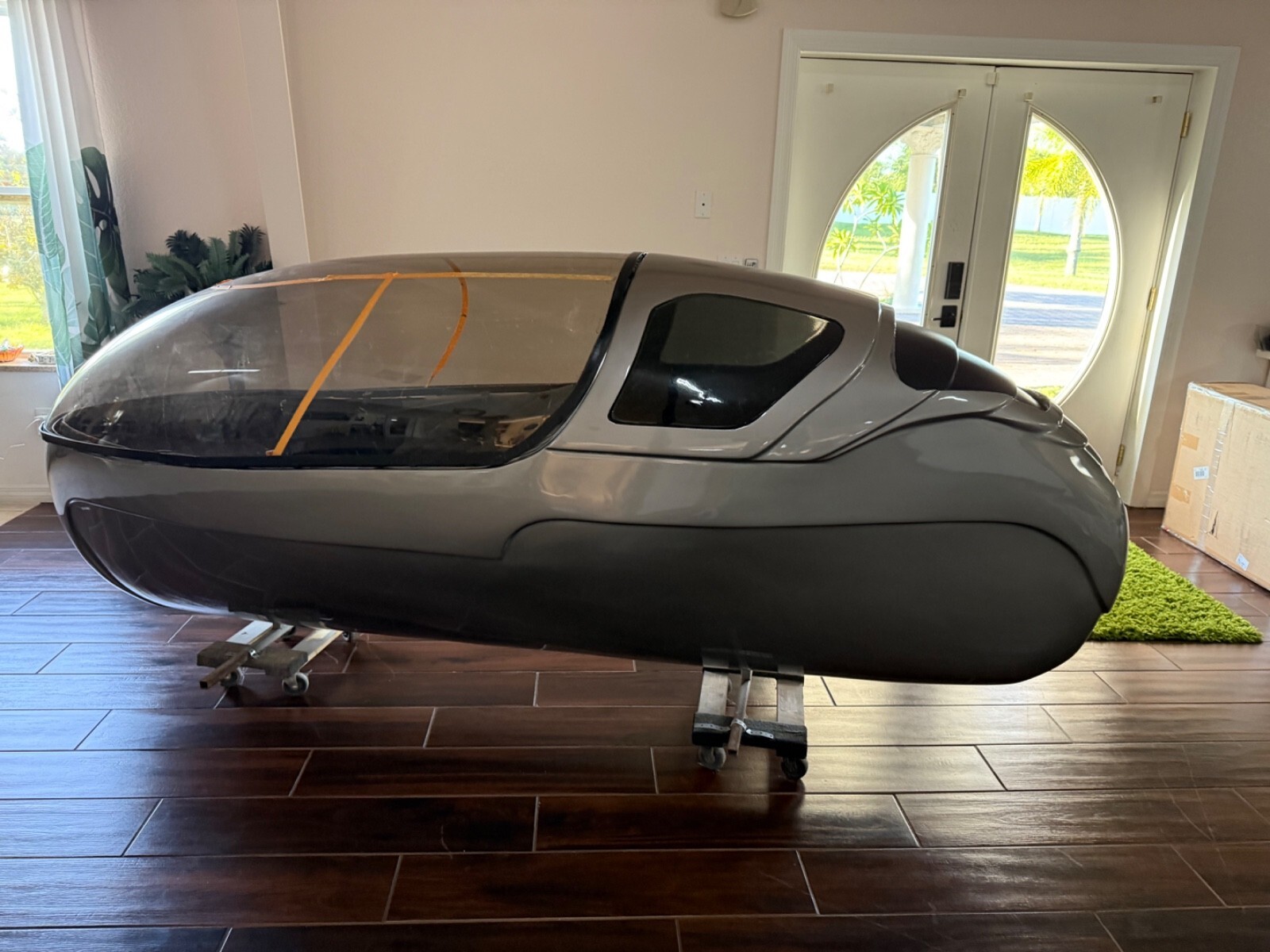 This is a fiberglass empty shell of a flying, floating pod. Good for futuristic movi, marketing or other ideas...The canopy is a jet canopy which is motorized to open and close. the interior is simply padded with silver pattern diamonds on the entire inside vinyl. The unit comes as pictured. Length is 9 1/2 feet, height is 52" and width is 36". Weight is 150 pounds.
