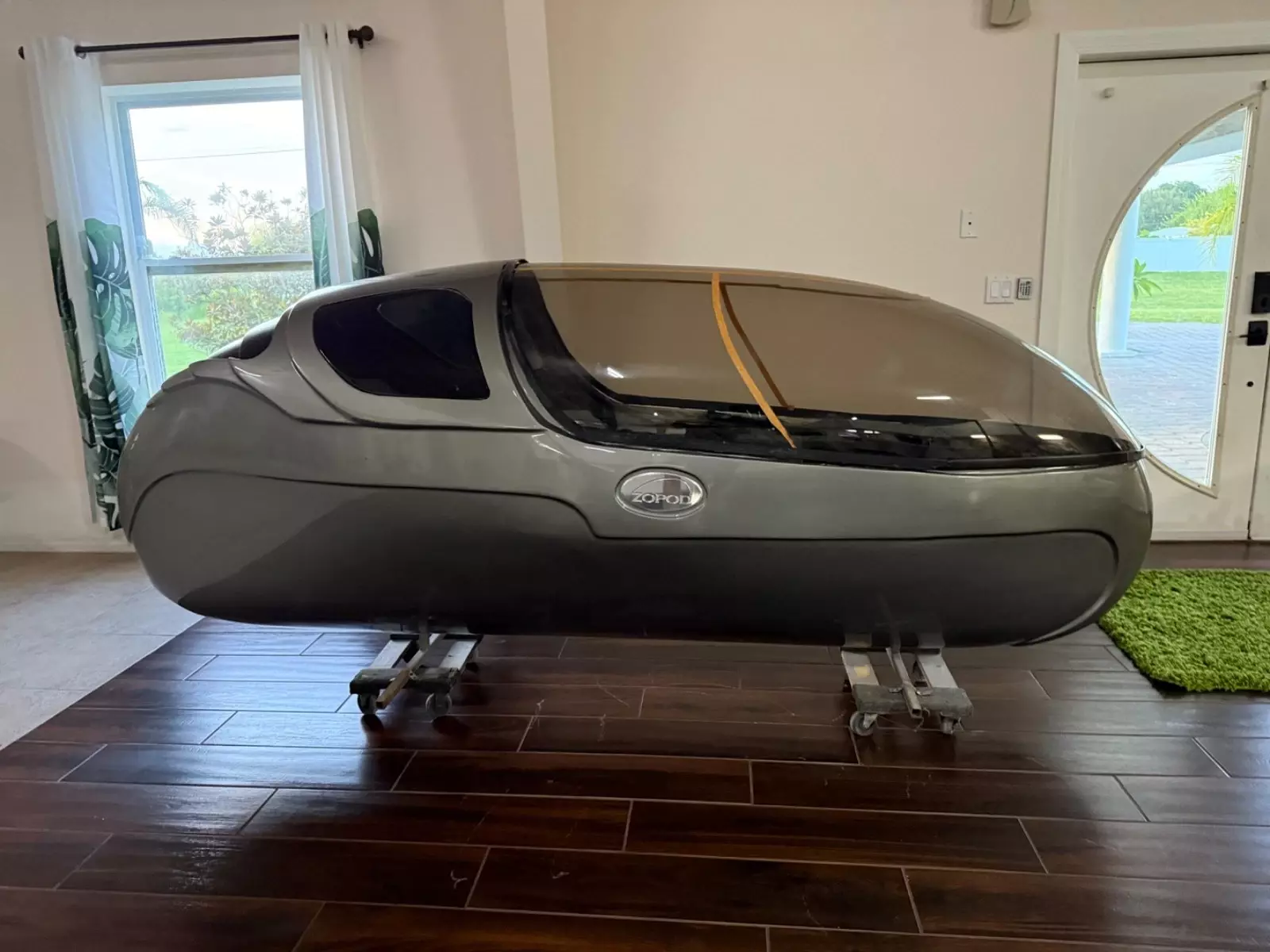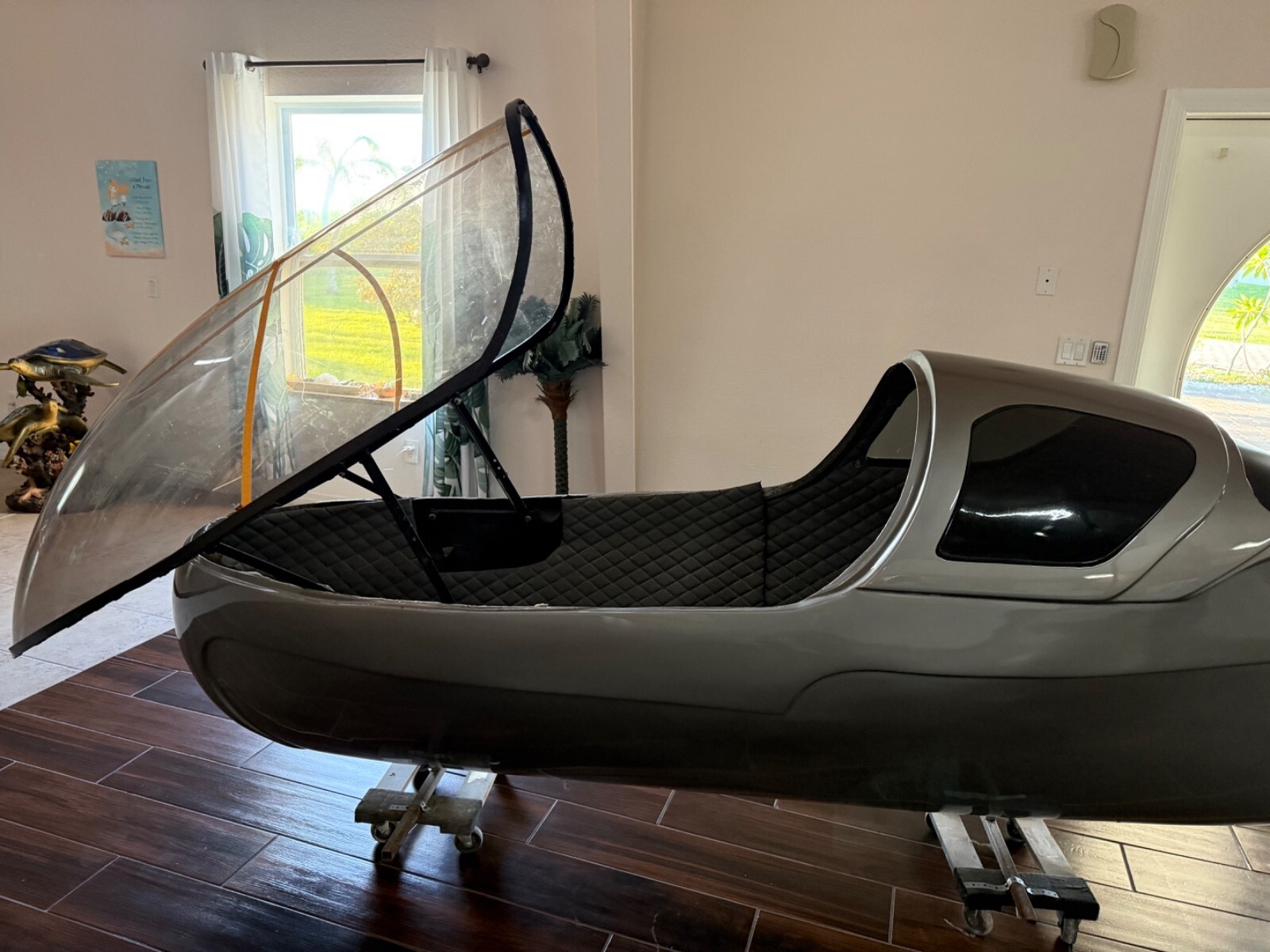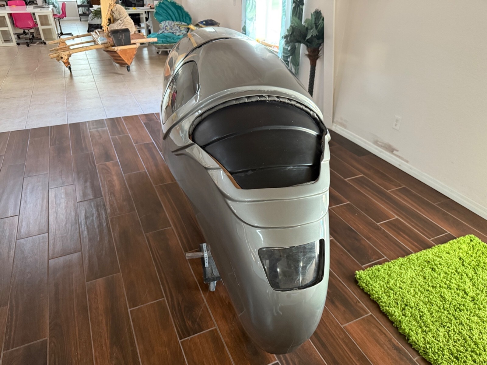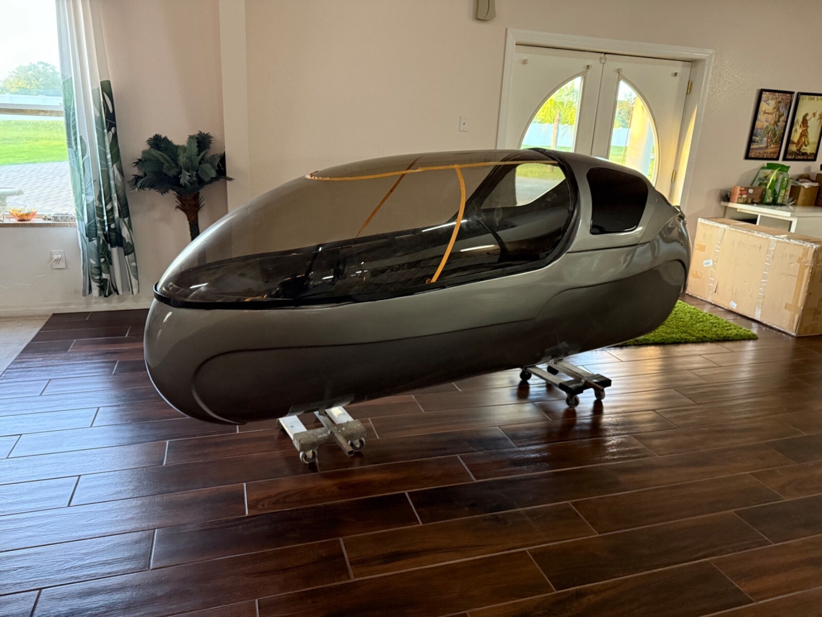This is a fiberglass empty shell of a flying, floating pod. Good for futuristic movi, marketing or other ideas...The canopy is a jet canopy which is motorized to open and close. the interior is simply padded with silver pattern diamonds on the entire inside vinyl. The unit comes as pictured. Length is 9 1/2 feet, height is 52" and width is 36". Weight is 150 pounds.