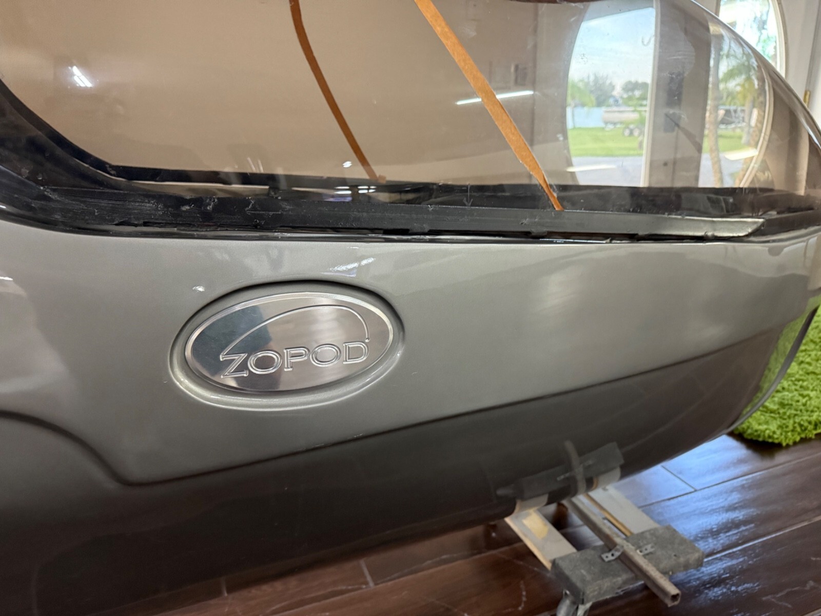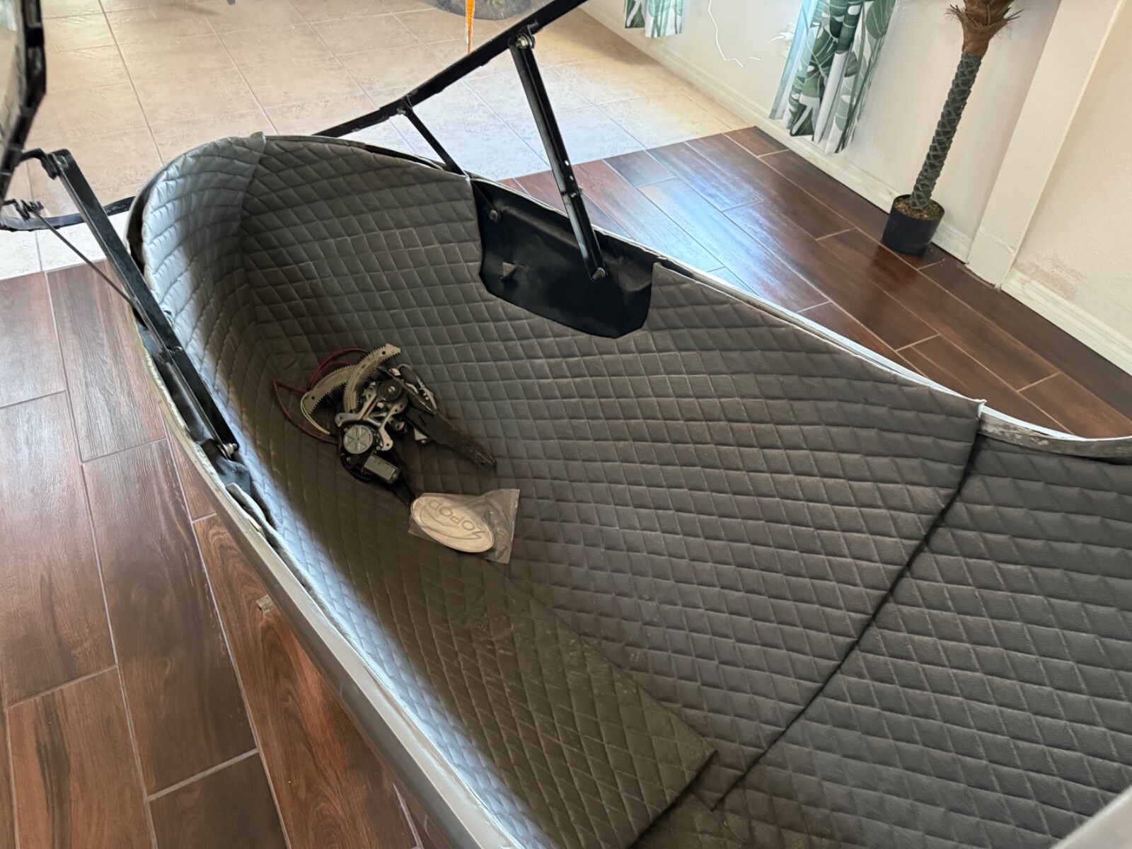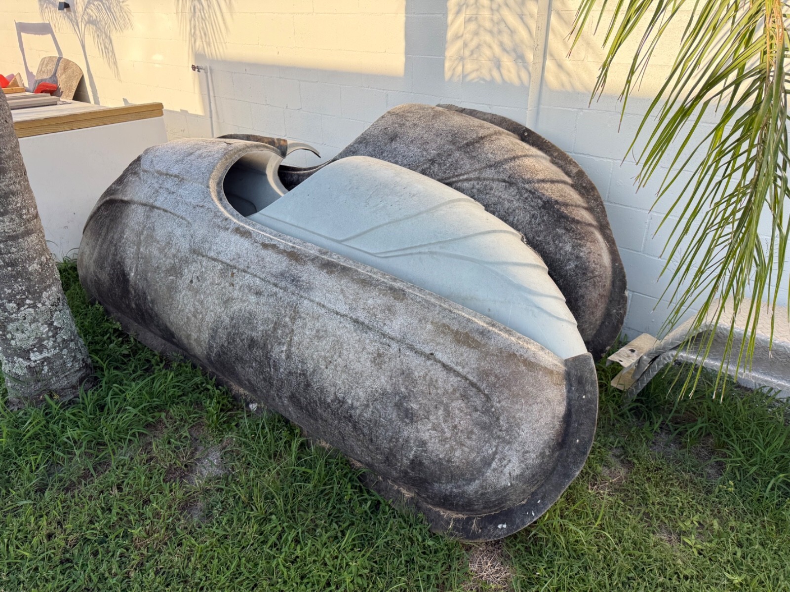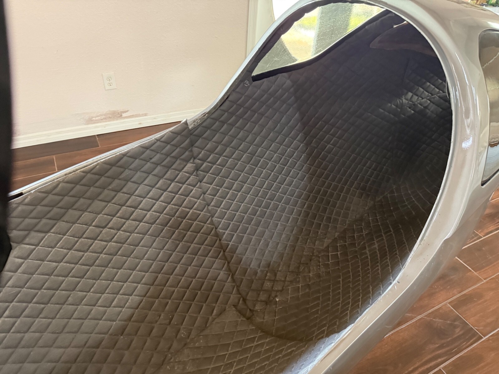 This is a fiberglass empty shell of a flying, floating pod. Good for futuristic movi, marketing or other ideas...The canopy is a jet canopy which is motorized to open and close. the interior is simply padded with silver pattern diamonds on the entire inside vinyl. The unit comes as pictured. Length is 9 1/2 feet, height is 52" and width is 36". Weight is 150 pounds.