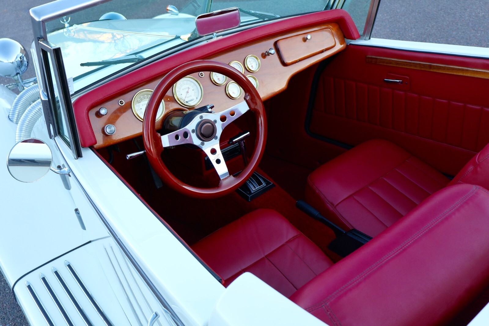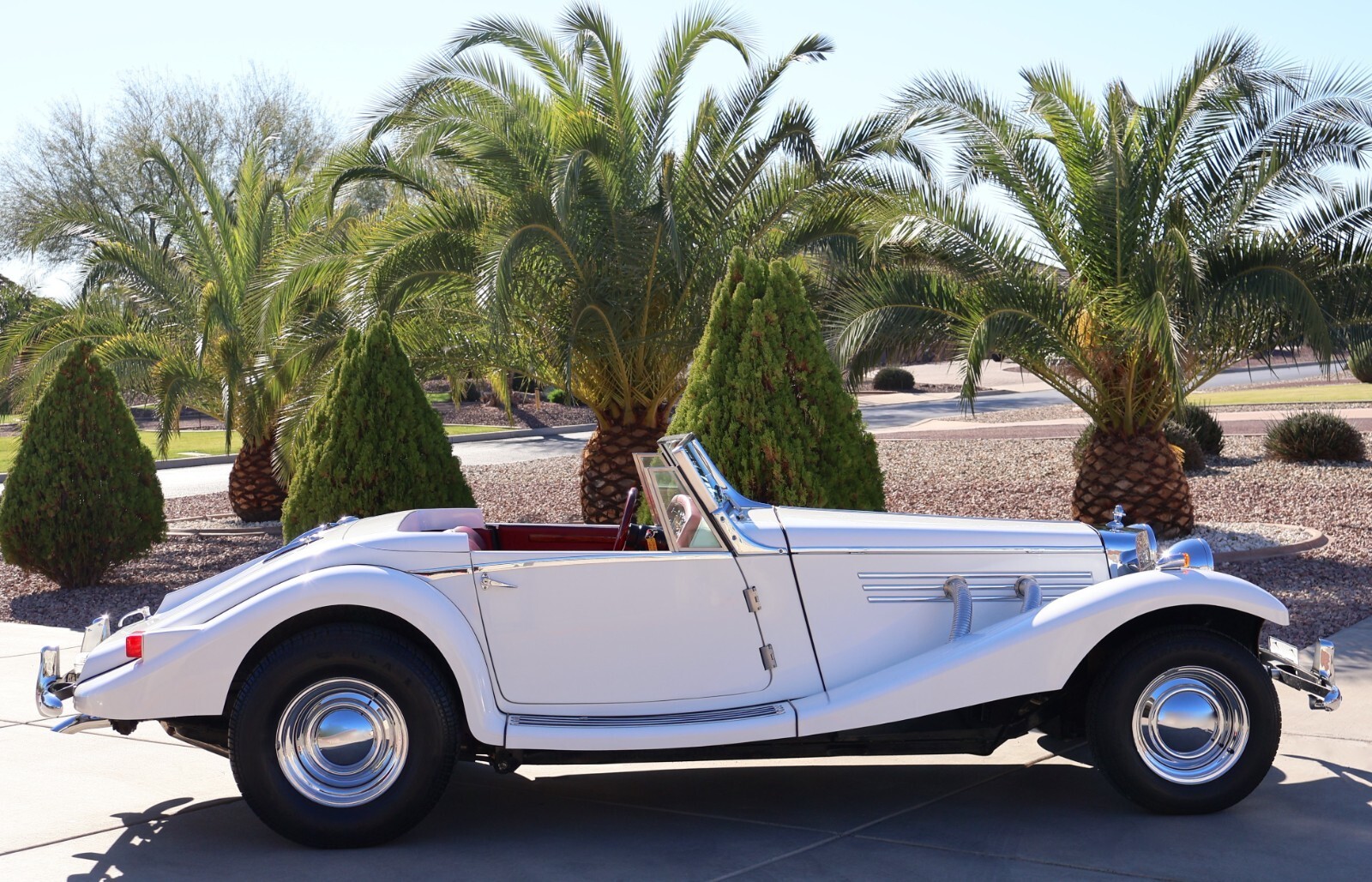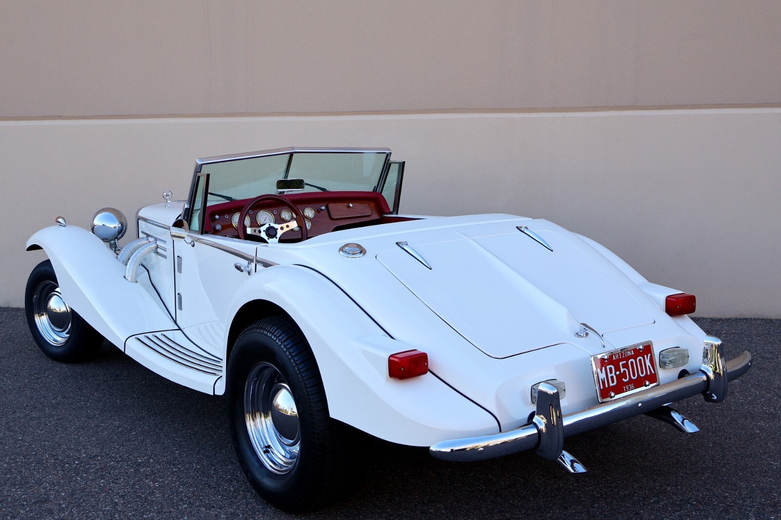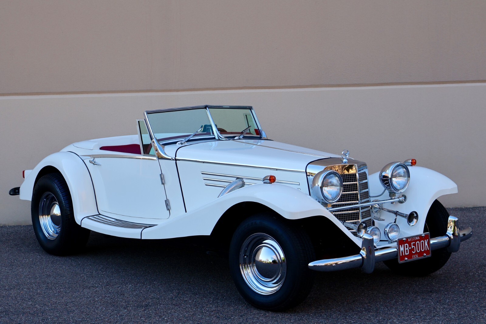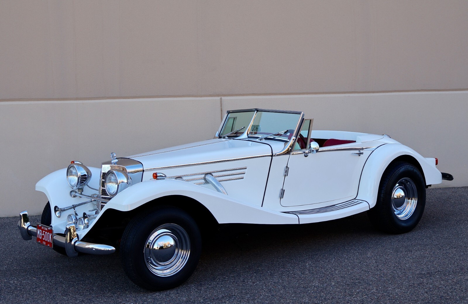 Up for sale we have a 1936 - 500K Replica Marlene built by Classic Roadsters Ltd. in Fargo, North Dakota. This Mercedes tribute is finished in a nice and shiny white blue gelcoat with a red interior. Plenty of eye catching chrome accents and prewar features all around such as the ornamental supercharged exhaust pipes on both sides of the hood, elegant chrome body molding, prewar style grill with hood ornament, antique headlights and spotlights, vintage horn trumpets, split windshield, dual exhaust pipes and much more to be mentioned. This Marlene is fitted with four brand new hot rod staggered wheels and classic tires. The interior offers a nice wooden dash with Gold Bezel Classic Instruments gauges and a Kenwood stereo system with Memphis speakers installed behind the seats, features red seats with matching door panels and clean red carpeting found throughout, the spacious rear trunk compartment is also carpeted in black, overall a very nice and clean interior that's been well taken care of. This 500K replica is powered by a new Ford V8 - 289 Ford Mustang I engine mated to an automatic transmission, very clean engine compartment, nicely dressed with Edelbrock intake manifold, Edelbrock carburetor and air cleaner, thick fiberglass body, so no rust, all in good working order, the car runs, drives, and brakes as it should, clean undercarriage, a very nice weekend toy. This 500K Roadster comes with a brand new convertible soft top including the frame/bows, never installed on the car and a nice fiberglass wing / tonneau cover as seen in the convertible top photo. Included in the sale is the Marlene Brochure and Assembly Manuals and a lot of building process photos and documentation. Sold as miles exempt, we don't know if the odometer is accurate, very nice but not new or perfect, completed in 2023 and mostly parked after that, driven only on nice weekends, first titled in September 2025, Clean Title in hand, this unique prewar style automobile is ready to go to a new home, here is your chance to own one for less $ ..... these 500K Marlene Recreations sell for much more !
