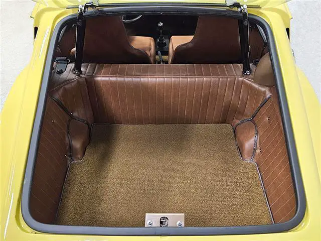 The interior was likewise restored to mostly stock condition with a few choice upgrades. Dynamat was used throughout the interior to control noise and heat, and virtually everything inside the car is new. The seats and door cards were upholstered in correct corduroy fabric, the original VDO gauges, switches, and dashboard were restored, and there’s a new smaller Personal-Saab steering wheel. The door moldings, which usually crumble to dust after more than 50 years, were replaced with CNC pieces and wrapped in correct vinyl. In the dash, a modern Retro-Sound radio was installed with original-style knobs, along with a hidden antenna and speakers discreetly fitted throughout the interior. The only notable modification is the control head for the Holley Sniper EFI system, which can be neatly hidden in the glove box for a completely OEM look. There’s a correct vinyl headliner overhead and a beautifully finished cargo compartment out back, which also includes a Saab 900 space saver spare with lug bolts and tool kit.