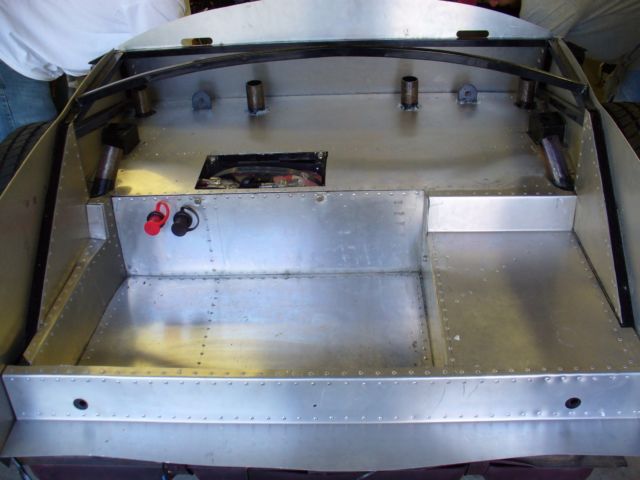There are extended foot boxes on both the passenger and driver side protected from engine heat by Dynamaxaluminum-backed pitch. Also, there is an extra 5” of depth in the trunk and the battery is hidden and covered in the trunk. The brakes have power assist and there is a footrest next to the clutch pedal.Both the hood and the trunk are lined and both have pneumatic openers. There are padded door panels with pockets and aluminum door sills to protect the fiberglass from scuffs. the frame is powdercoated.