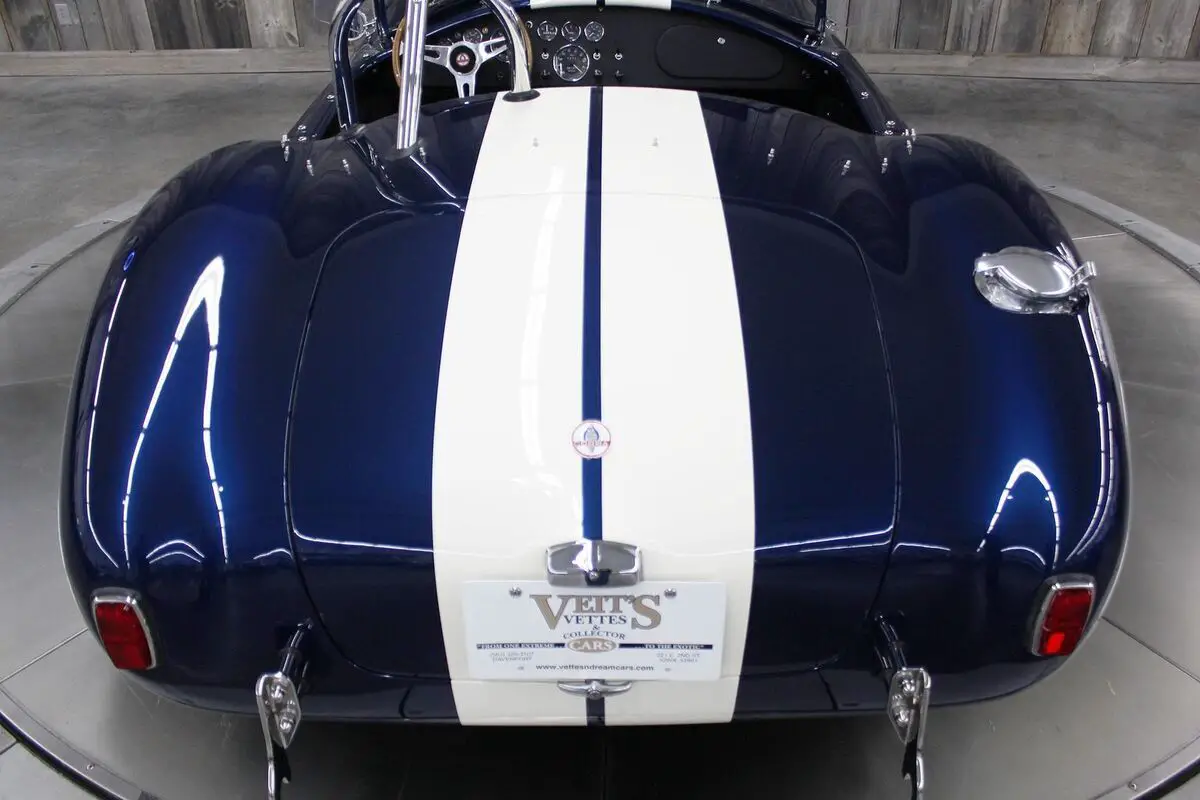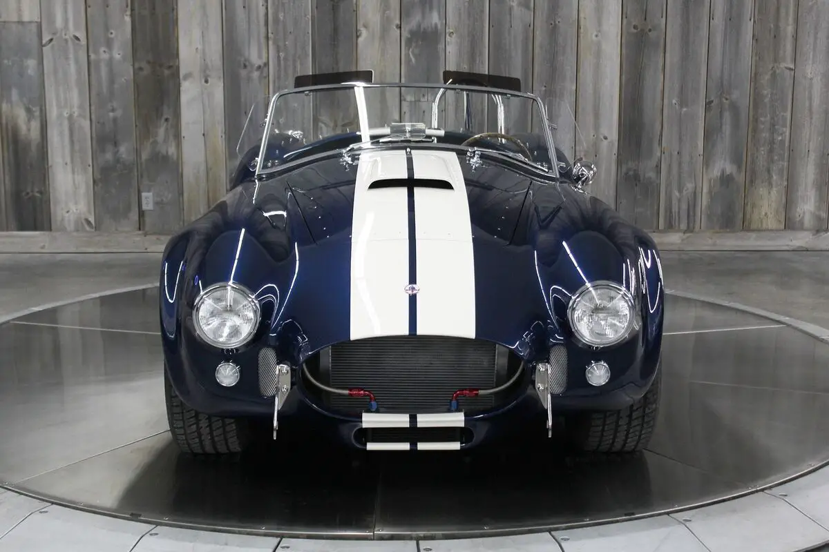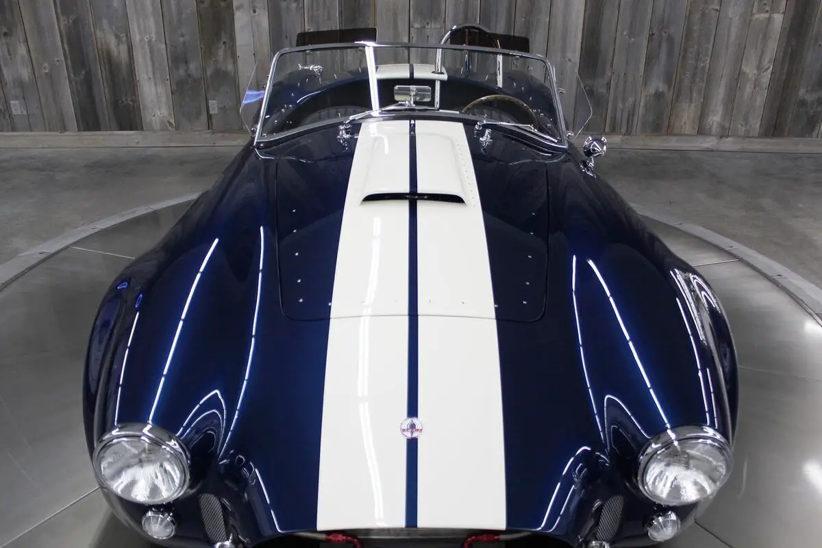 Vehicle Original VIN : IA044174’65 Cobra Superformance – Indigo Blue with Wimbledon White Stripes. The SPO # 3229 was built in 2017 and the drive train was installed in May 2019. One owner car. Driven only 702 miles. PERFORMANCE ENGINEERING ADDED OPTIONS: Roush 427R (small block) polished engine package, Dual disc clutch kit upgrade, Runner kit with Tremec 5-speed 4617 transmission. 427 Cobra side emblems and Cobra round hood and trunk emblems, Braided line upgrade in engine compartment. 4-wheel alignment, force balance wheels, and tires, Chrome 3" dia fire extinguisher with mounting hardware, expansion tank and polish, misc. Ventureshield clear rear fender protection from Advanced Paint Protection. Superformance carb to firewall linkage with Heim joints and ball socket studs. 700 miles since built. STANDARD EQUIPMENT: Show quality two-stage paint finishes. Hand-laminated fiberglass body with reinforcing inserts. Heavy duty TIG welded ladder frame chassis with crumple zones. Fully independent front and rear suspension. Limited slip differential. Willwood® power-assisted vented disc brakes (4-pot calipers front, single-pot calipers rear). Custom crafted coil-over shocks. Side and rear view mirrors. Original style pedals, catches and fittings. Original style shifter and hand brake lever. Carpeted interior and trunk, aluminum finished firewall. Sun visors and wind wings. Wipers & washer, heater/defogger. Leather seating surfaces (drivers adjusts). Original style latch-lock seat belts. Moto - Lita wooden steering wheel. Monza style filler. (locking gas cap). Aluminum, single core hi-performance radiator, shroud and dual fans. Oil cooler and braided lines. Stainless steel fuel tank 17 gallons (pressure tested). Original style side pipes and headers to accommodate Ford based V8 engine. Original style gauges (Smith) and switches (Lucas) reverse 180mph speedometer. Stainless steel roll bar, chassis mounted. DIMENSIONS and CAPACITIES: Wheelbase: 90", Length: 152", Height (Top of screen): 48", Width (Overall): 69", Track Front: 54", Track Rear: 57", Fuel Tank: 17 gal., Aluminum pin drive “Halibrand” style wheels, Front Wheels: 15" x 8J, Rear Wheels: 15" x 10J, Tires-Front 255/60 R15 Tires-Rear 275/60 R15, Ford Super 8.8 differential. Ratio 3:55:1, Empty Weight: 1,840 lbs., 427 Motor 2,590 lbs. CHASSIS: Jig-welded parallel ladder frame of heavy wall 2" x 4" rectangular steel tubing with large diameter outriggers. frame incorporates front and rear crumple zones. The door hinge, steering column, and windshield pickup points are incorporated onto the main chassis. BODY: Hand-laid fiberglass panels with steel tube reinforcements in all openings. Where the body points carry loads they are reinforced with steel bars or panels. The body is bonded to the chassis and is completely non-stressed. Supplied painted in base coat and clear coat urethane finish. FRONT & REAR SUSPENSION: The front sports fully independent unequal length A-arms with adjustable coils over telescopic shock absorbers, while the rear is also independent unequal length A-arms, with fabricated hub carriers and coil-over shock absorbers. STEERING: Rack and pinion. Original style steering wheel. PEDAL BOX: Fabricated steel plate pedal box assembly with adjustable pedal pads. Incorporates brake booster and master cylinder assembly with hydraulic clutch actuation. FRONT BRAKES: Ventilated disc with 4-pot calipers. REAR BRAKES: Ventilated disc. Cable-operated hand brake actuates rear brakes. EXHAUST SYSTEM: Superformance MK III: Side-mounted exhausts to original specifications. Superformance Roadster: Custom-made muffler and tailpipes with stainless extensions. GENERAL: Latest technology single row high-performance aluminum core radiator with 2 thermostatically-controlled electric fans; original specification oil cooler; hand fabricated stainless steel engine louvers; heater unit with 2-speed fan; original style wiper assembly with 2 speeds and 140-degree wiper arc; hand fabricated windshield assembly to original specification, chrome plated. INSTRUMENTATION/CONTROLS: Original style instruments specially manufactured by Smiths of England, fitted to original S/C and Roadster layouts. Hand-crafted shifter and handbrake. REAR-END: Ford Limited slip differential. Ratio 3:55:1 as standard equipment. INTERIOR: Hand-made seats upholstered in German specification automotive leather. Fully carpeted floor, center console, sides, and rear firewall. Slide adjusters for driver's seat. Tonneau cover and soft top supplied as optional equipment. Hard top optionally available. WHEELS: Optional 15" or 18" knock-off wheels. (Validate entire description for accuracy before bidding/purchasing)