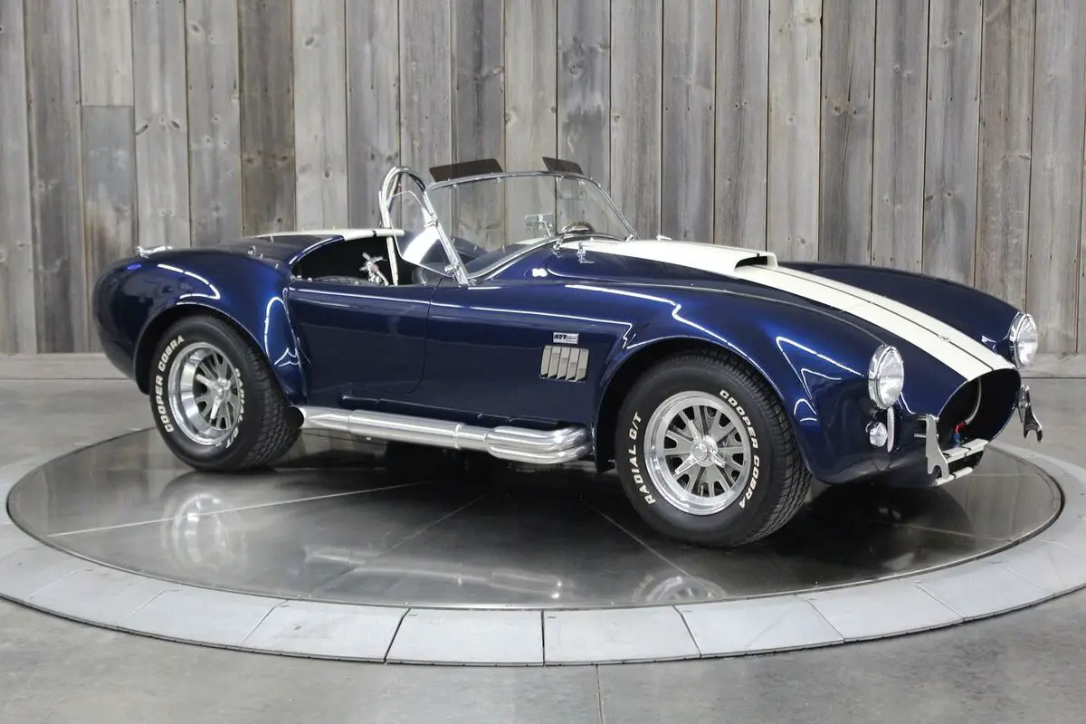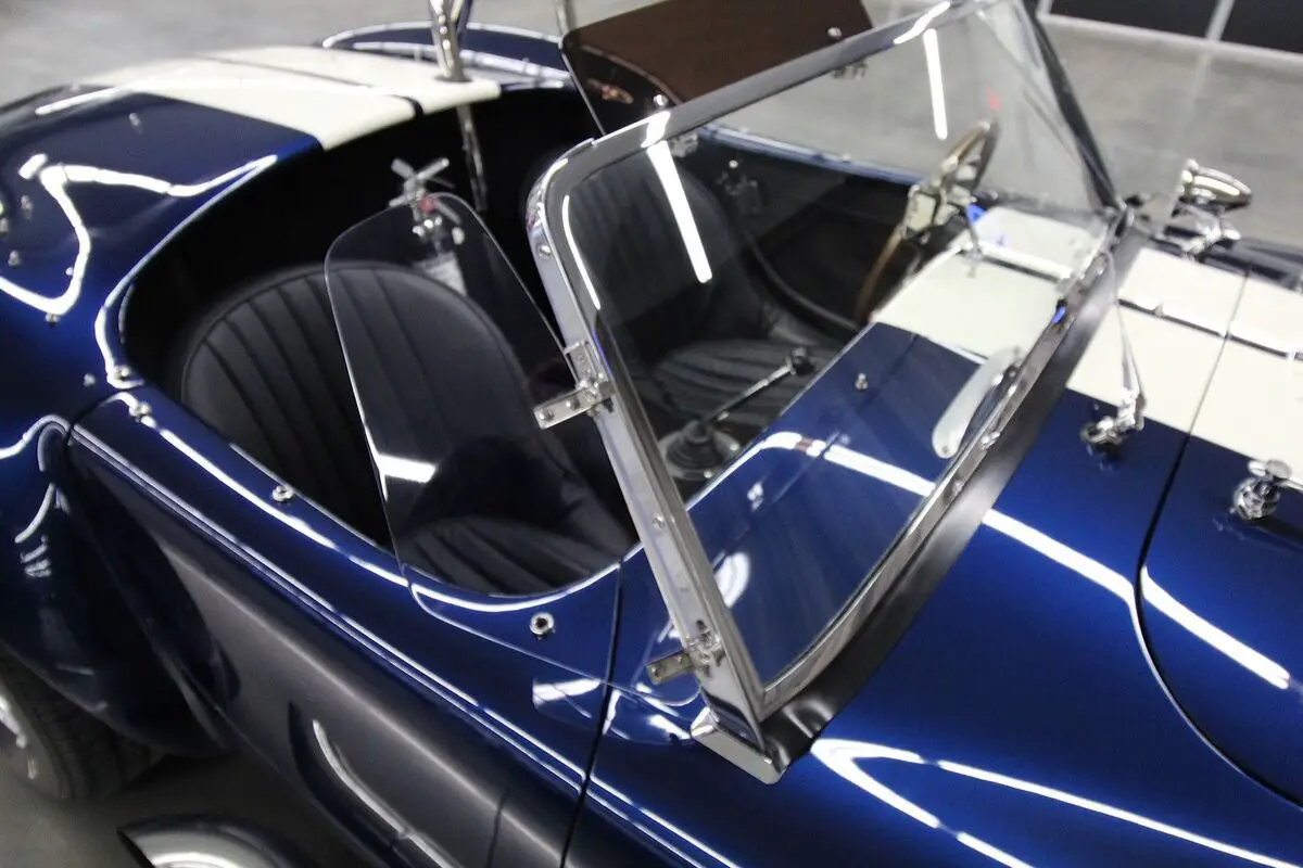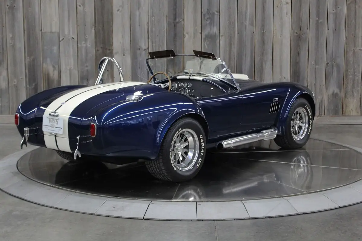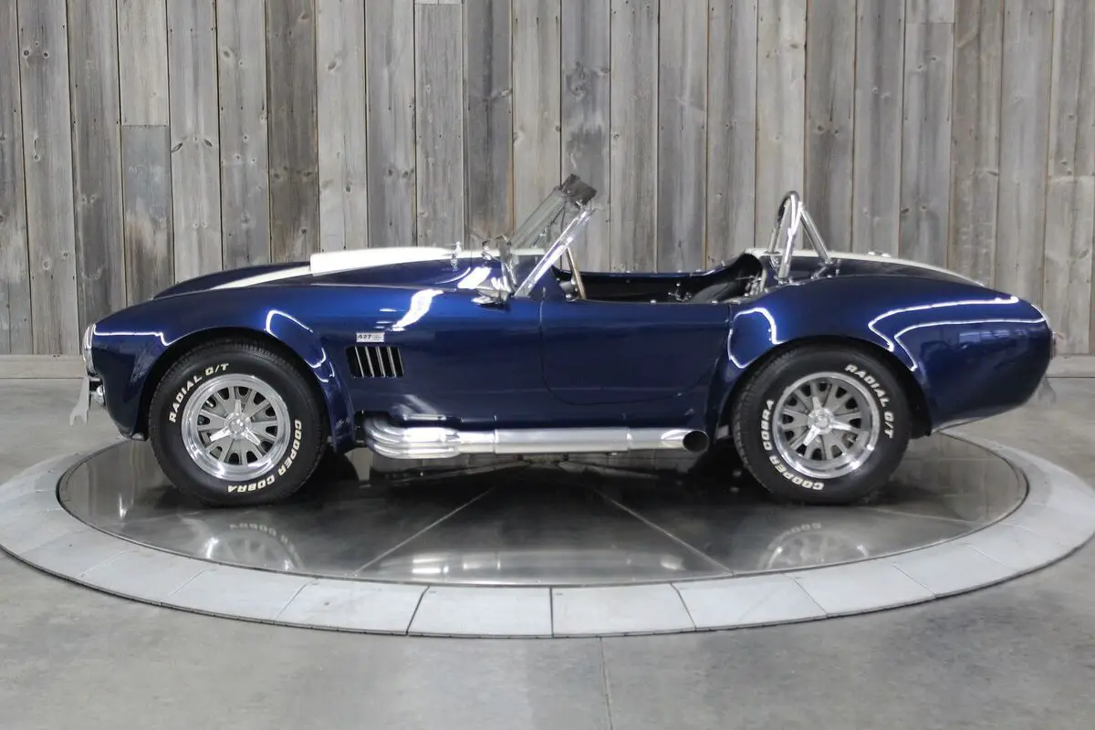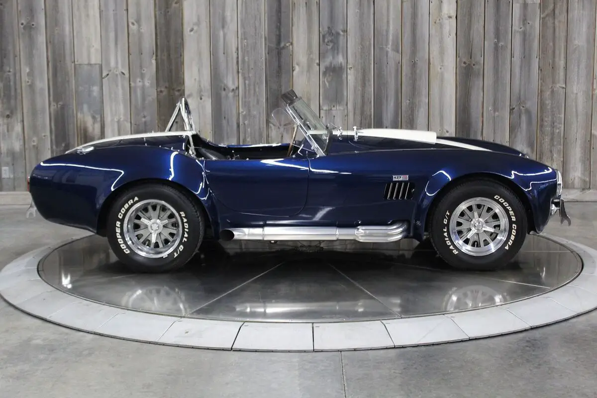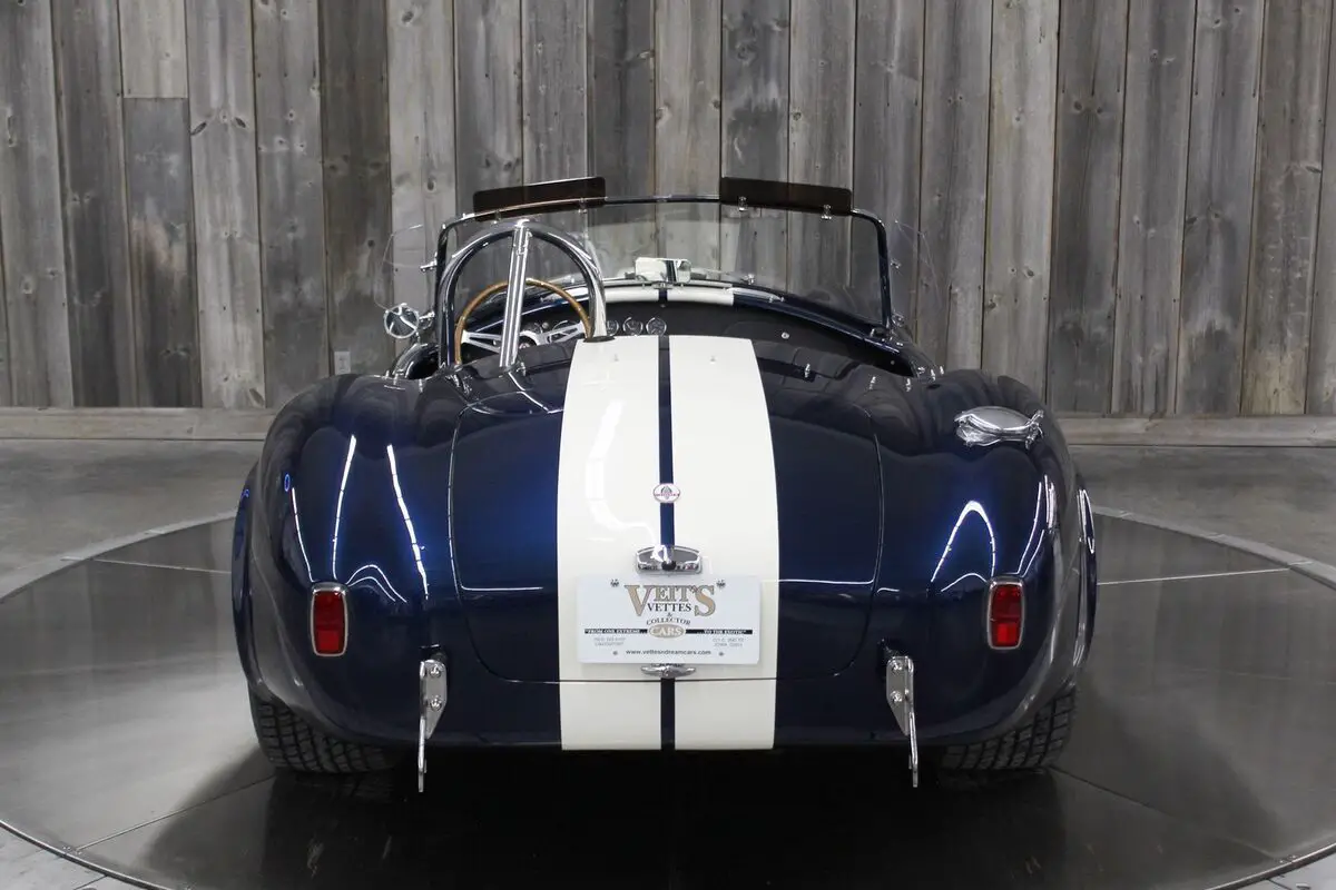 ’65 Cobra Superformance – Indigo Blue with Wimbledon White Stripes. The SPO # 3229 was built in 2017 and the drive train was installed in May 2019. One owner car. Driven only 702 miles. PERFORMANCE ENGINEERING ADDED OPTIONS: Roush 427R (small block) polished engine package, Dual disc clutch kit upgrade, Runner kit with Tremec 5-speed 4617 transmission. 427 Cobra side emblems and Cobra round hood and trunk emblems, Braided line upgrade in engine compartment. 4-wheel alignment, force balance wheels, and tires, Chrome 3" dia fire extinguisher with mounting hardware, expansion tank and polish, misc. Ventureshield clear rear fender protection from Advanced Paint Protection. Superformance carb to firewall linkage with Heim joints and ball socket studs. 700 miles since built. STANDARD EQUIPMENT: Show quality two-stage paint finishes. Hand-laminated fiberglass body with reinforcing inserts. Heavy duty TIG welded ladder frame chassis with crumple zones. Fully independent front and rear suspension. Limited slip differential. Willwood® power-assisted vented disc brakes (4-pot calipers front, single-pot calipers rear). Custom crafted coil-over shocks. Side and rear view mirrors. Original style pedals, catches and fittings. Original style shifter and hand brake lever. Carpeted interior and trunk, aluminum finished firewall. Sun visors and wind wings. Wipers & washer, heater/defogger. Leather seating surfaces (drivers adjusts). Original style latch-lock seat belts. Moto - Lita wooden steering wheel. Monza style filler. (locking gas cap). Aluminum, single core hi-performance radiator, shroud and dual fans. Oil cooler and braided lines. Stainless steel fuel tank 17 gallons (pressure tested). Original style side pipes and headers to accommodate Ford based V8 engine. Original style gauges (Smith) and switches (Lucas) reverse 180mph speedometer. Stainless steel roll bar, chassis mounted. DIMENSIONS and CAPACITIES: Wheelbase: 90", Length: 152", Height (Top of screen): 48", Width (Overall): 69", Track Front: 54", Track Rear: 57", Fuel Tank: 17 gal., Aluminum pin drive “Halibrand” style wheels, Front Wheels: 15" x 8J, Rear Wheels: 15" x 10J, Tires-Front 255/60 R15 Tires-Rear 275/60 R15, Ford Super 8.8 differential. Ratio 3:55:1, Empty Weight: 1,840 lbs., 427 Motor 2,590 lbs. CHASSIS: Jig-welded parallel ladder frame of heavy wall 2" x 4" rectangular steel tubing with large diameter outriggers. frame incorporates front and rear crumple zones. The door hinge, steering column, and windshield pickup points are incorporated onto the main chassis. BODY: Hand-laid fiberglass panels with steel tube reinforcements in all openings. Where the body points carry loads they are reinforced with steel bars or panels. The body is bonded to the chassis and is completely non-stressed. Supplied painted in base coat and clear coat urethane finish. FRONT & REAR SUSPENSION: The front sports fully independent unequal length A-arms with adjustable coils over telescopic shock absorbers, while the rear is also independent unequal length A-arms, with fabricated hub carriers and coil-over shock absorbers. STEERING: Rack and pinion. Original style steering wheel. PEDAL BOX: Fabricated steel plate pedal box assembly with adjustable pedal pads. Incorporates brake booster and master cylinder assembly with hydraulic clutch actuation. FRONT BRAKES: Ventilated disc with 4-pot calipers. REAR BRAKES: Ventilated disc. Cable-operated hand brake actuates rear brakes. EXHAUST SYSTEM: Superformance MK III: Side-mounted exhausts to original specifications. Superformance Roadster: Custom-made muffler and tailpipes with stainless extensions. GENERAL: Latest technology single row high-performance aluminum core radiator with 2 thermostatically-controlled electric fans; original specification oil cooler; hand fabricated stainless steel engine louvers; heater unit with 2-speed fan; original style wiper assembly with 2 speeds and 140-degree wiper arc; hand fabricated windshield assembly to original specification, chrome plated. INSTRUMENTATION/CONTROLS: Original style instruments specially manufactured by Smiths of England, fitted to original S/C and Roadster layouts. Hand-crafted shifter and handbrake. REAR-END: Ford Limited slip differential. Ratio 3:55:1 as standard equipment. INTERIOR: Hand-made seats upholstered in German specification automotive leather. Fully carpeted floor, center console, sides, and rear firewall. Slide adjusters for driver's seat. Tonneau cover and soft top supplied as optional equipment. Hard top optionally available. WHEELS: Optional 15" or 18" knock-off wheels. (Validate entire description for accuracy before bidding/purchasing)