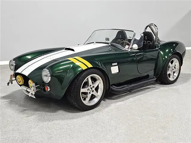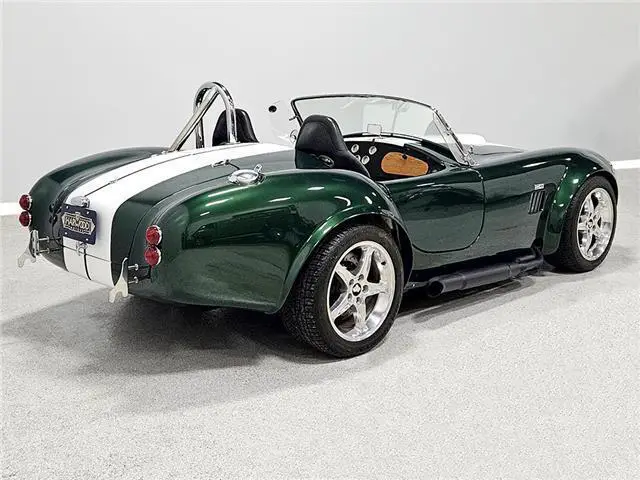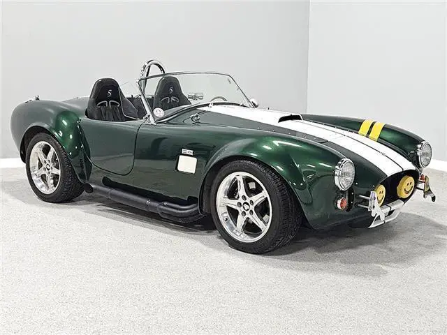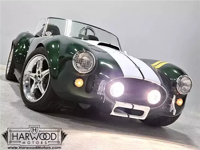 Vehicle Original VIN : 1664Well-built Factory Five Cobra roadster. Late-model Mustang Cobra 5.0 with Tremec 5-speed manual. Huge Wilwood disc brakes, AutoMeter gauges. Fully sorted, ready to rock Cobra that’s surprisingly easy to live with.This gorgeous Factory 5 Cobra is a great illustration of the virtues of factory engineering. It was built a few years ago but you can see that they guys doing the fiberglass work really did a nice job, because it’s smooth, the panels fit well, and there’s just no evidence that it’s ‘glass until you rap your knuckles on it. All the kit makers take a few liberties with the Cobra shape (nobody can tell without an original sitting nearby anyway), but the Factory 5 cars are more accurate than most and the stance on this one looks downright predatory. With two extra inches of wheelbase, there’s a bit more room inside, but again, you’ll never notice just standing next to it and the driver will be eternally grateful for the upgrade. The metallic green paint with white stripes is a traditional Cobra look and we like the somewhat subtle color combination. The addition of yellow hashmarks on the front fender is a nice touch, and recalls when these were actual race cars—hash marks were often used to help spotters tell the cars apart from a distance or at night. Other thoughtful details include the jacking stubs, mesh grilles over the headlights, and those massive KC Highlighter driving lights in the grille opening—talk about flamethrowers! For authenticity, this Cobra also wears appropriate “ Ford” badges, bullet-style side mirror, and a flip-up gas cap on the rear quarter. Nobody will mistake it for anything else and it’s quite nicely finished and ready to rumble.The interior shows that this Cobra was built for combat, eschewing the original low-back buckets in favor of modern high-back racing shells with 5-point Simpson racing harnesses. The rest is familiar Cobra, from the simple door pockets to the flat dash wrapped in vinyl and filled with Auto Meter dials. A wood-rimmed steering wheel is quite authentic-looking and the drilled aluminum pedals are just plain cool. You’ll note this car includes a correct forward-canted shifter for the Tremec 5-speed underneath, as well as a full switch panel to control the various functions like lights, fuel pump, and other vitals. It is wired for a stereo, but there is no head unit, so you could add that if you like, but we suspect that the side pipes provide all the stereo accompaniment you’d want. It’s a bit of climb over the deep bucket seat, and there’s a bit of wear on that high-traffic spot, but the rest is in excellent condition and shows minimal signs of use. Once you’re in there, the driving position is superb, the pedals are well-arranged, and the steering feels hard-wired into your cerebellum. The trunk is neatly finished with carpets and a pair of charging stubs, but there is no top—in a Cobra, what’s the point?This Cobra should last practically forever, because under the forward-tilting hood you’ll find a bone-stock 5.0 liter V8 from a Mustang Cobra. The distinctive intake manifold gives it away every time, but by keeping it stock, reliability is bulletproof. And with 1000 fewer pounds to haul around than in the already pretty quick Mustang, performance is electrifying. All the factory electronic controls are still in place, so it starts easily, idles well, and never gets fussy. A few dress-up parts like the finned aluminum valve covers recall the ‘60s while a giant radiator with an electric fan keeps it cool. A/C and power steering aren’t on the menu in a Cobra, but you do get nice features like a modern alternator, hood struts to keep the hood open (most Cobra kits use a prop rod), and a set of beautifully made exhaust headers that dump into those satin-black side pipes. Even with 302 cubes instead of 427, the sound is spectacular. Factory 5’s chassis uses the same round tube ladder setup that the originals used, with CAD engineering to allow the Mustang components to bolt in place. There’s a Tremec 5-speed manual transmission with a stubby driveshaft spinning the Mustang’s 8.8-inch rear end, which feels like it has 3.73 gears inside—this sucker is PUNCHY! The front suspension uses custom coil-over shocks and tubular upper A-arms so ride height is adjustable, while the rear still uses the Mustang 4-link setup with coil-overs and quad shocks to tame the rear end. It works rather well, and this sucker does hook up hard! Brakes are beefy Wilwood discs all around, with the rears being brand new and installed at a cost of over $3000. Take a moment to note the beautiful aluminum panel work on the floors, the heavily reinforced chassis, and even the factory Mustang fuel tank hanging out back. You’ll have no problems servicing this Cobra and parts are available just about anywhere. Ride quality is surprisingly good for a Cobra and with so little weight, acceleration and braking will strain your neck muscles. And while Halibrands are cool, the 17-inch Cobra R wheels on this Cobra work extremely well and carry recent 245/45/17 front and 275/40/17 rear Continental performance radials.There’s certainly a pecking order when it comes to Cobra kits, but this green Cobra is right in the sweet spot: still affordable, still fast, and extremely easy to own. You couldn’t build this car for the asking price and given the lead times on kits, you could be having fun right away rather than two or three years from now. That sounds like the best idea of all. Call today!Harwood Motors always recommends and welcomes personal or professional inspections of any vehicle in our inventory prior to purchase.