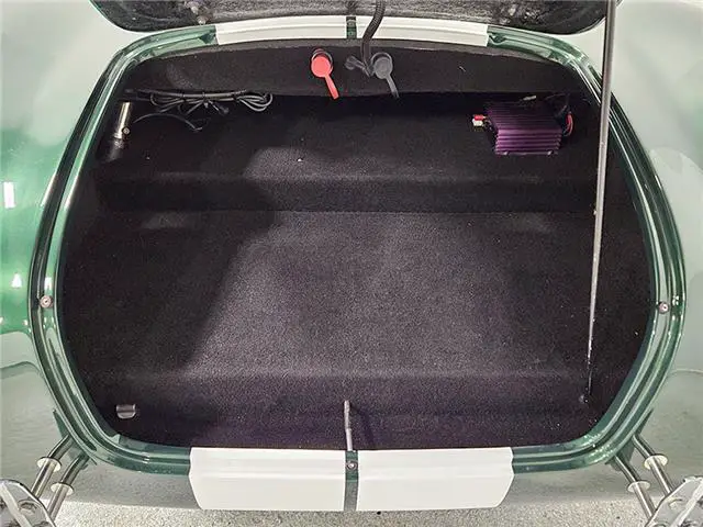 The interior shows that this Cobra was built for combat, eschewing the original low-back buckets in favor of modern high-back racing shells with 5-point Simpson racing harnesses. The rest is familiar Cobra, from the simple door pockets to the flat dash wrapped in vinyl and filled with Auto Meter dials. A wood-rimmed steering wheel is quite authentic-looking and the drilled aluminum pedals are just plain cool. You’ll note this car includes a correct forward-canted shifter for the Tremec 5-speed underneath, as well as a full switch panel to control the various functions like lights, fuel pump, and other vitals. It is wired for a stereo, but there is no head unit, so you could add that if you like, but we suspect that the side pipes provide all the stereo accompaniment you’d want. It’s a bit of climb over the deep bucket seat, and there’s a bit of wear on that high-traffic spot, but the rest is in excellent condition and shows minimal signs of use. Once you’re in there, the driving position is superb, the pedals are well-arranged, and the steering feels hard-wired into your cerebellum. The trunk is neatly finished with carpets and a pair of charging stubs, but there is no top—in a Cobra, what’s the point?