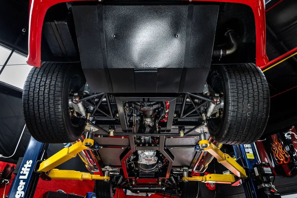 Under the forward-opening hood sits a Roush 427ci V8 Stroker Engine with a Holley Carburetor. Power is sent to the Road through a Tremec 5 Speed Manual Transmission and the Posi Traction 8.8 Rear End with 3.55:1 Gear Ratio! Additional features include, Power Steering, Serpentine Belt Setup, Roush Air Cleaner, Power Brakes, Electric Engine Fans, and Independent Suspension! The underside of this '65 looks brand new like the rest of the car! Take a look underneath to see the Low Mileage Condition of the Painted Frame, Removable Transmission Crossmember, Stainless Fuel Tank, and Explosion Proof Bell Housing.