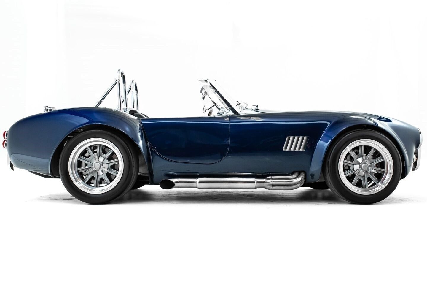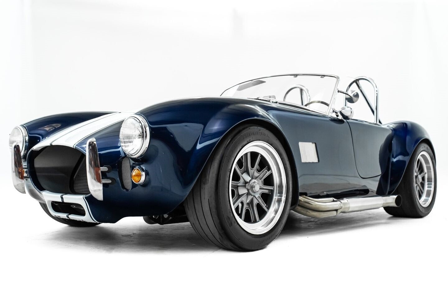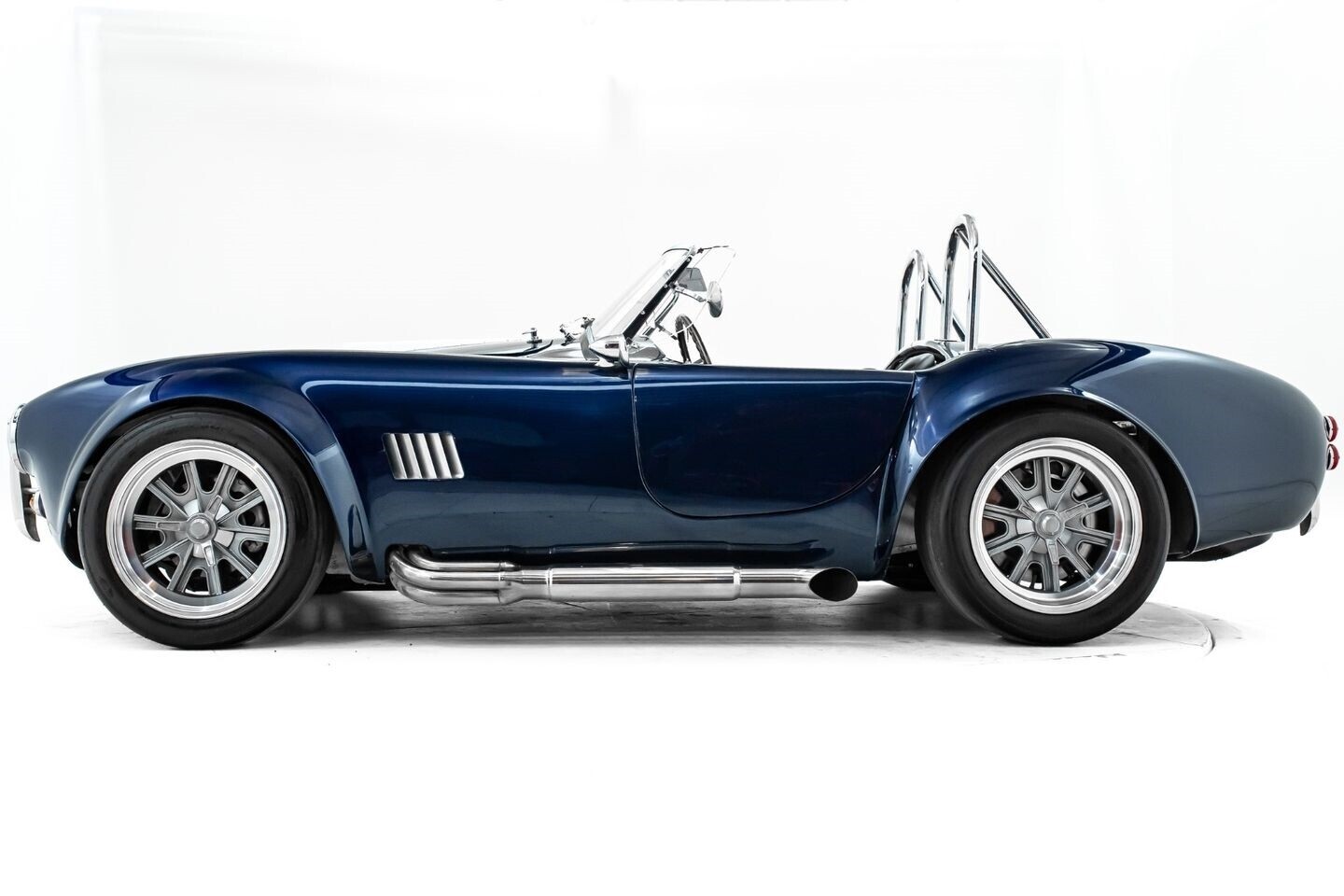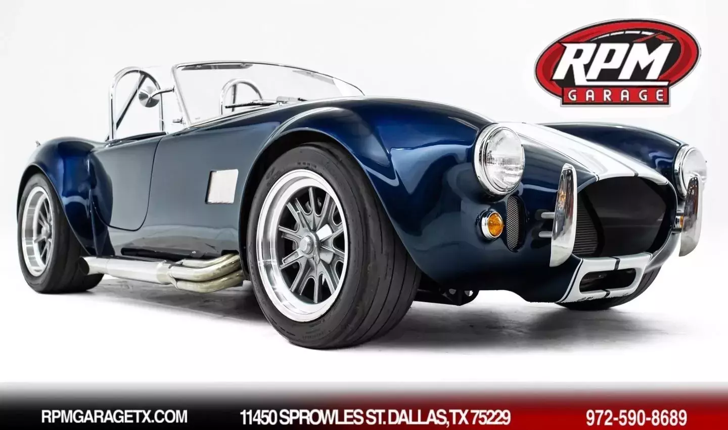 This 1965 Shelby Cobra replica, built by Factory Five, is a legendary American machine that needs no introduction. Under the hood is a Coyote 5.0-liter V8 engine that sends its tremendous output through a Tremec five-speed manual transmission to the rear wheels. This unique power plant is not as it left the factory, however, having received short-tube headers, a short-ram cold-air intake system, and a custom fuel pressure regulator system with a regulator-mounted gauge, among other modifications. This aggressive classic comes equipped with 17" Shelby 427 / Halibrand-style wheels and is finished in a custom deep blue paint scheme that beautifully contrasts against the white vinyl racing stripes running the length of the vehicle. In the interior, this Cobra offers leather bucket seats with Simpson harnesses, a wood-trimmed tri-spoke Factory Five steering wheel, a full AutoMeter ProComp Ultra-Lite gauge cluster, leather door straps, and a black leather shifter boot, truly making this classic the complete package.