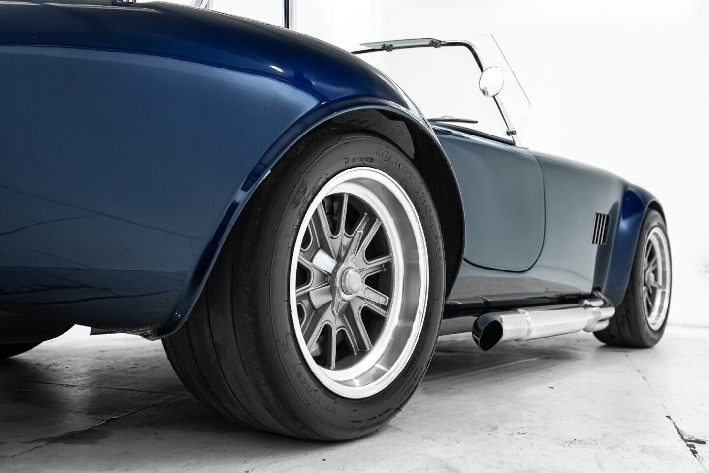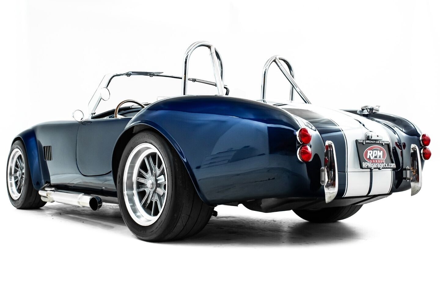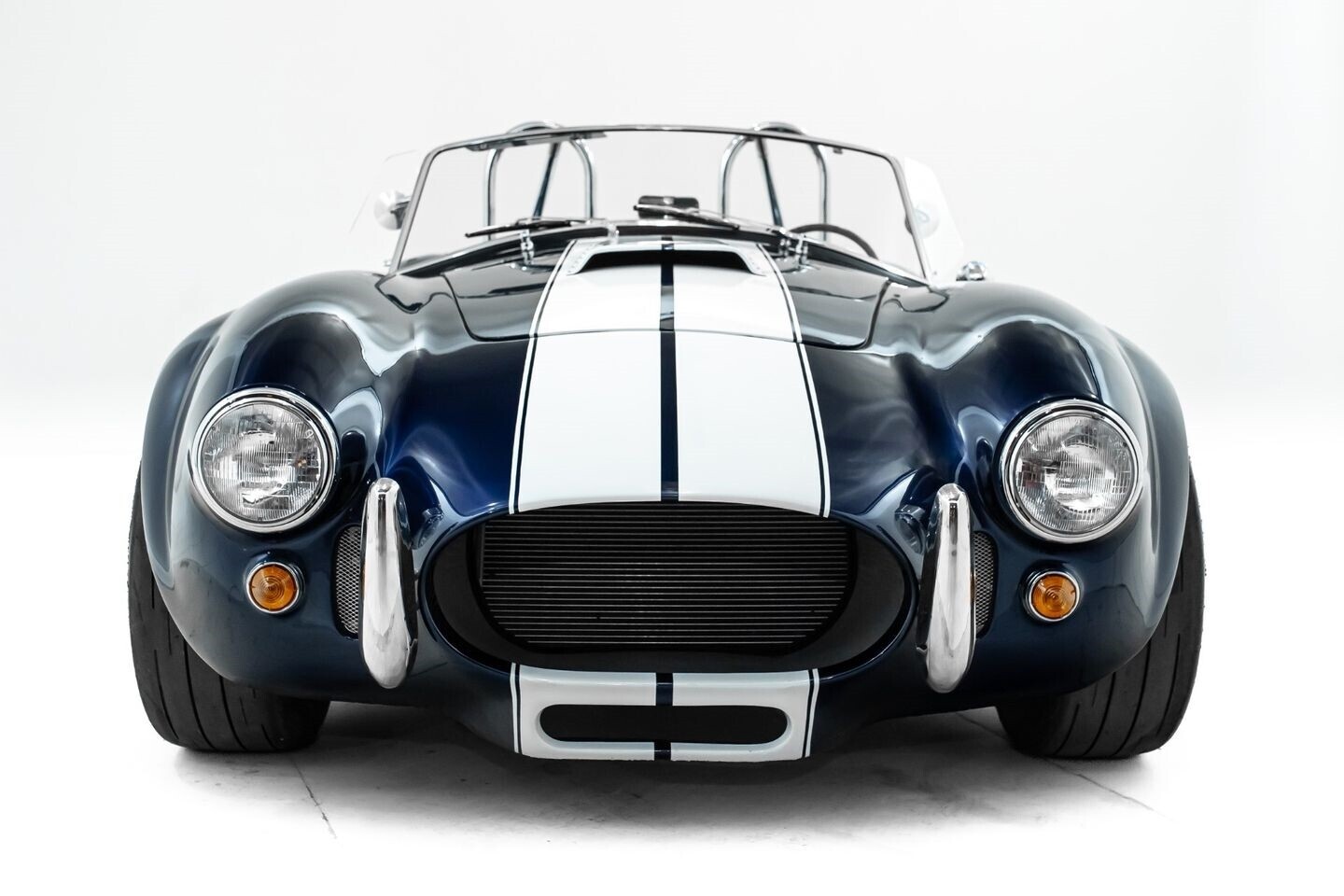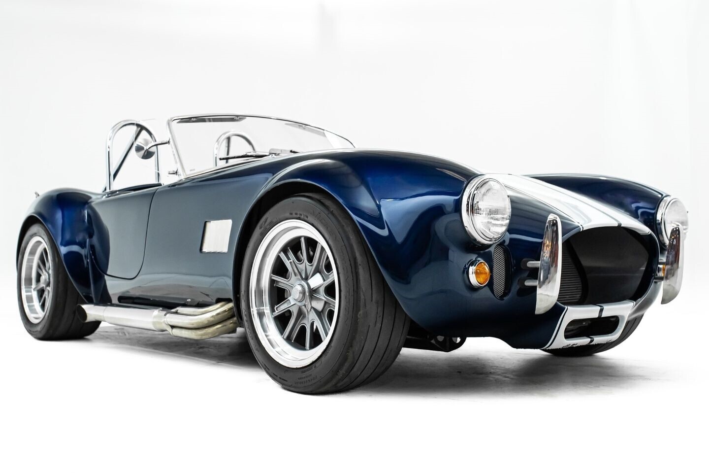 This 1965 Shelby Cobra replica, built by Factory Five, is a legendary American machine that needs no introduction. Under the hood is a Coyote 5.0-liter V8 engine that sends its tremendous output through a Tremec five-speed manual transmission to the rear wheels. This unique power plant is not as it left the factory, however, having received short-tube headers, a short-ram cold-air intake system, and a custom fuel pressure regulator system with a regulator-mounted gauge, among other modifications. This aggressive classic comes equipped with 17" Shelby 427 / Halibrand-style wheels and is finished in a custom deep blue paint scheme that beautifully contrasts against the white vinyl racing stripes running the length of the vehicle. In the interior, this Cobra offers leather bucket seats with Simpson harnesses, a wood-trimmed tri-spoke Factory Five steering wheel, a full AutoMeter ProComp Ultra-Lite gauge cluster, leather door straps, and a black leather shifter boot, truly making this classic the complete package.