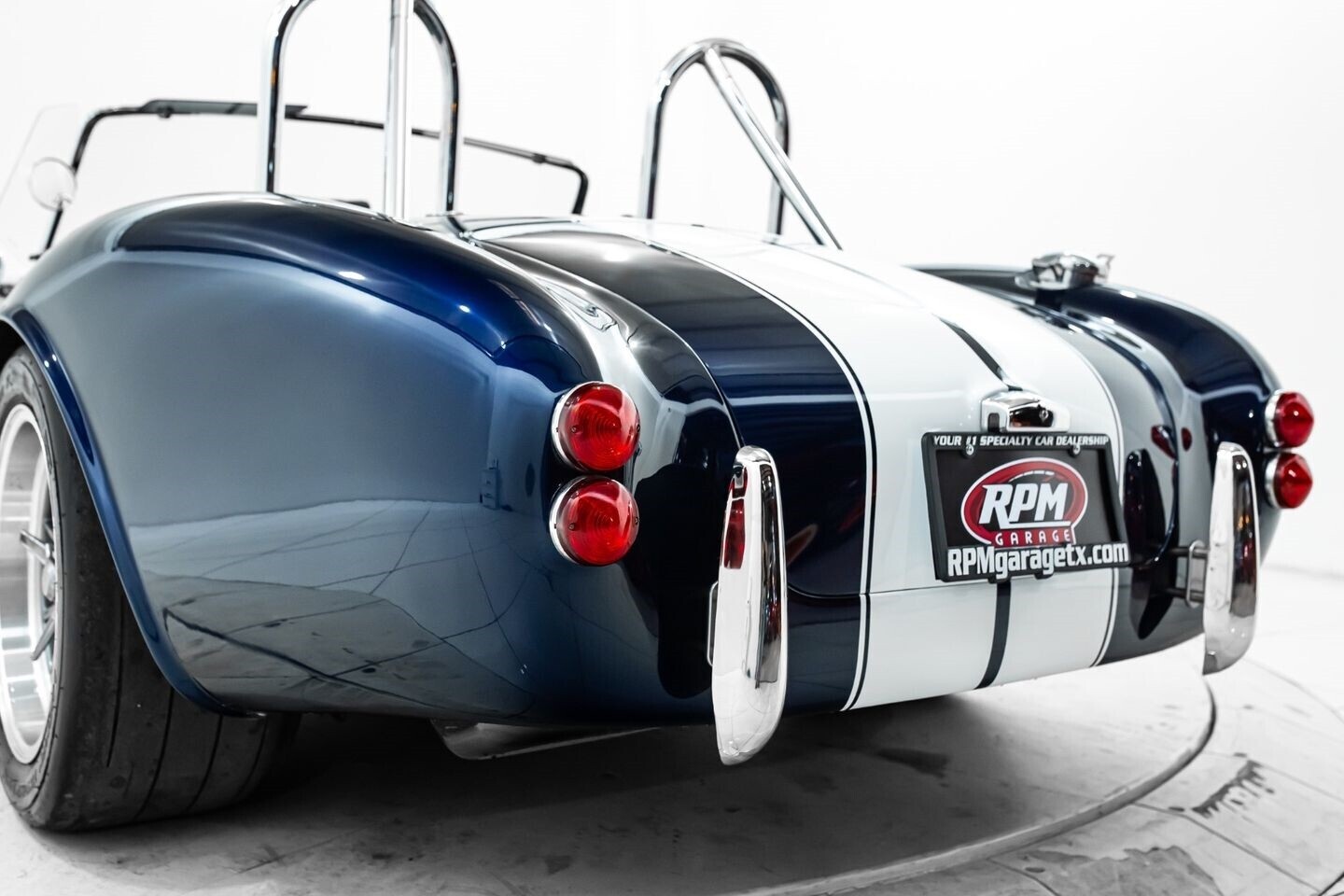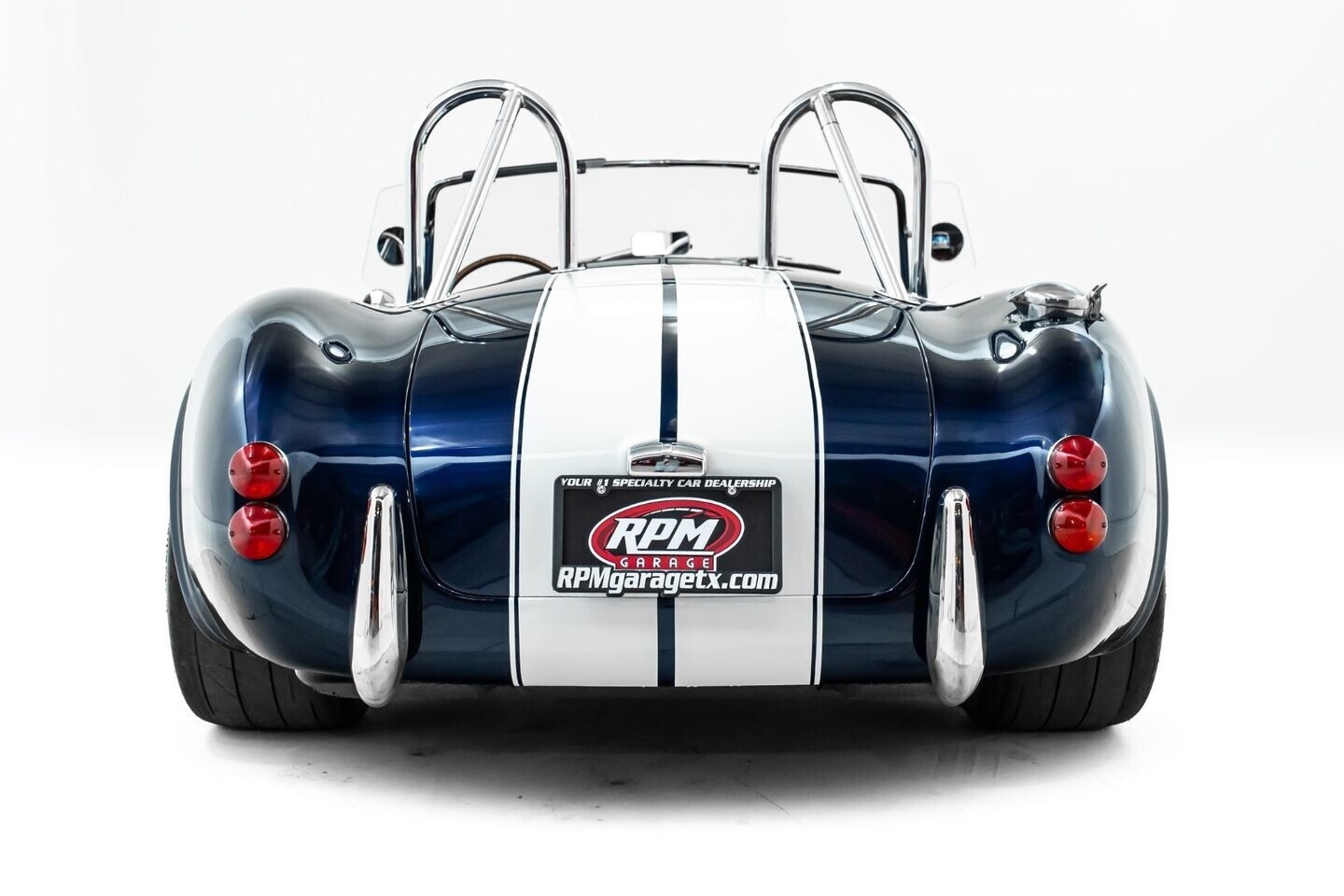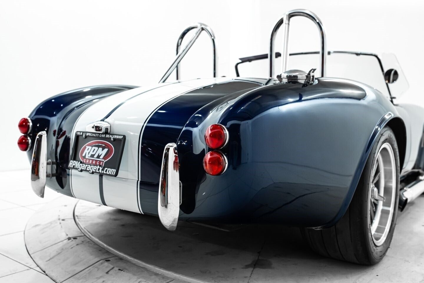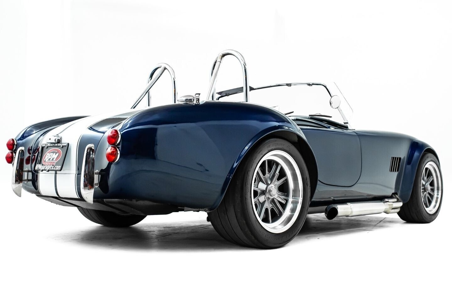 This 1965 Shelby Cobra replica, built by Factory Five, is a legendary American machine that needs no introduction. Under the hood is a Coyote 5.0-liter V8 engine that sends its tremendous output through a Tremec five-speed manual transmission to the rear wheels. This unique power plant is not as it left the factory, however, having received short-tube headers, a short-ram cold-air intake system, and a custom fuel pressure regulator system with a regulator-mounted gauge, among other modifications. This aggressive classic comes equipped with 17" Shelby 427 / Halibrand-style wheels and is finished in a custom deep blue paint scheme that beautifully contrasts against the white vinyl racing stripes running the length of the vehicle. In the interior, this Cobra offers leather bucket seats with Simpson harnesses, a wood-trimmed tri-spoke Factory Five steering wheel, a full AutoMeter ProComp Ultra-Lite gauge cluster, leather door straps, and a black leather shifter boot, truly making this classic the complete package.