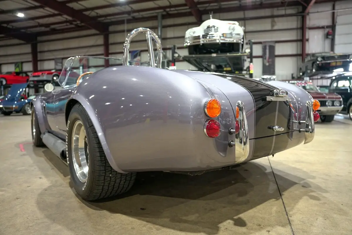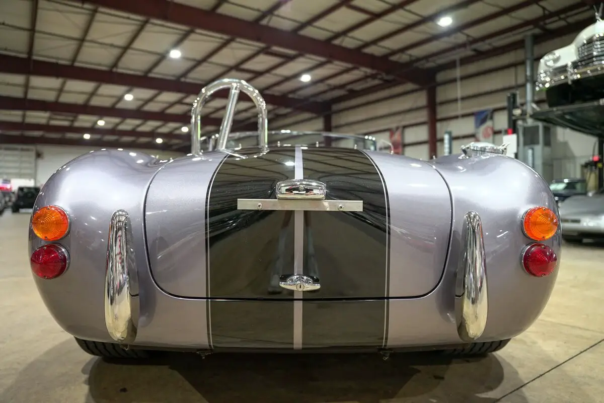 GR Auto Gallery is excited to present this stunning 1965 Shelby Cobra Replica, finished in Blade Silver Clearcoat with bold black racing stripes that stretch across its low-slung body. This Everett Morrison 427 S/C Cobra tribute captures the legendary curves and aggressive stance of the original with beautiful attention to detail. Chrome bumpers, knock-off wheels, and a single chrome roll bar complete the classic race-inspired look, while the wide fender flares and side exhaust hint at the serious power within.