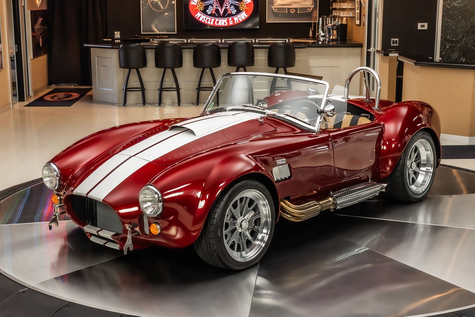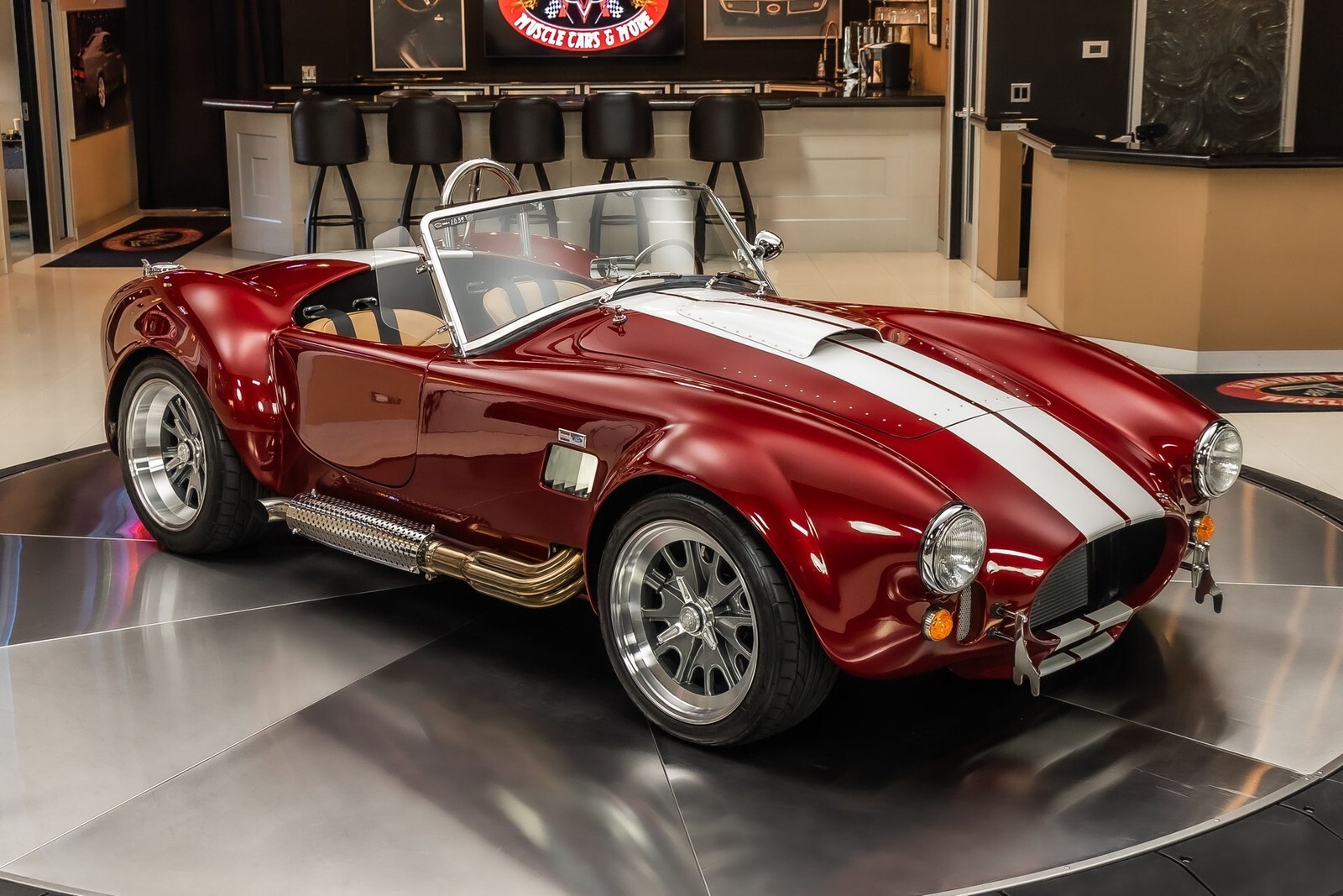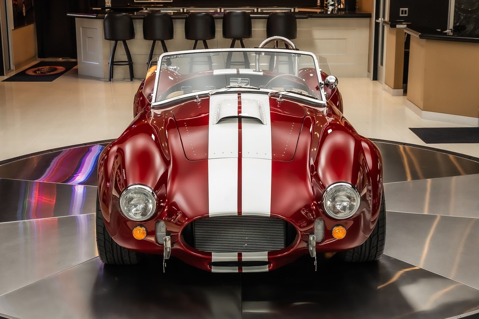 Check out this amazing Backdraft Racing 1965 Shelby Cobra! This Cobra is an RT4 build, and it has less than 2,000 Miles on it! Take a look at the glossy Maroon Exterior Paint with Metallic Silver Stripes, 18' Knock - Off Style Wheels, Scooped Hood, Front Fender Vents, Driver Side Chrome Roll Bar, Quick-Jack Bumpers, LeMans Style Fuel Fill and the Polished Stainless Steel Side Pipes. Inside, this roadster is sporting a Tan Leather Interior, Bucket Seating, 3 - Spoke Wood Steering Wheel, 4 Point Racing Harness, Dropped Foot Box and ample room in the fully Carpeted Trunk for all of your car show essentials!